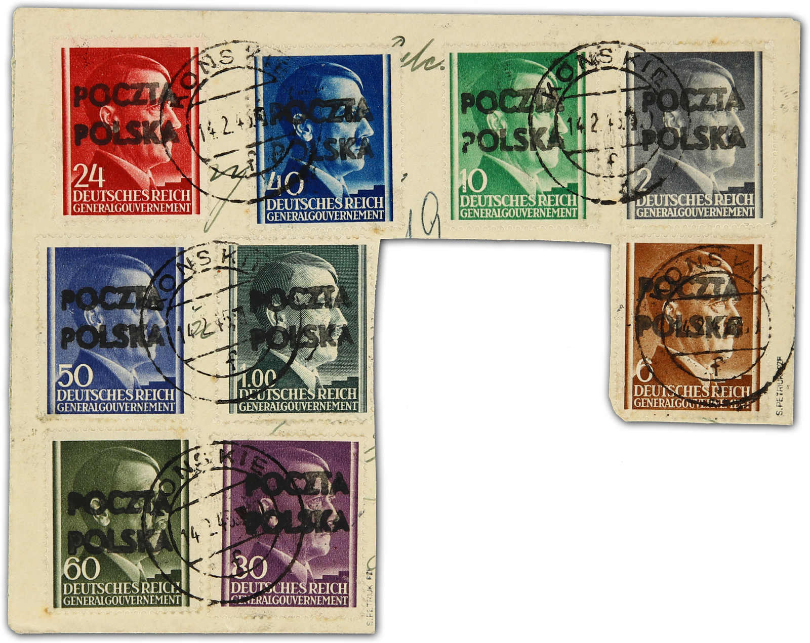1945, 2 Gr. bis 1 Zl. Marken des Gen.-Gouv. auf unregelmäßigem Briefstück, mit schwarzem Handstempelaufdruck "POCZTA POLSKA", übergehend gest. "KONSKIE 14. 2. 45", farbfrisch und gut gezähnt, sign. Petriuk BPP, einwandfrei (Fischer ca.