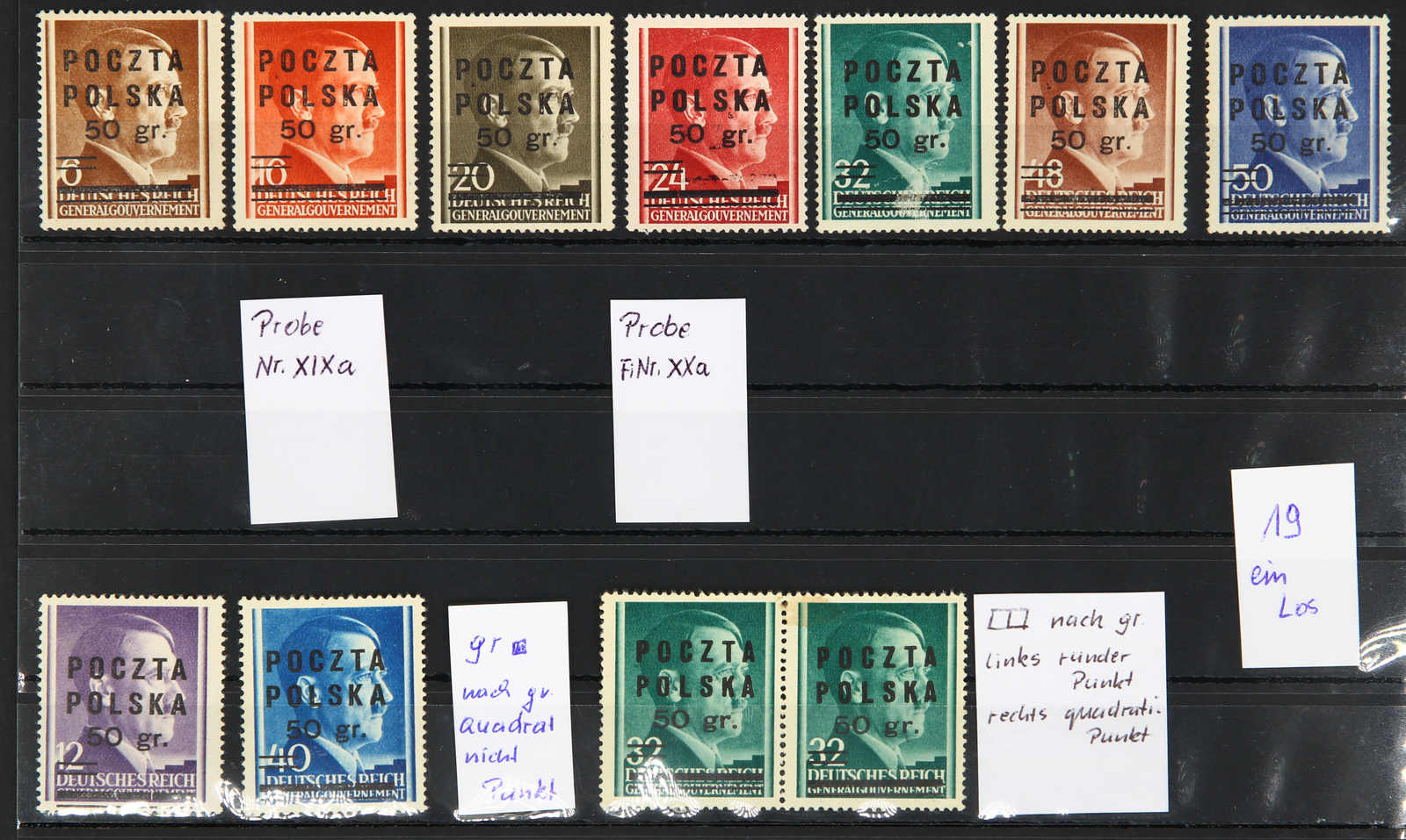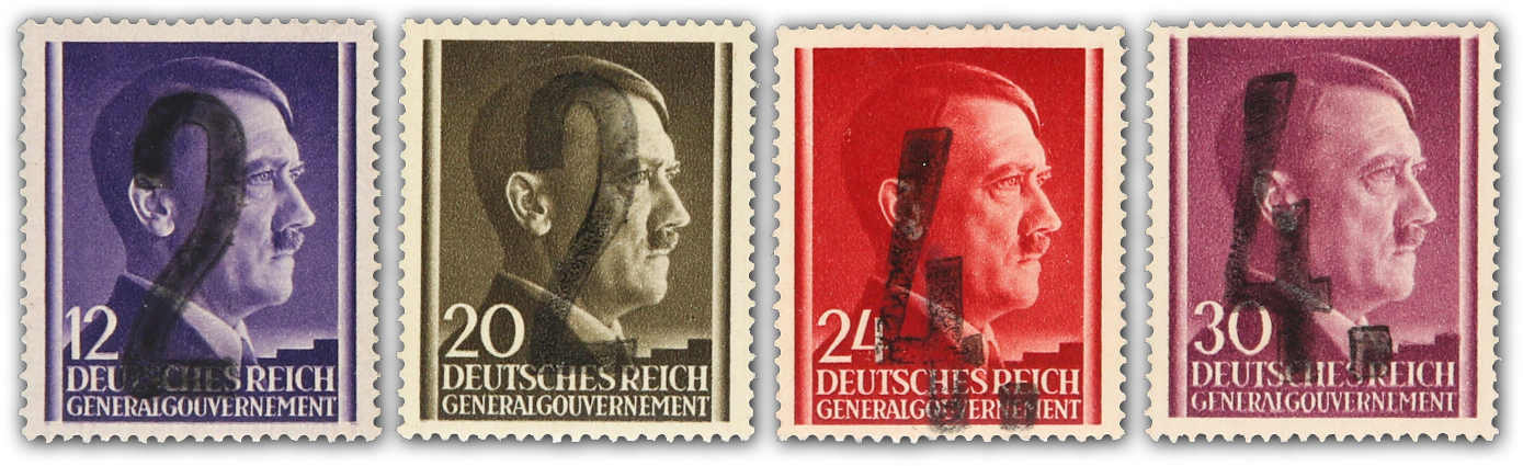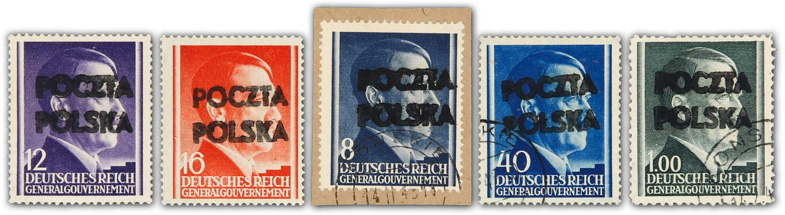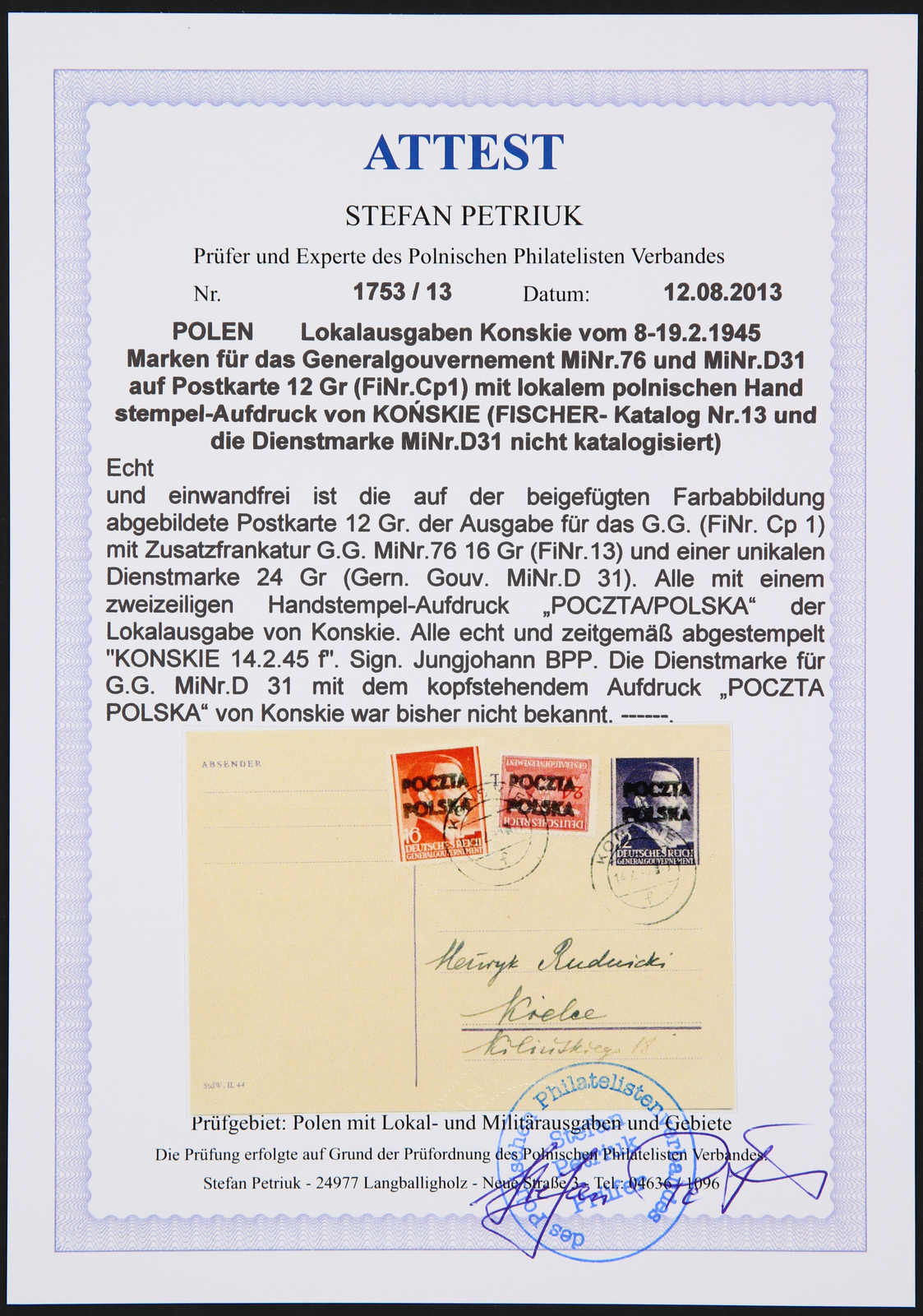 1945, 12 und 16 Gr. postfrisch sowie 8 und 40 Gr. sowie 1 Zl. gestempelt KONSKIE 14.2.45, Marken des Generalgouvernements mit Handstempelaufdruck "POCZTA POLSKA“ (zusammen FiPr. 3.580 Zl.), sign. Jungjohann BPP, M. Perzynski oder Petriuk