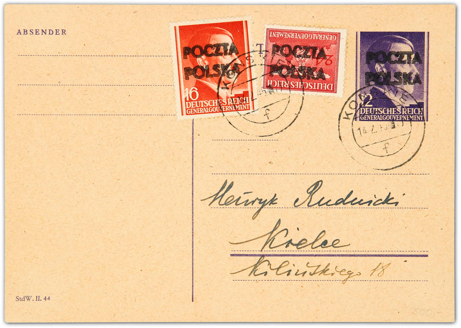 katalogisierten zweizeiligen kopfstehenden Handstempel-Aufdruck "POCZTA/POLSKA" der Lokalausgabe von Konskie auf philatelistischer Ganzsachen-Fernpostkarte mit dem gleichen Aufdruck, aufgegeben "KONSKIE 14.2.45 f", einwandfrei. Die Dienstmarke