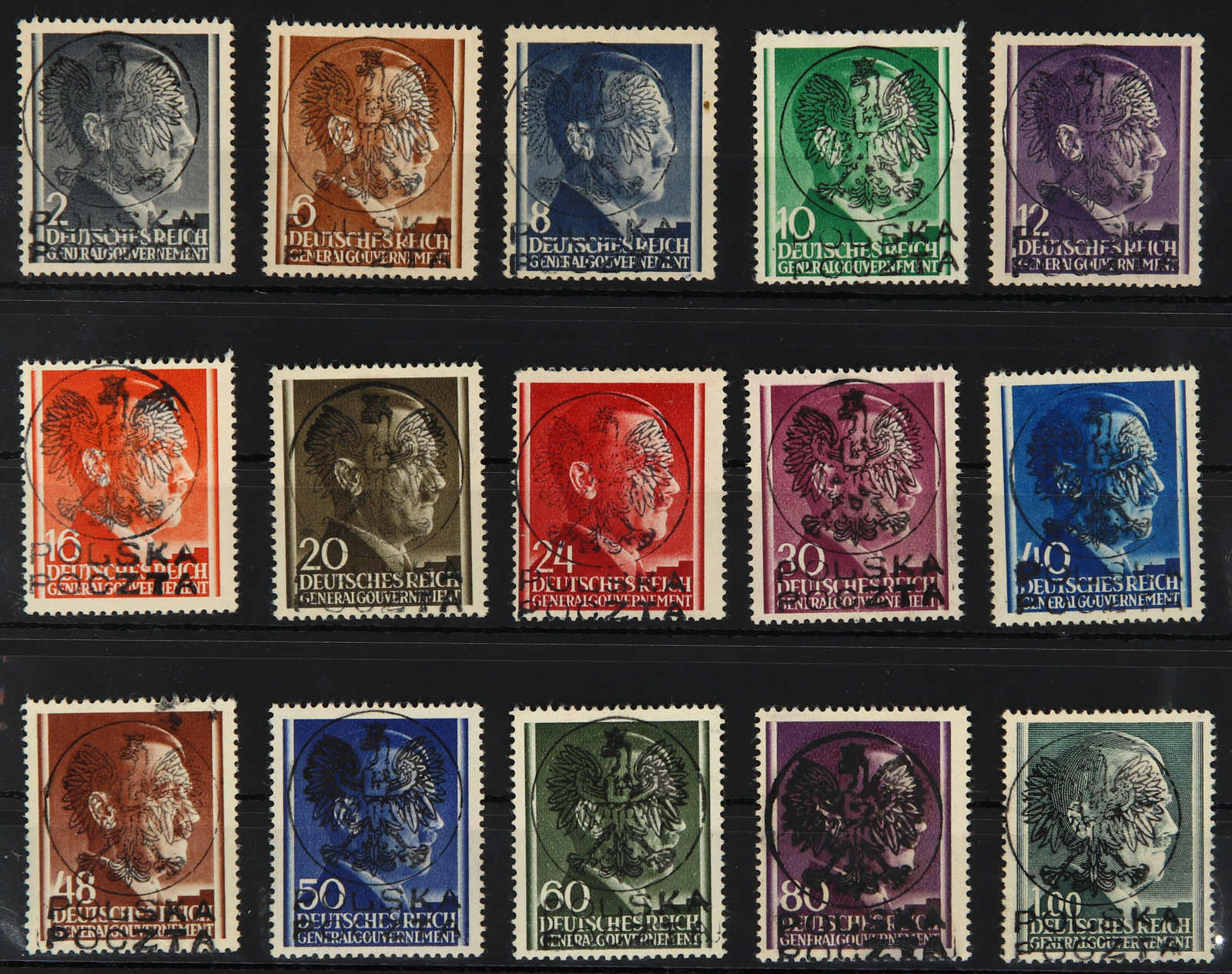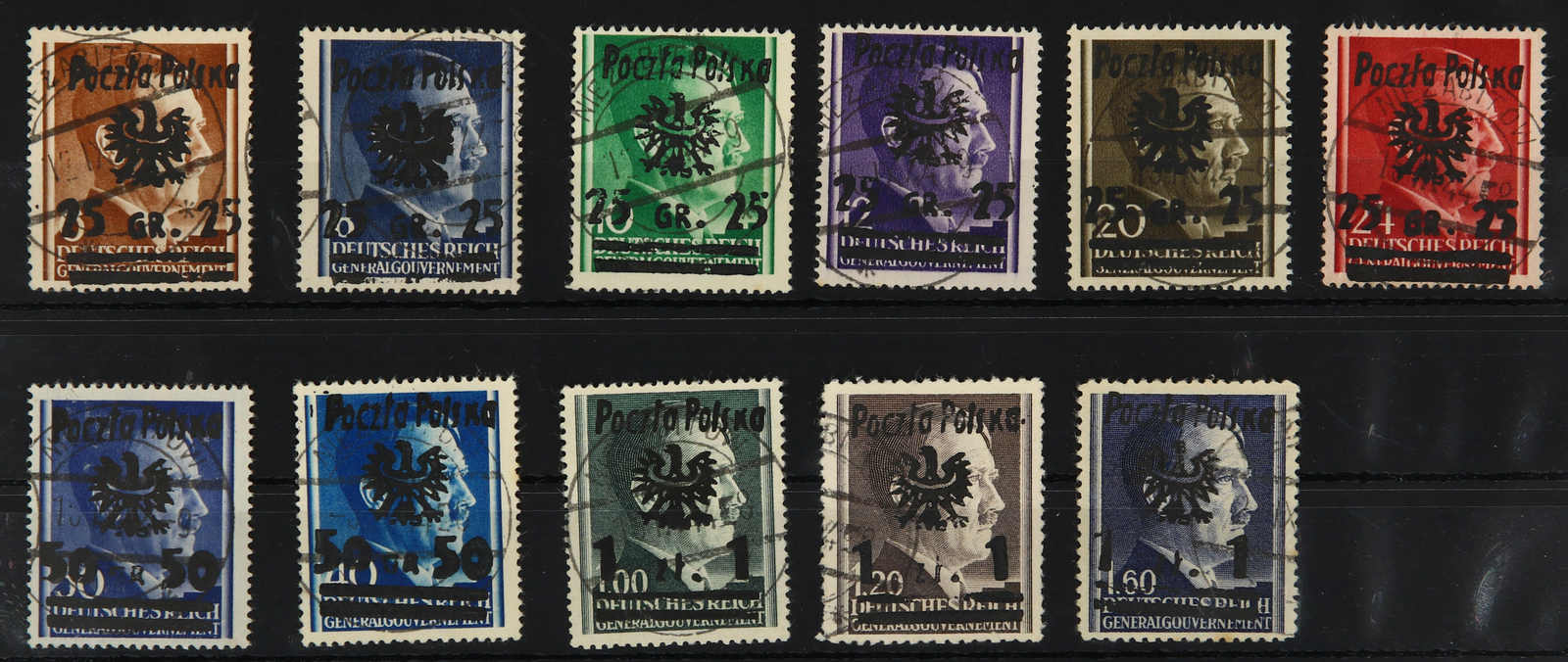 1944, Marken der Ausgabe für das Generalgouvernement 6, 8, 10, 12, 20, 24, 30, 40, 60 Gr (Auflage 18 Stück) und 80 Gr (Auflage 22 Stück), dazu 1.00, 1.20 und 1.60 zl, alle Marken gestempelt mit gleichlautendem Stempel LEZAJSK 15.12.44,