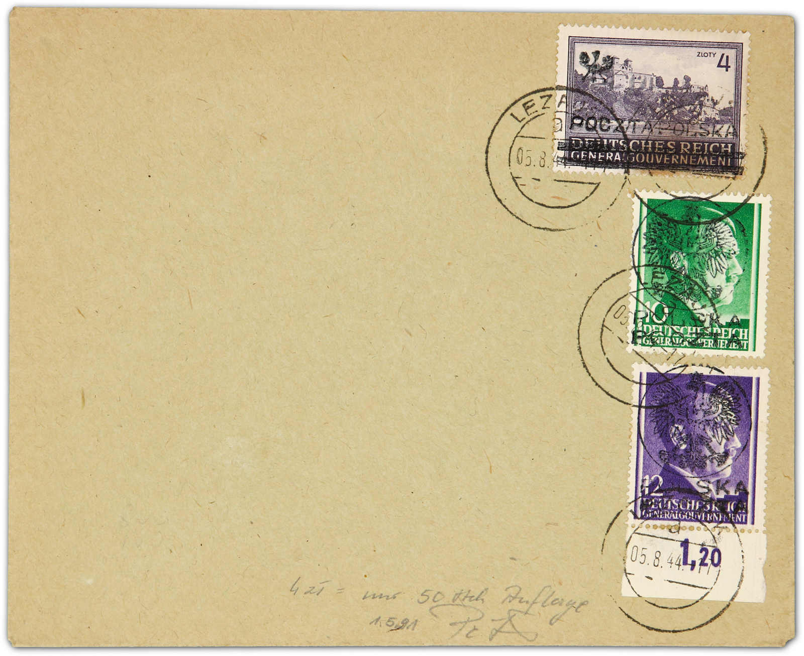 50 Stück). Marken befinden sich auf einem Briefumschlag und sind abgestempelt mit einem umgearbeiteten deutschen Stempel LEZAJSK a 05.8.44. Die 4 Zloty ist im Fischer gestempelt mit 3.800 Zl. bewertet, sign. Petriuk BPP (Image)