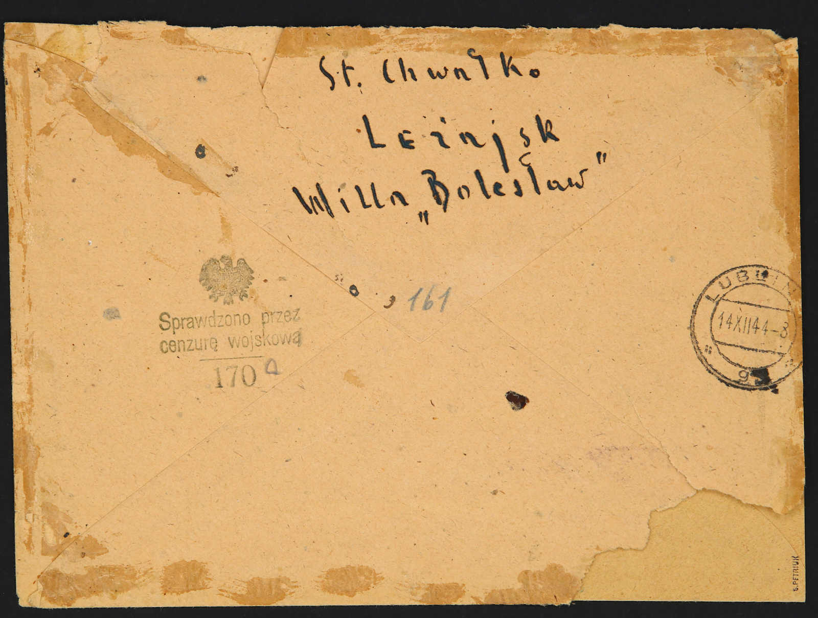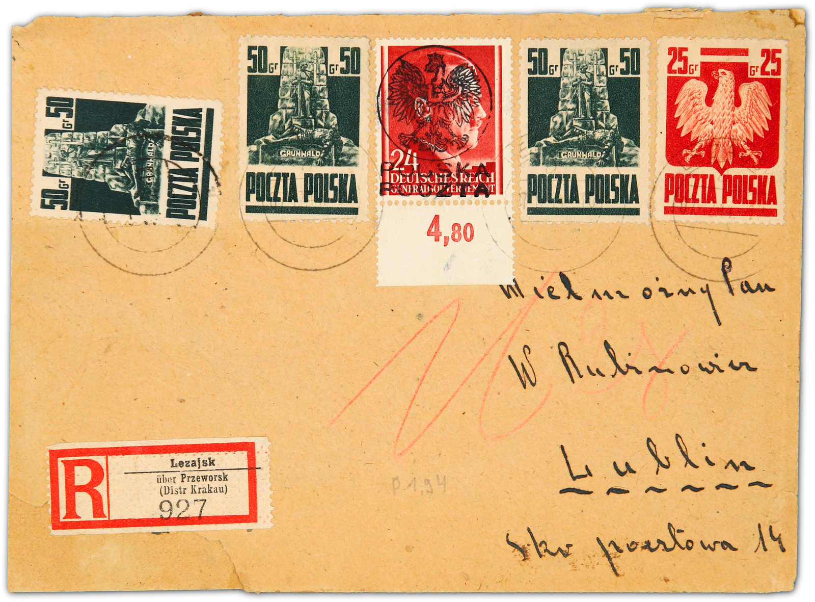 1945, philatelistischer R-Brief mit deutschem R-Zettel und gestempelt mit umgearbeitetem deutschen Stempel von LEZAJSK 7.12.44, dazu ein polnischer Militärzensurstempel sowie Ankunftsstempel von LUBLIN vom 14.XII.1944, frankiert mit poln.