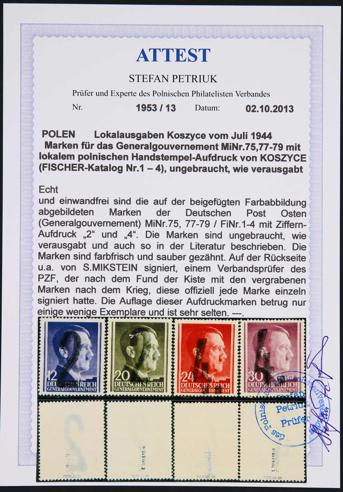 (Gen.-Gouv. MiNr. D 31/ FiNr. U 31) mit dem kopfstehendem Aufdruck war bisher nicht bekannt. Die Dienstmarke ohne den kopfstehendem Aufdruck im Fischer bereits mit 5.000 Zl. bewertet. sign. Jungjohann BPP, Attest Petriuk PZF (Image) (imagea)