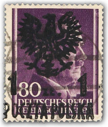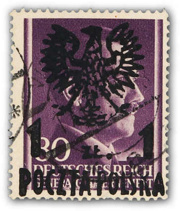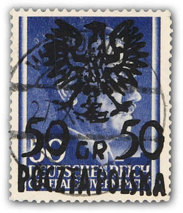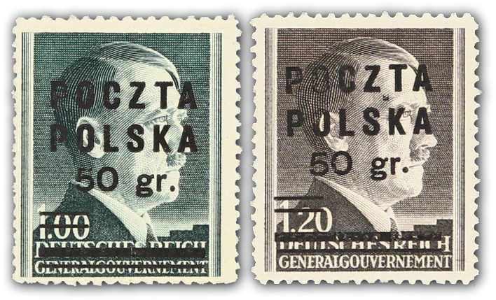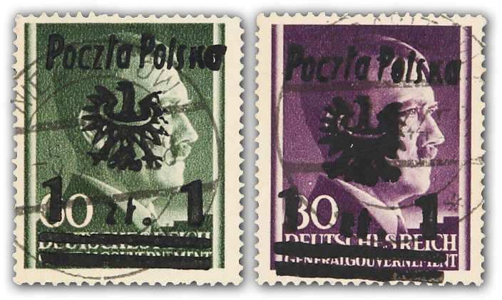1945, Marken der Ausgabe für das Generalgouvernement 10 und 12 Gr. Hitler mit schwarzem zweizeiligen Aufdruck "Adler im Kreis und POCZTA POLSKA" sowie 4 Zloty mit Handstempelaufdruck "Adler ohne Krone, POCZTA POLSKA, zwei Balken" (Auflage