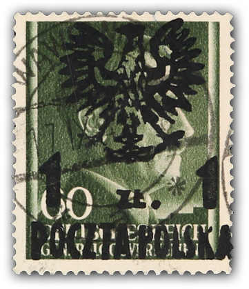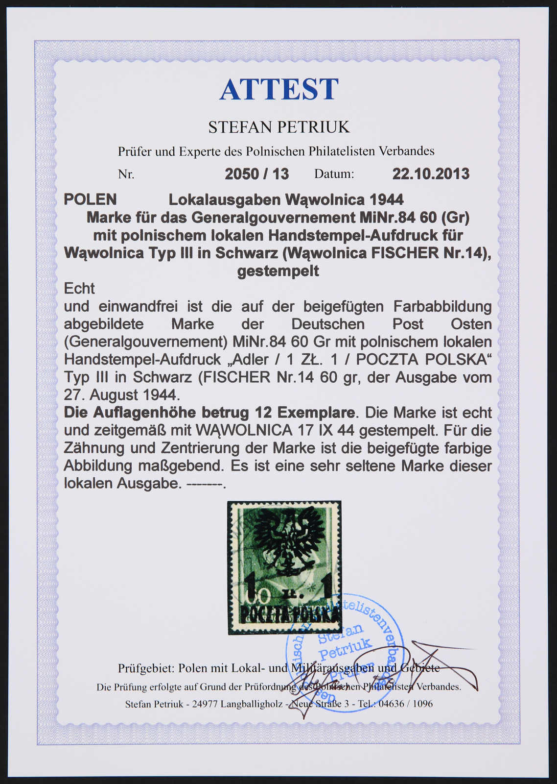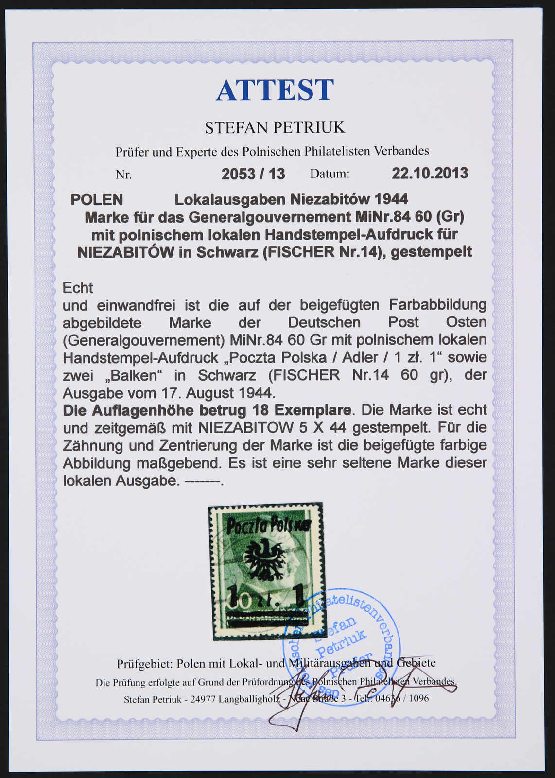 1944, Generalgouverment-Marke Mi-Nr. 84 (Fischer Nr. 14) 1 zl auf 60 gr mit Aufdruck Typ III, gestempelt und sauber gezähnt, die lokale Marke hatte nur eine Auflage von 12 Exemplaren, eine sehr seltene lokale Aufdruckmarke, im Michel ohne