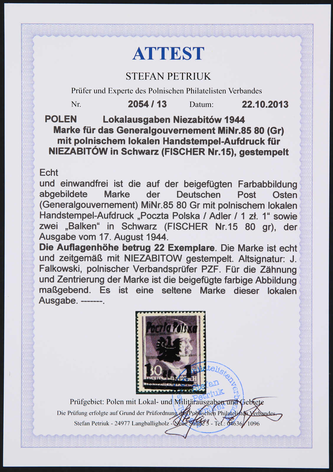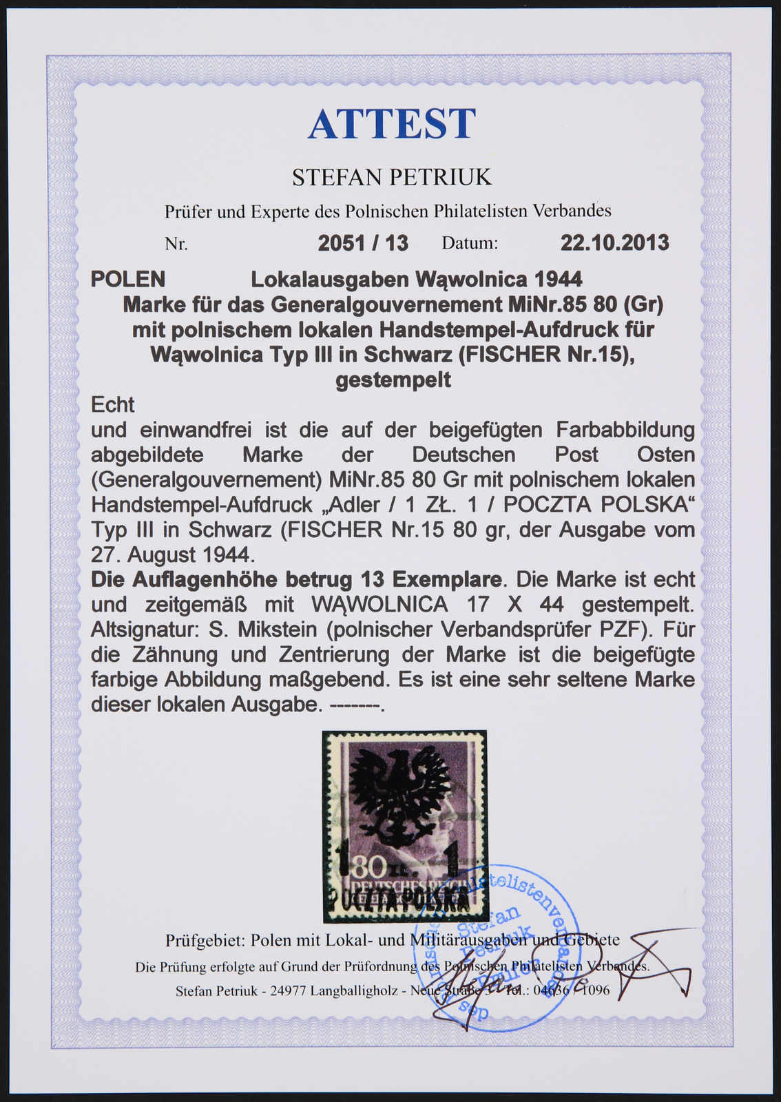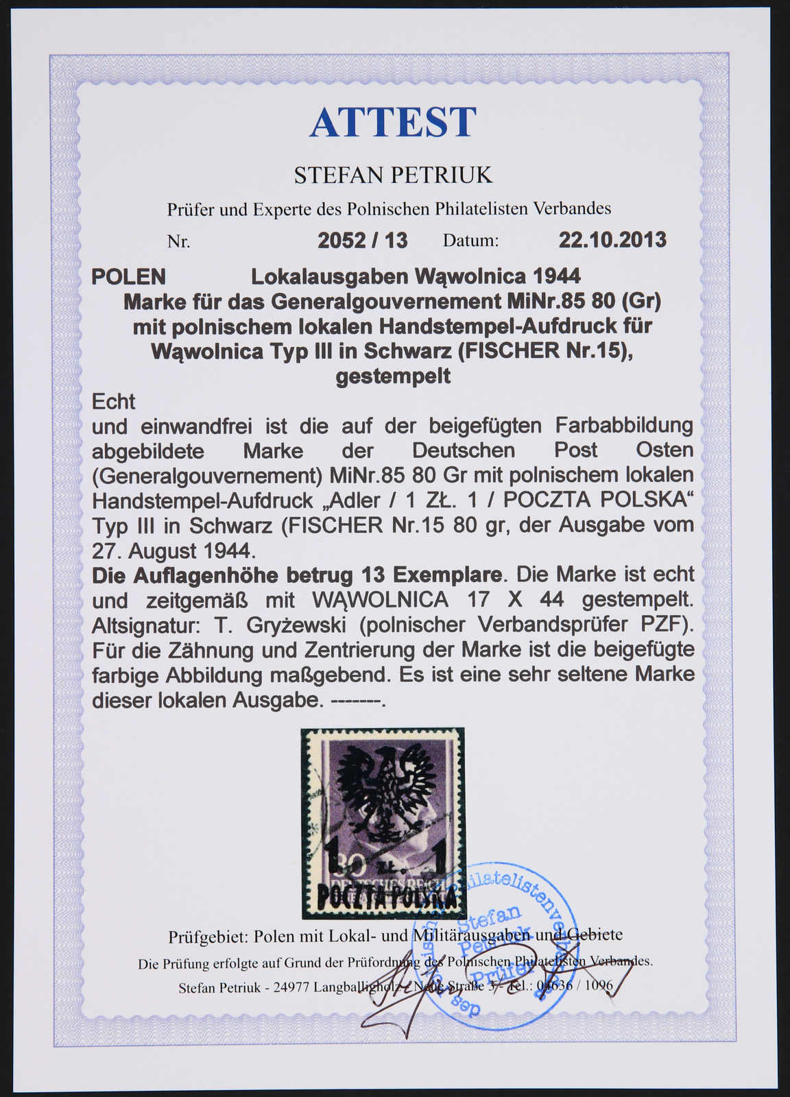 1944, Generalgouvernement-Marke Mi-Nr. 85 (Fischer Nr. 15) 1 zl auf 80 gr mit Aufdruck Typ III, gestempelt und sauber gezähnt, die lokale Marke hatte nur eine Auflage von 13 Exemplaren, eine sehr seltene lokale Aufdruckmarke, im Michel