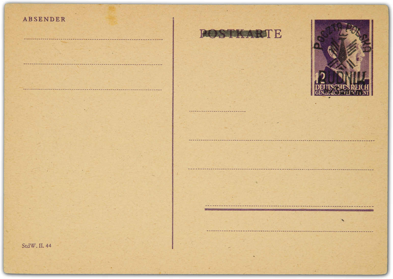 1944, 12 Gr. Ganzsachenpostkarte des Generalgouvernements mit dem Aufdruck in Type III und durchbalkte "POSTKARTE", ungebraucht, gute Qualität, sign. Jungjohann BPP (Image)