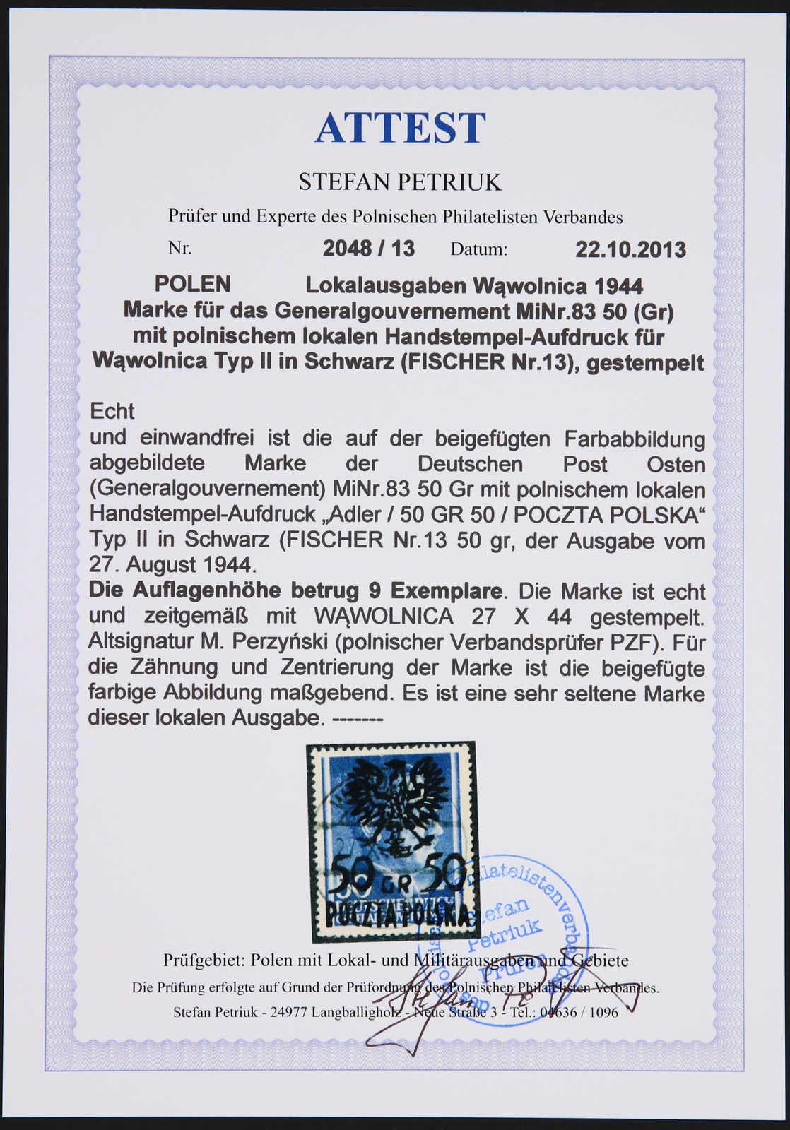 1944, Generalgouvernement-Marke Mi-Nr.83 (Fischer Nr. 13) 50 auf 50 Gr mit Aufdruck Typ II, gestempelt, sauber gezähnt. Die lokale Marke hatte nur eine Auflage von 9 Exemplaren, eine sehr seltene lokale Aufdruckmarke, im Michel ohne