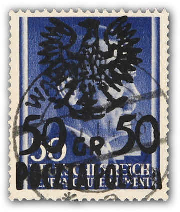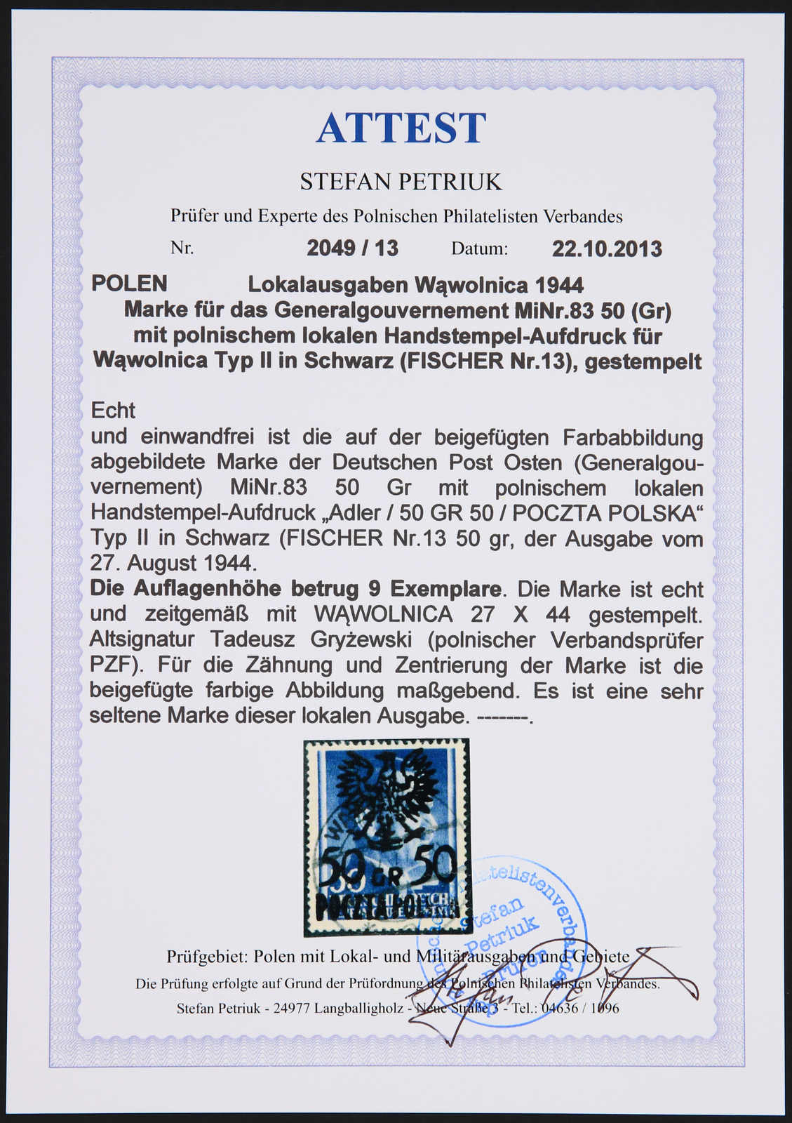 1944, Generalgouvernement-Marke Mi-Nr. 83 (Fischer Nr. 13) 50 auf 50 gr mit Aufdruck Typ II, gestempelt, sauber gezähnt, die lokale Marke hatte nur eine Auflage von 9 Exemplaren, eine sehr seltene lokale Aufdruckmarke. Im Michel ohne