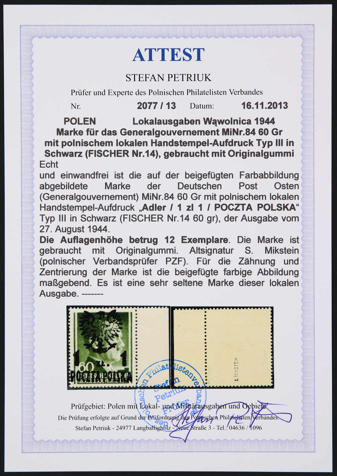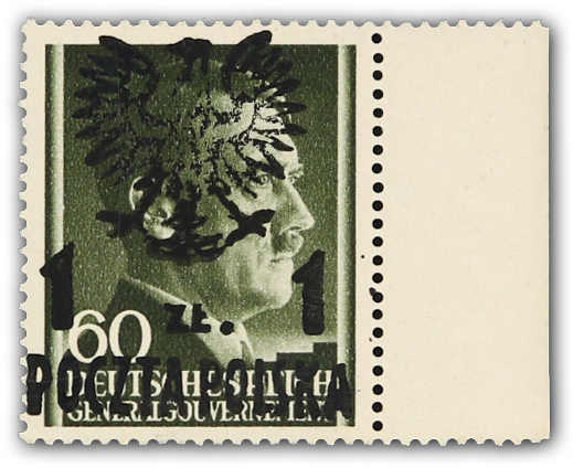 1944, Generalgouvernement-Marke Mi-Nr.84 (Fischer Nr.14) 1 zl auf 60 gr mit Aufdruck Typ III, postfrisch und sauber gezähnt. Die lokale Marke hatte nur eine Auflage von 12 Exemplaren, eine sehr seltene lokale Aufdruckmarke, im Michel ohne