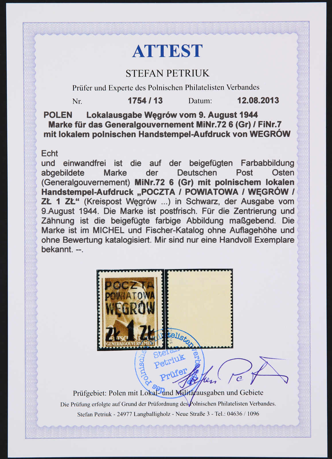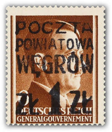 1944, Generalgouvernement-Marke Mi-Nr. 72 (Fischer Nr. 7) 1 zl auf 6 gr mit Aufdruck "POCZTA POWIATOWA WEGROW ZL 1 ZL" (deutsch: Kreispost Wegrow), Aufdruck ohne Rahmen, postfrisch und sauber gezähnt, eine sehr seltene lokale