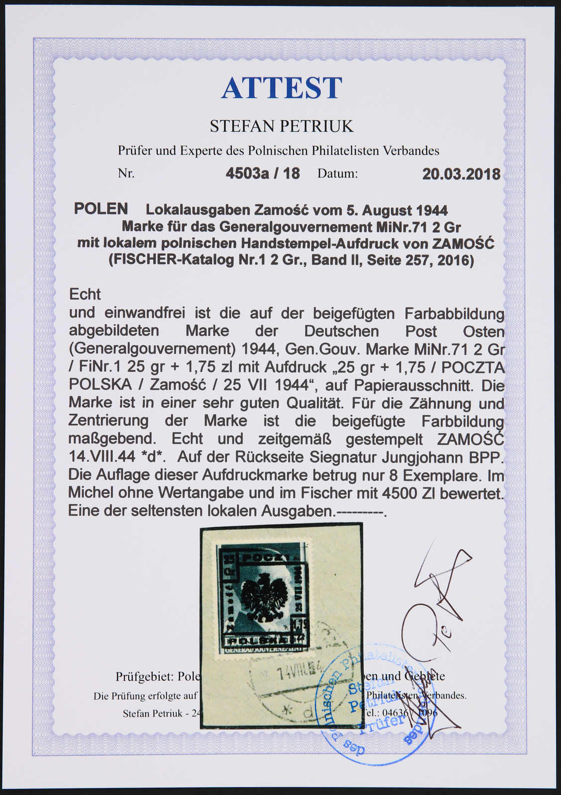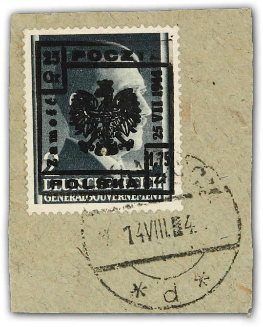 1944, Geneneralgouvernement-Marke Mi-Nr. 71 (Fischer Nr. 1) 25 gr + 1,75 zl mit Aufdruck "POCZTA POLSKA Zamosc 25 VII 1944", sauber gezähnt, auf Papierausschnitt, gestempelt "ZAMOSC 14.VIII.44 *d*", die Auflage dieser Aufdruckmarke betrug