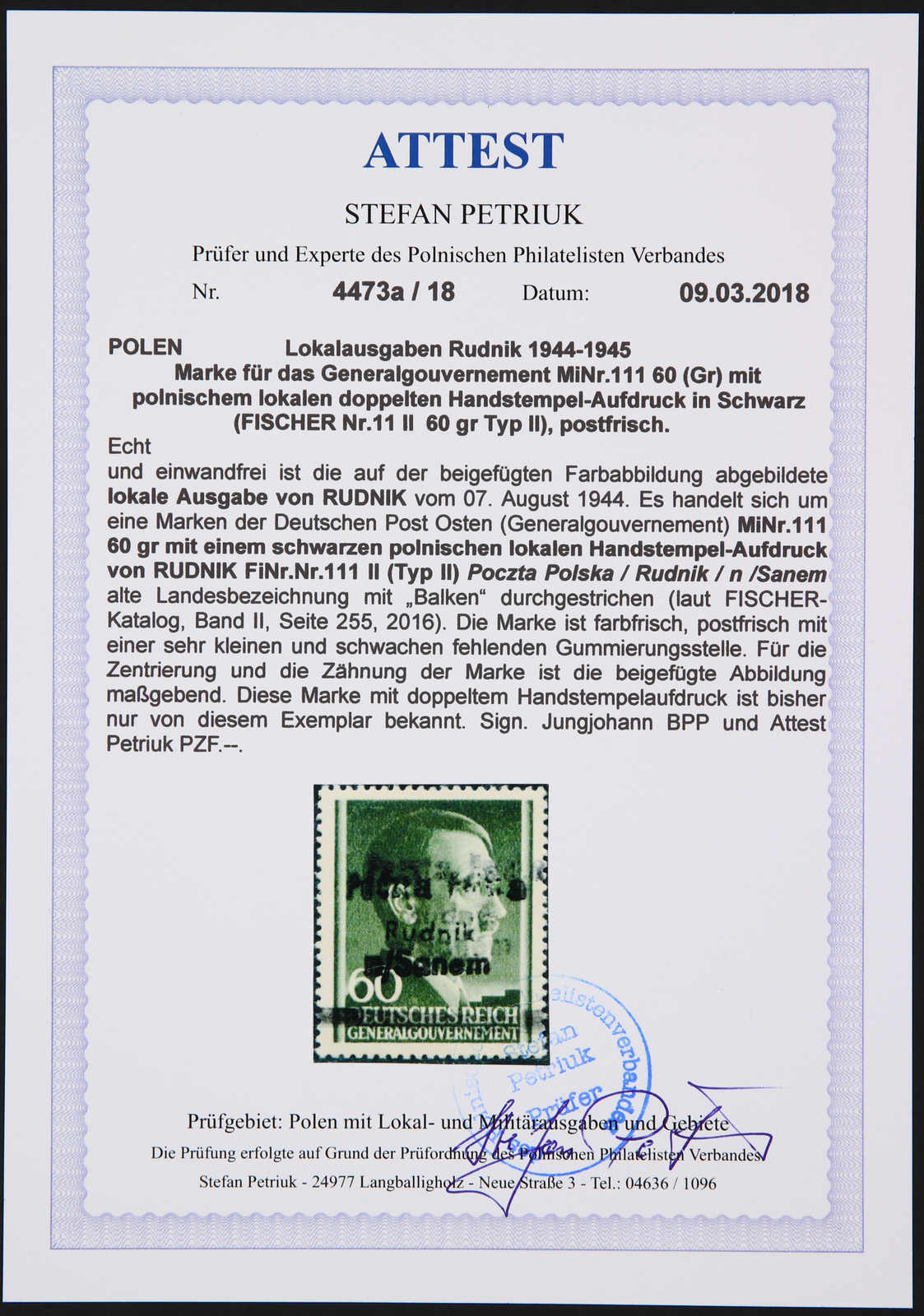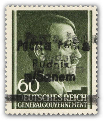 1945, 60 Gr. grauoliv. Marke des Generalgouvernements Mi-Nr. 111 mit doppeltem Handstempelaufdruck in Schwarz Typ II "Poczta Polska/Rudnik/n/Sanem" und Balken durch alten Landesnamen, die Marke ist postfrisch mit einer sehr kleinen und