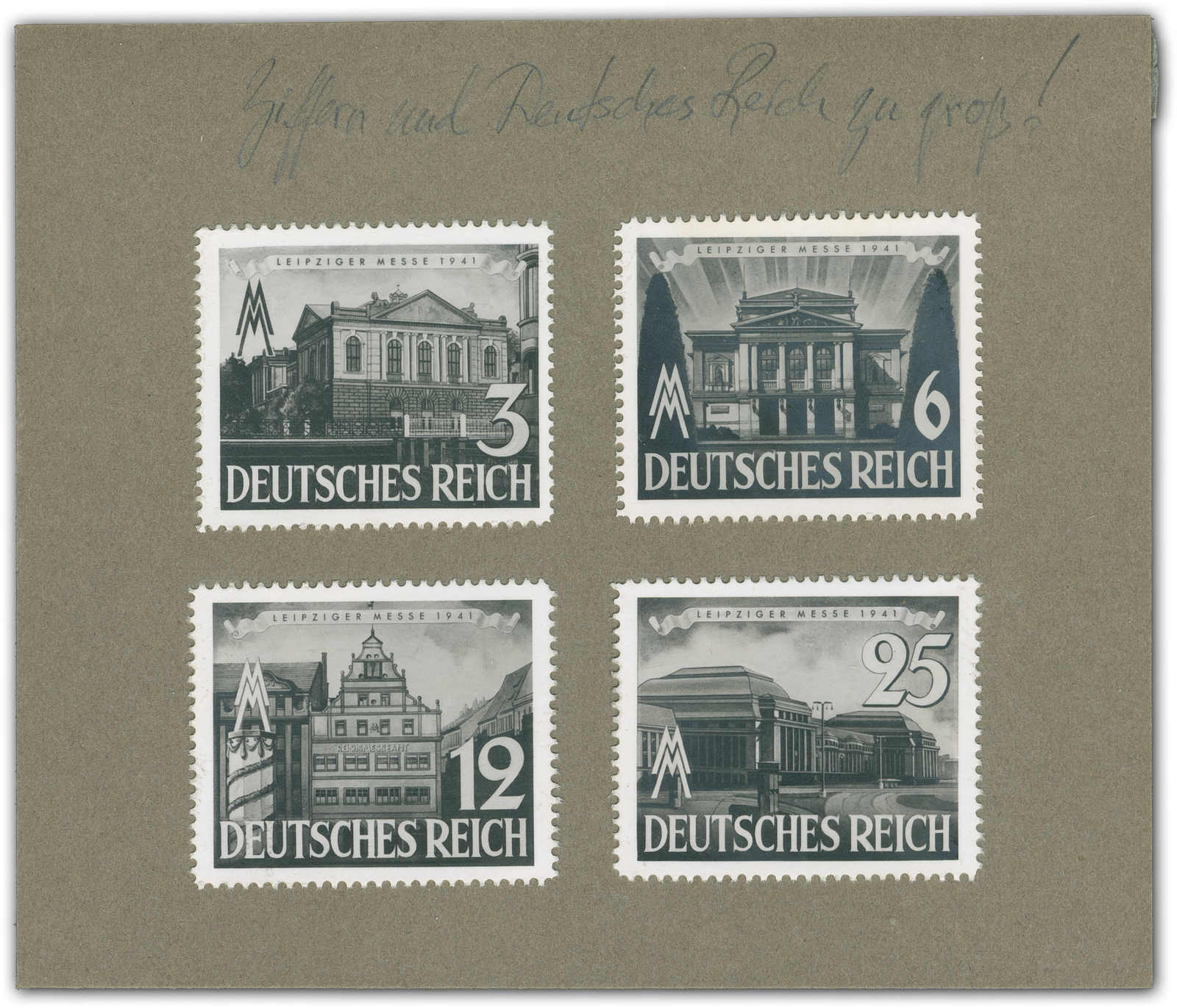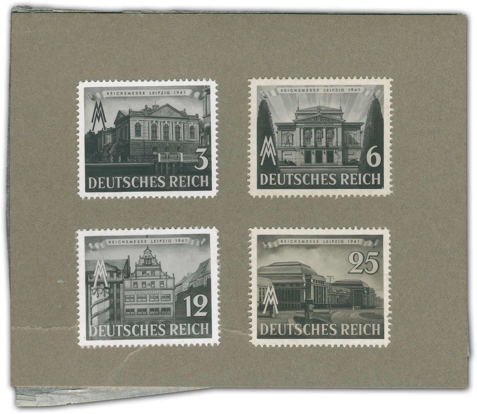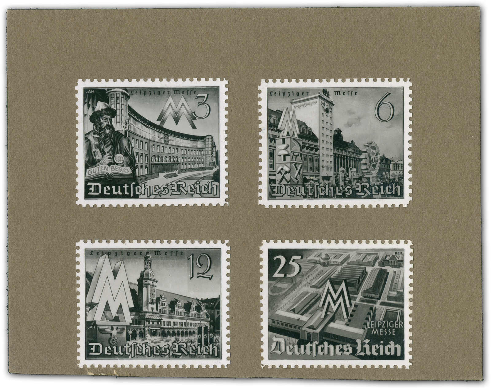 LEIPZIG FAIR 1941 Four photo essays mounted on carton. The motifs correspond to those of the later issued series but not to the indications of the values and the inscriptions DEUTSCHES REICH. (Image)