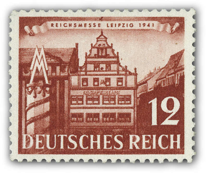 LEIPZIG FAIR 1941 Proofs of the 3, 6, 12 an 25 (Rpf) stamp showing the colour shade which was used for the issues. Single prints with so-called “proof-perforation“. The complete set of four stamps in original colours is unique. It is the