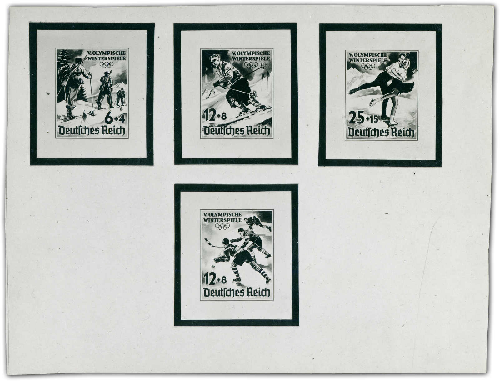 OLYMPIC WINTER GAMES It was already in 1938 that the Ministry for Propaganda had informed “organized artists“ that they should submit drafts for commemorative stamps honoring the Olympic Games of 1940 which were then cancelled due to