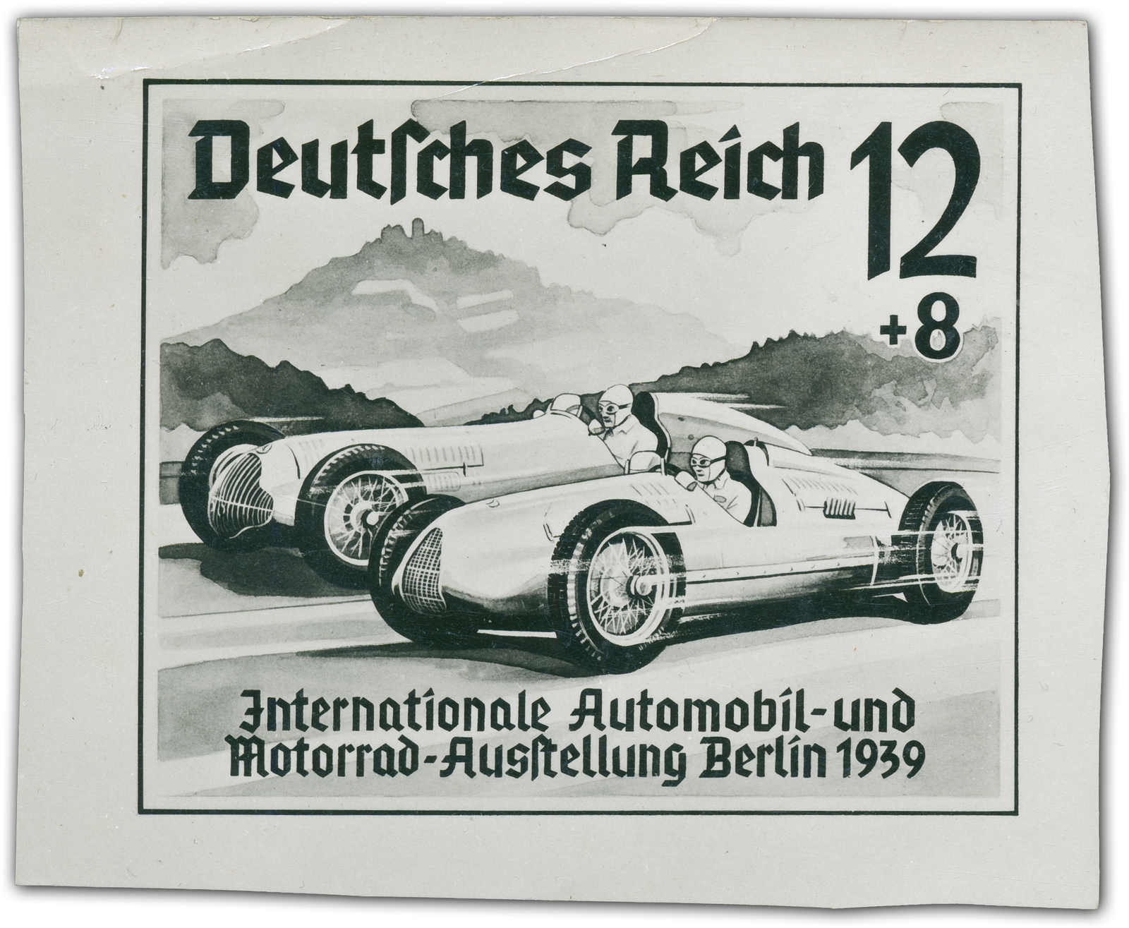 International Exhibition of Cars and Motorbikes Berlin 1939 Erich Meerwald had designed the motifs commemorating the 1939 International Exhibition of Cars and Motorbikes. According to his final drawing the photo essay of the 12+8 (Rpf)