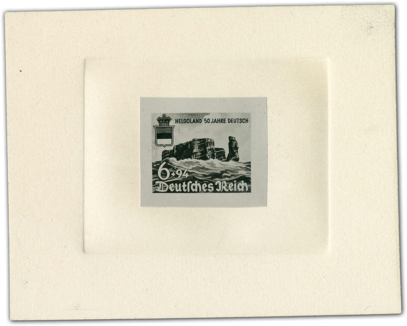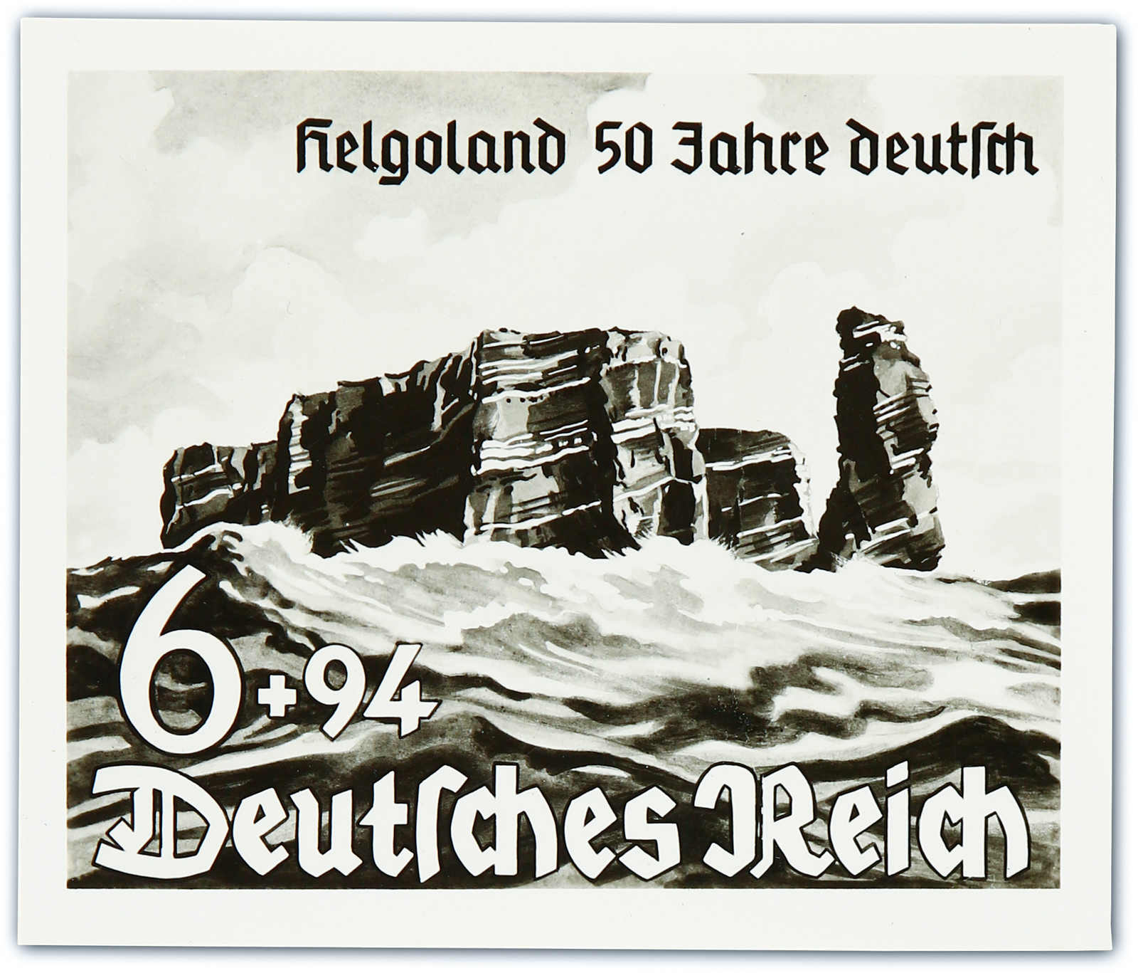 1940 HELIGOLAND - 50 years anniversary of German possession This photo essay depicting the first draft of Erich Meerwald is unique. The commemorative stamp appeared slightly modified. There is no coat of arms in the final motif. The