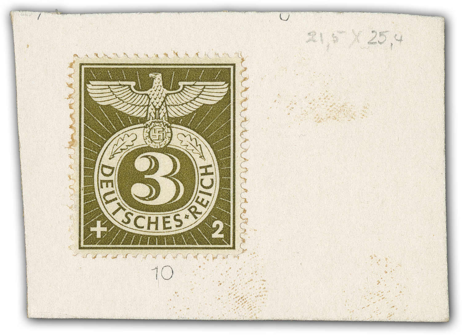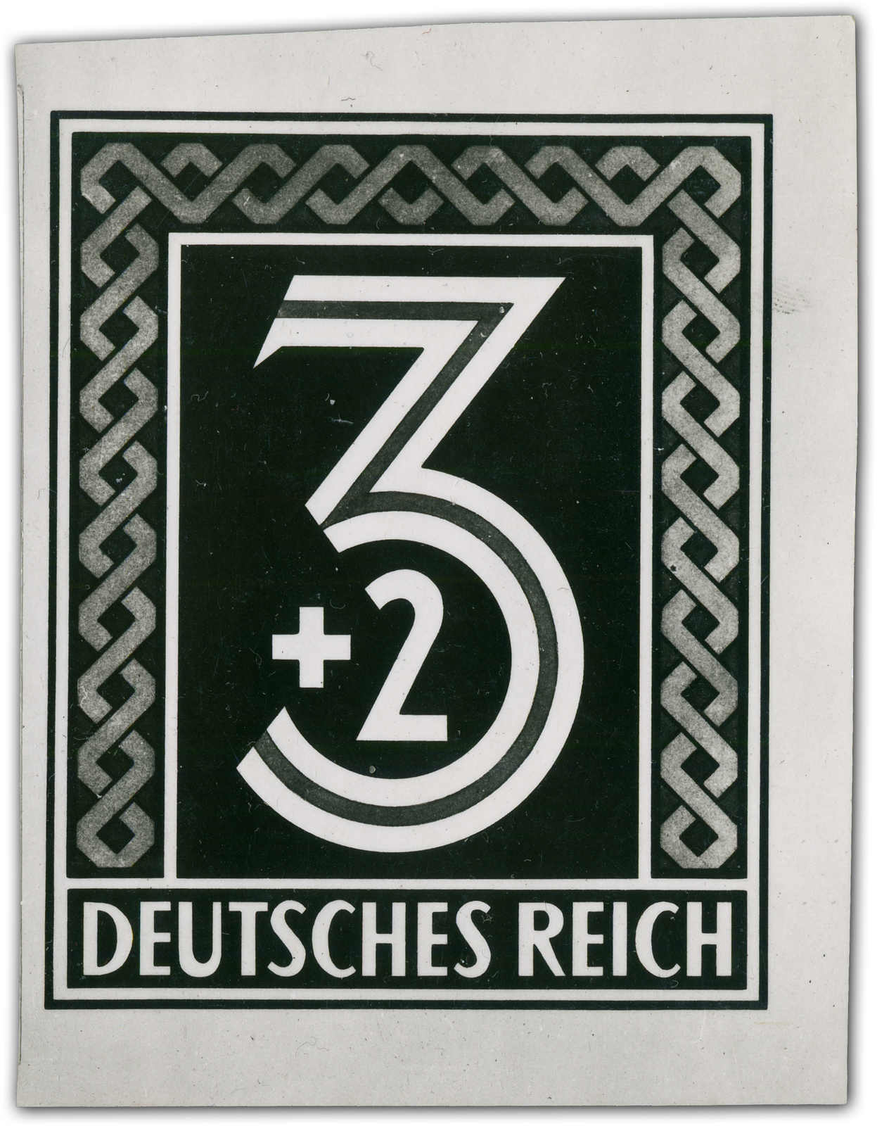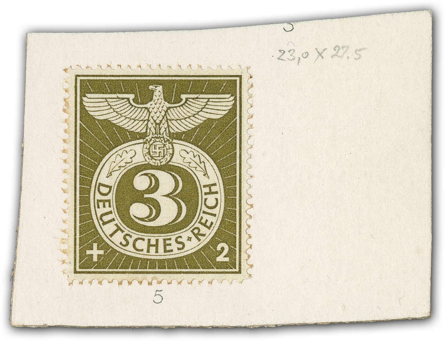 Erich Meerwald had designed the motifs commemorating the 1939 International Exhibition of Cars and Motorbikes. According to his final drawing the photo essay of the 25+10 (Rpf) stamp was made. It is the only known copy to date. (Image)