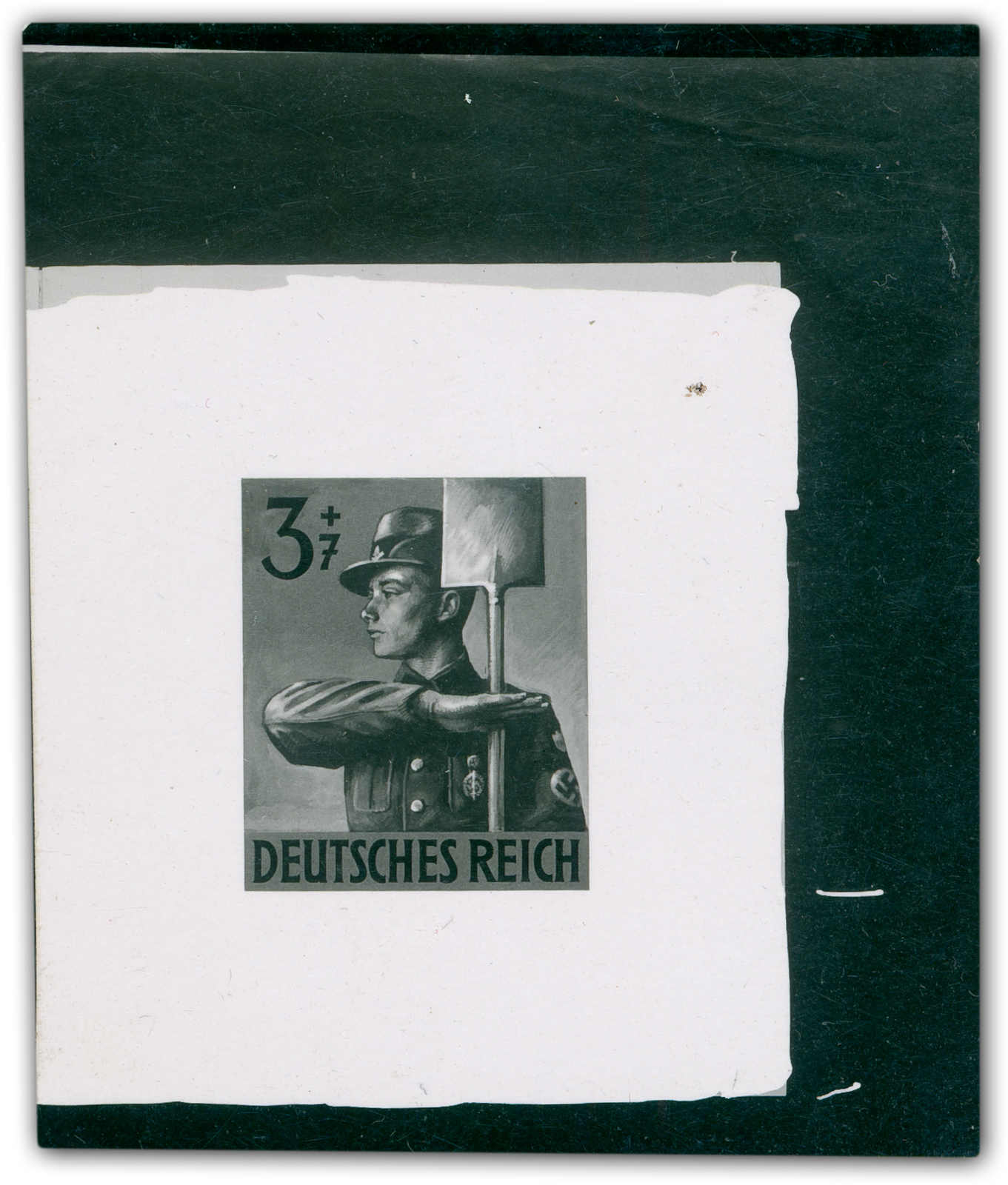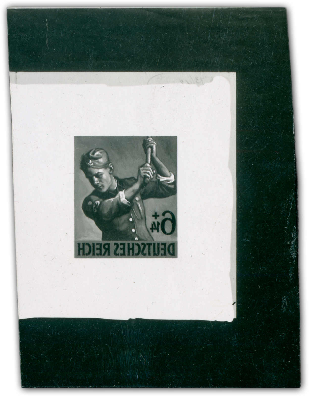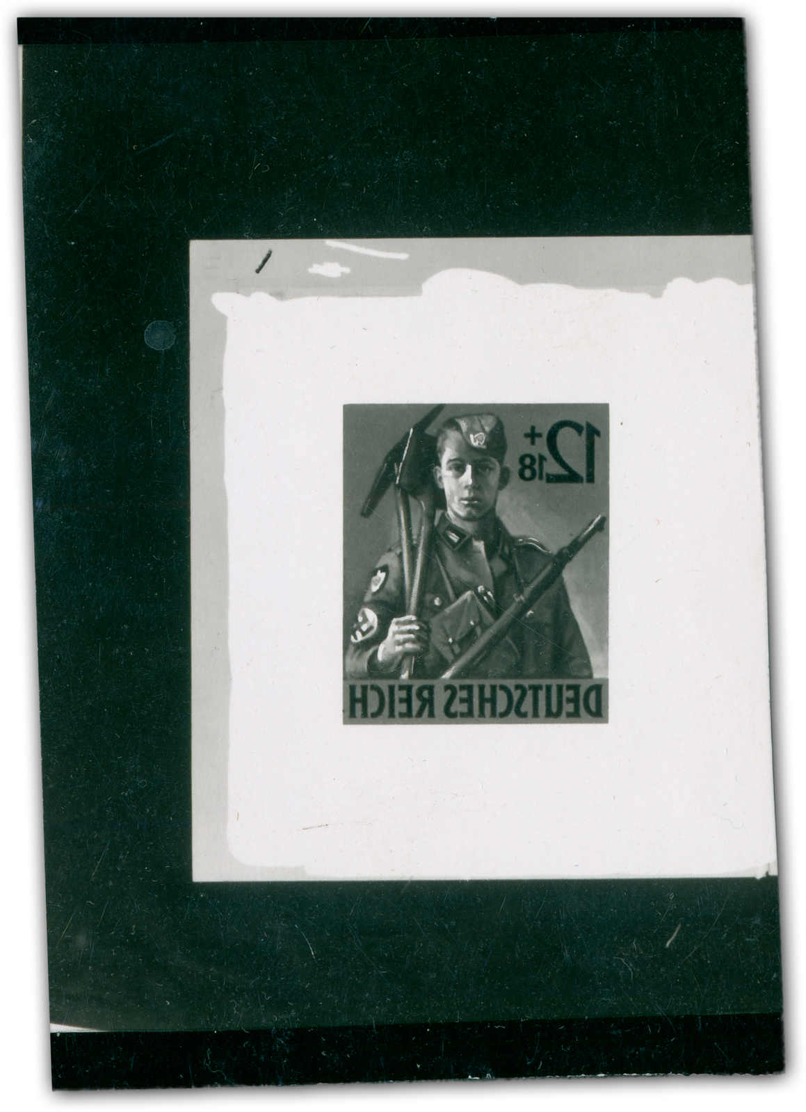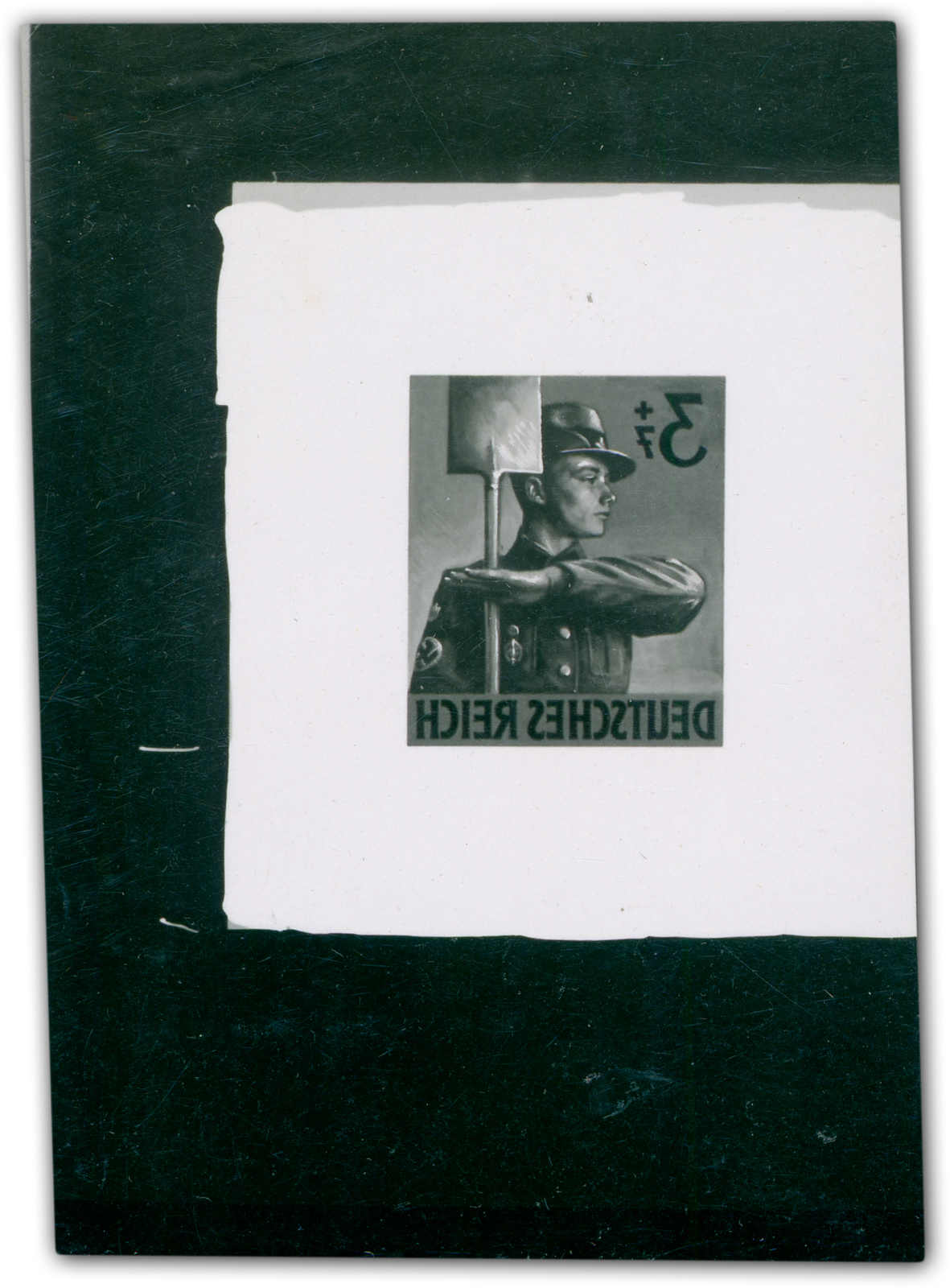 NOVEMBER 9th 1943, COMMEMORATIVE STAMP Photo essay of the second draft. This presentation was generally accepted. The only modification the Ministry of Propaganda demanded was, that the face section of the head had to appear on a white