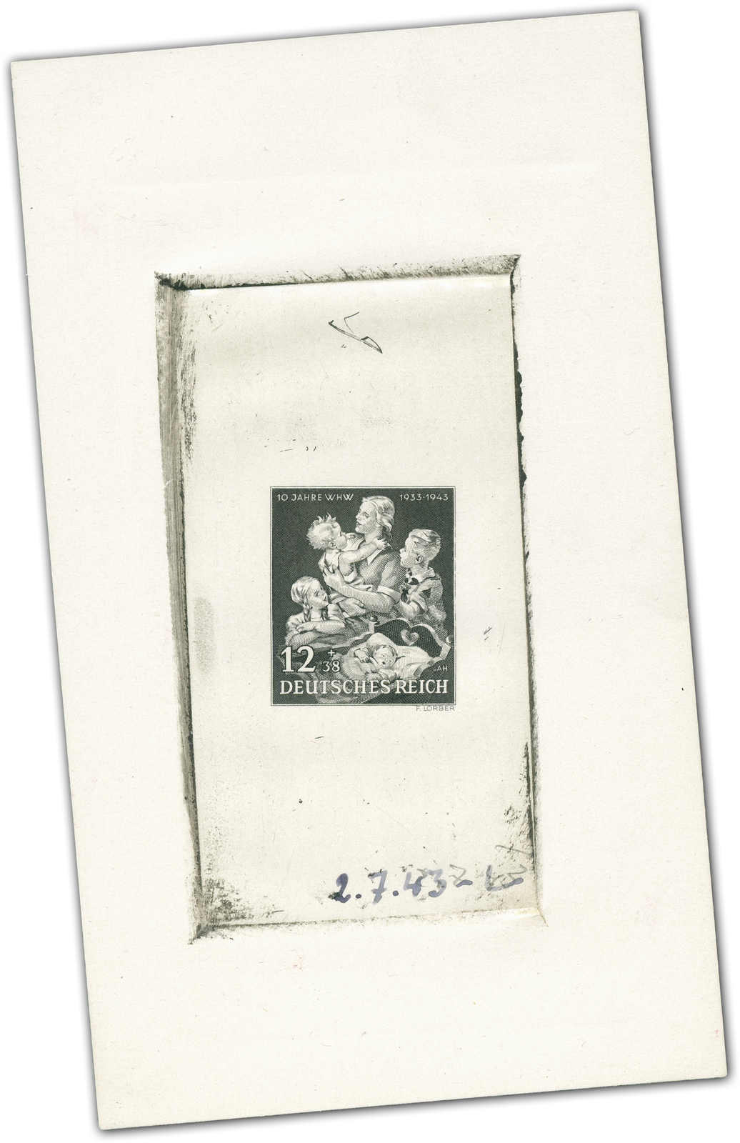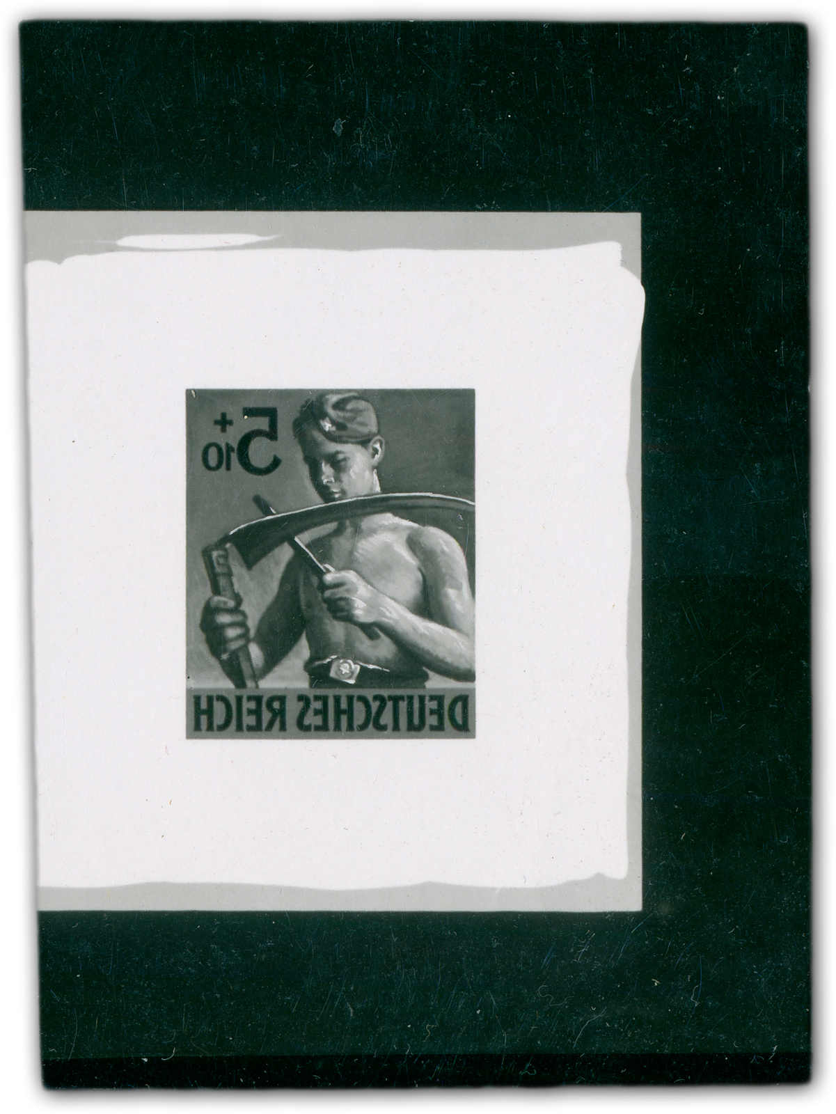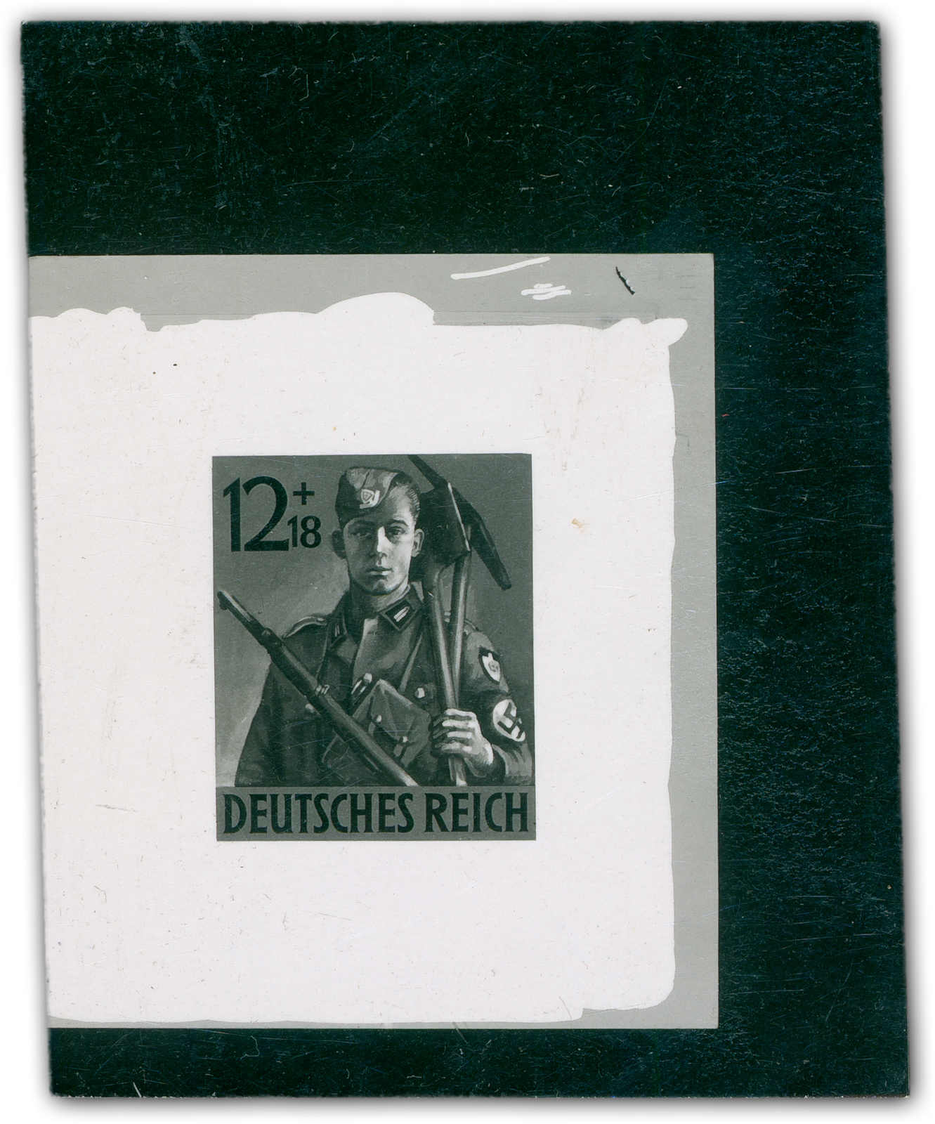 NOVEMBER 9th 1943, COMMEMORATIVE STAMP Photo essay of the second draft. This presentation was generally accepted. The only modification the Ministry of Propaganda demanded was, that the face section of the head had to appear on a white