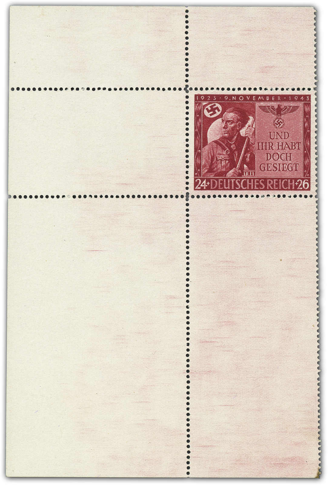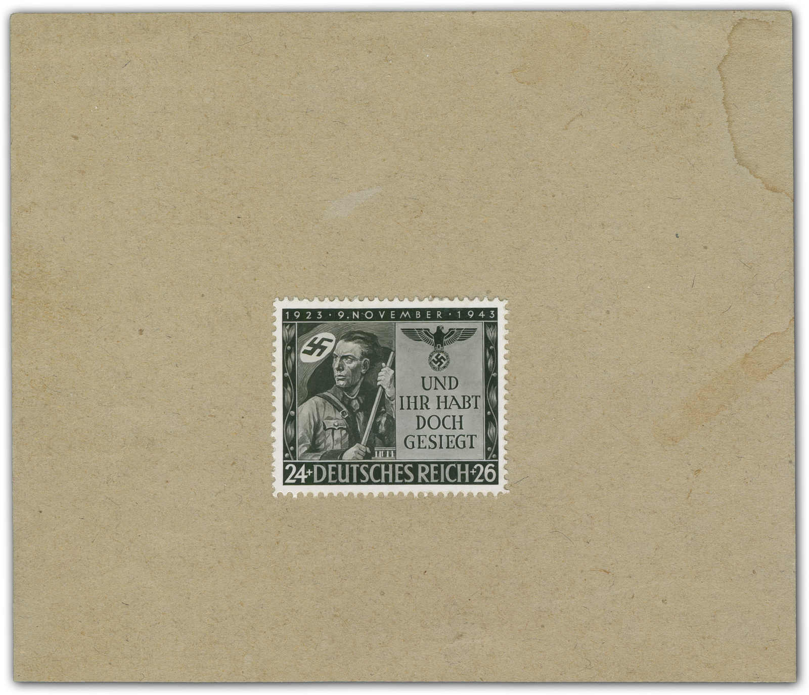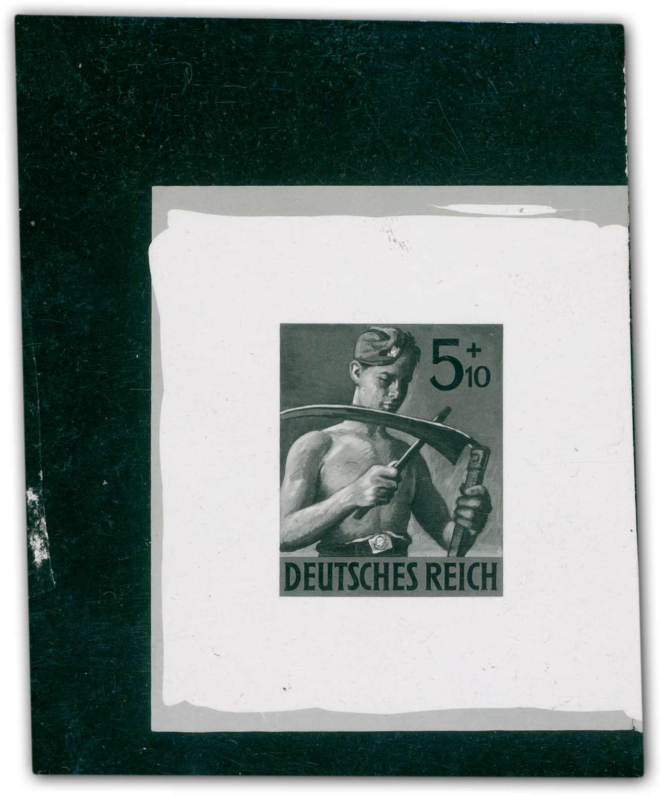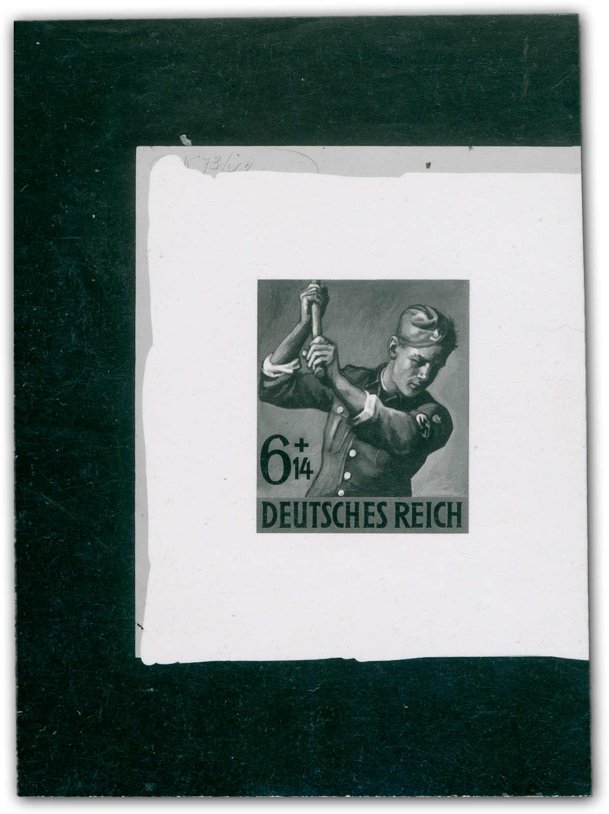 NOVEMBER 9th 1943, COMMEMORATIVE STAMP Photo essay of the second draft. This presentation was generally accepted. The only modification the Ministry of Propaganda demanded was, that the face section of the head had to appear on a white