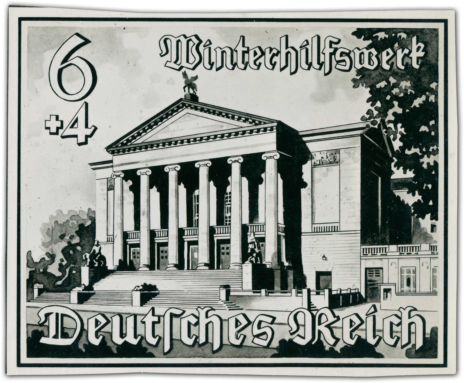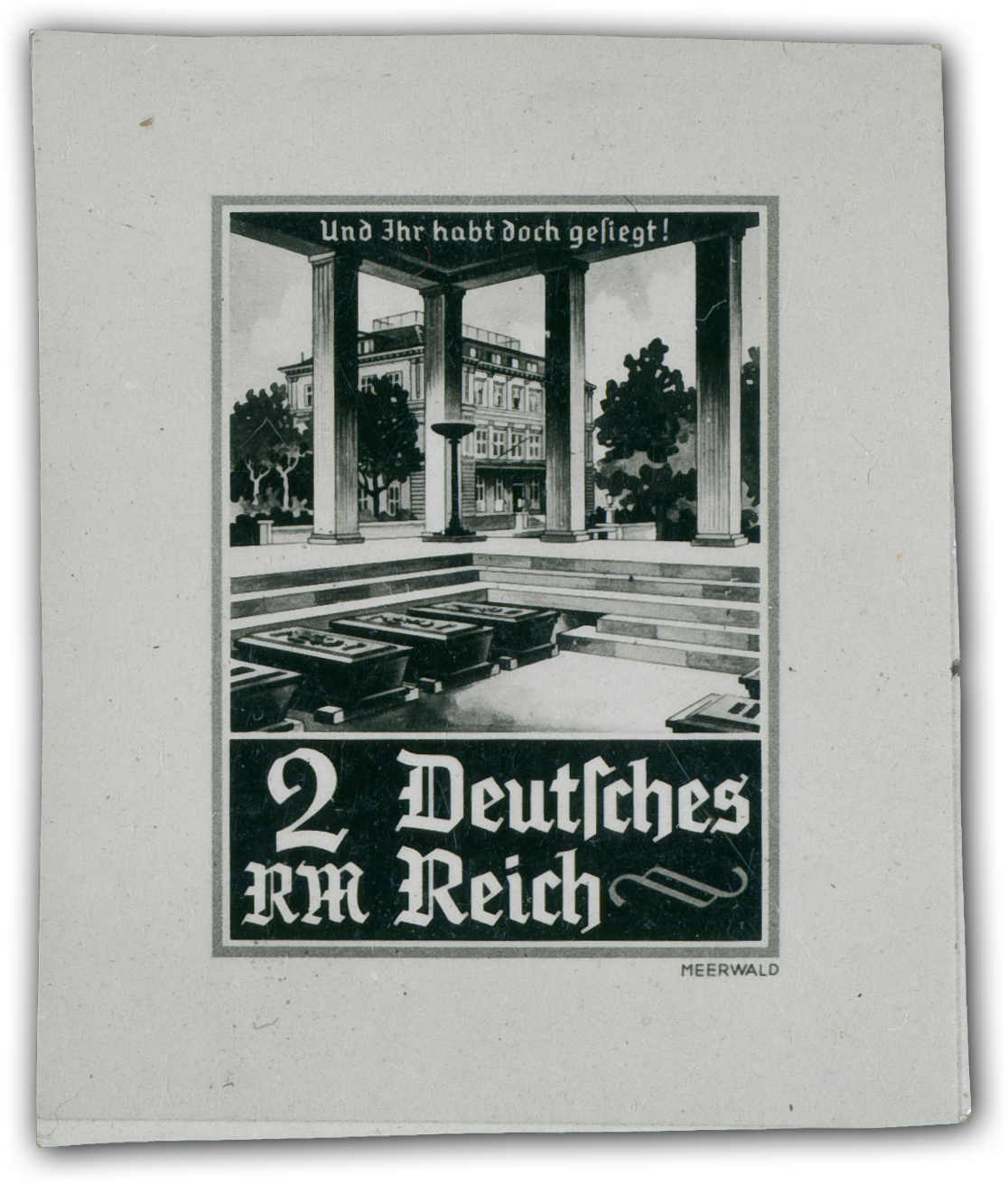 UNADOPTED DRAFT FOR A DEFINITVE STAMP OF 2 RM The same design as for his rejected “9th November“ commemorative stamp Erich Meerwald used for a definitive stamp of the face value “2 RM“. The motif was never used. Only this photo essay