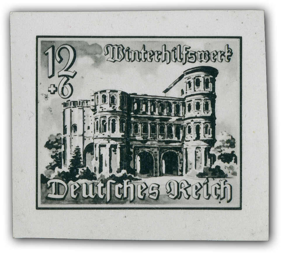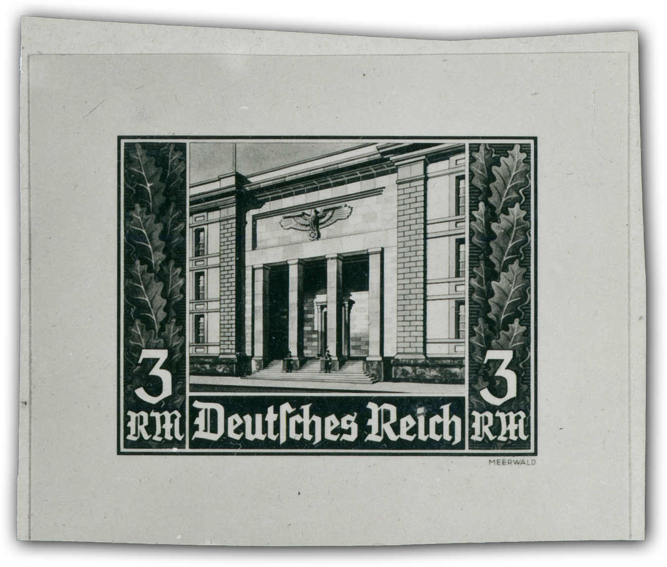 UNADOPTED DRAFT FOR A DEFINITVE STAMP OF 3 RM Erich Meerwald designed this motif depicting the entrance of the “Reichskanzlei“ (Reich Chancellor`s Office which was of course the "Führer`s" office). This draft was intended to be used for