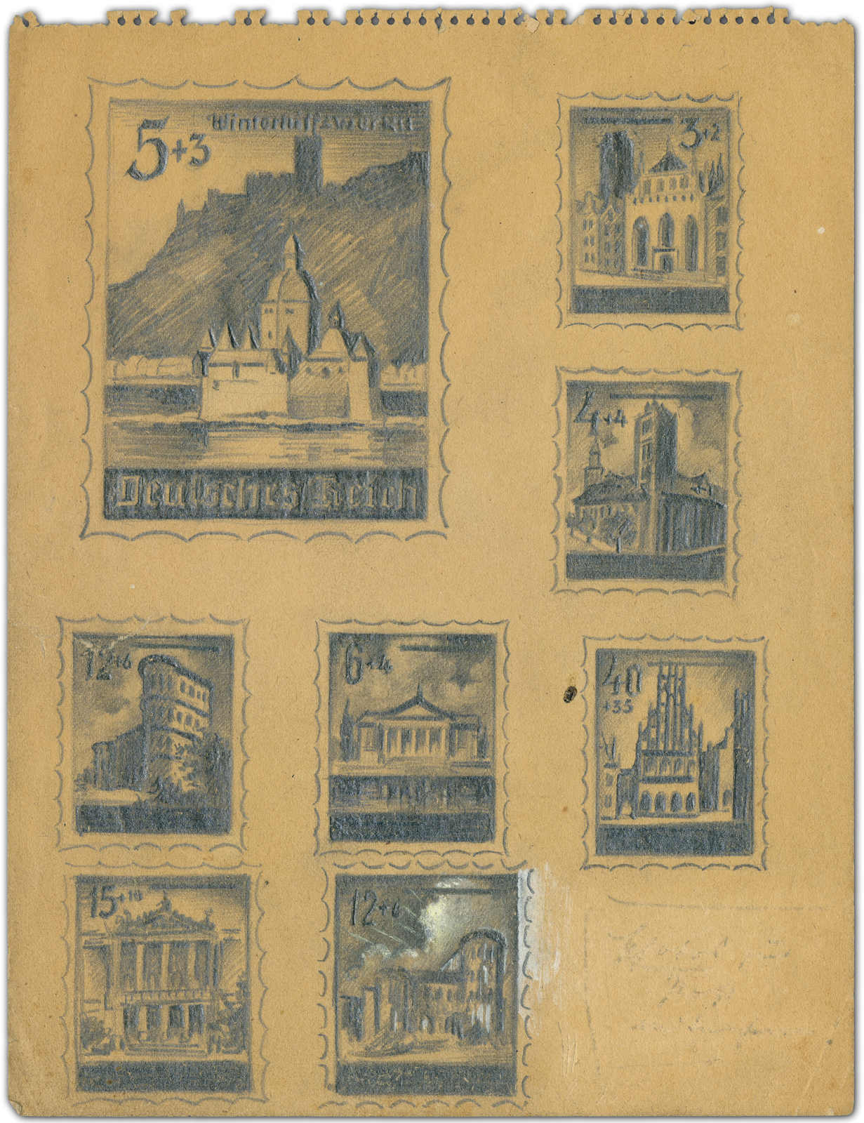 WINTER AID RELIEF FUND 1940 From the sketchbook of Lothar Wüst. The page with the first drawings for the series. A unique historical showpiece. More details about the importance of the Winter Relief Fund can be obtained in vol. 2 of
