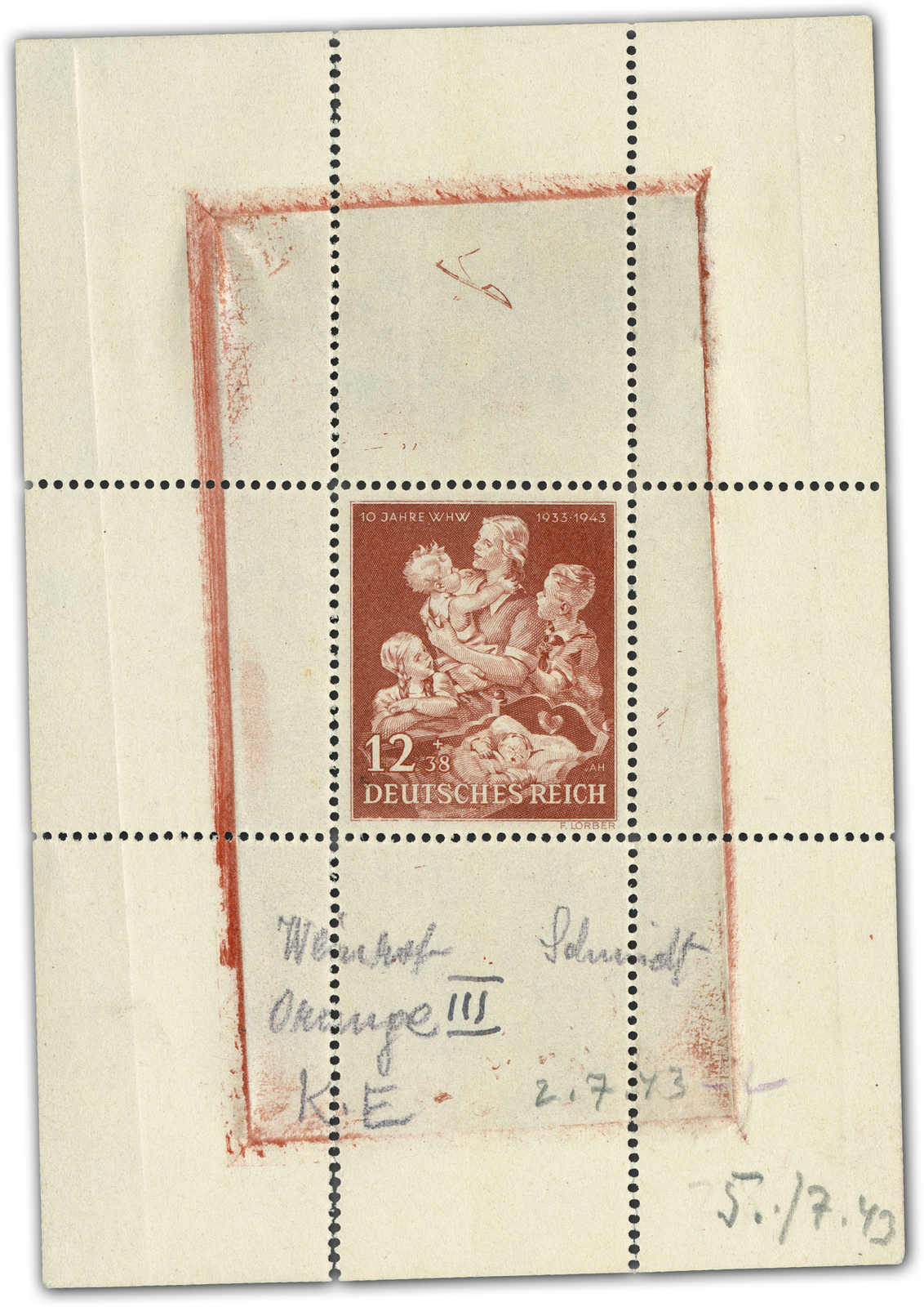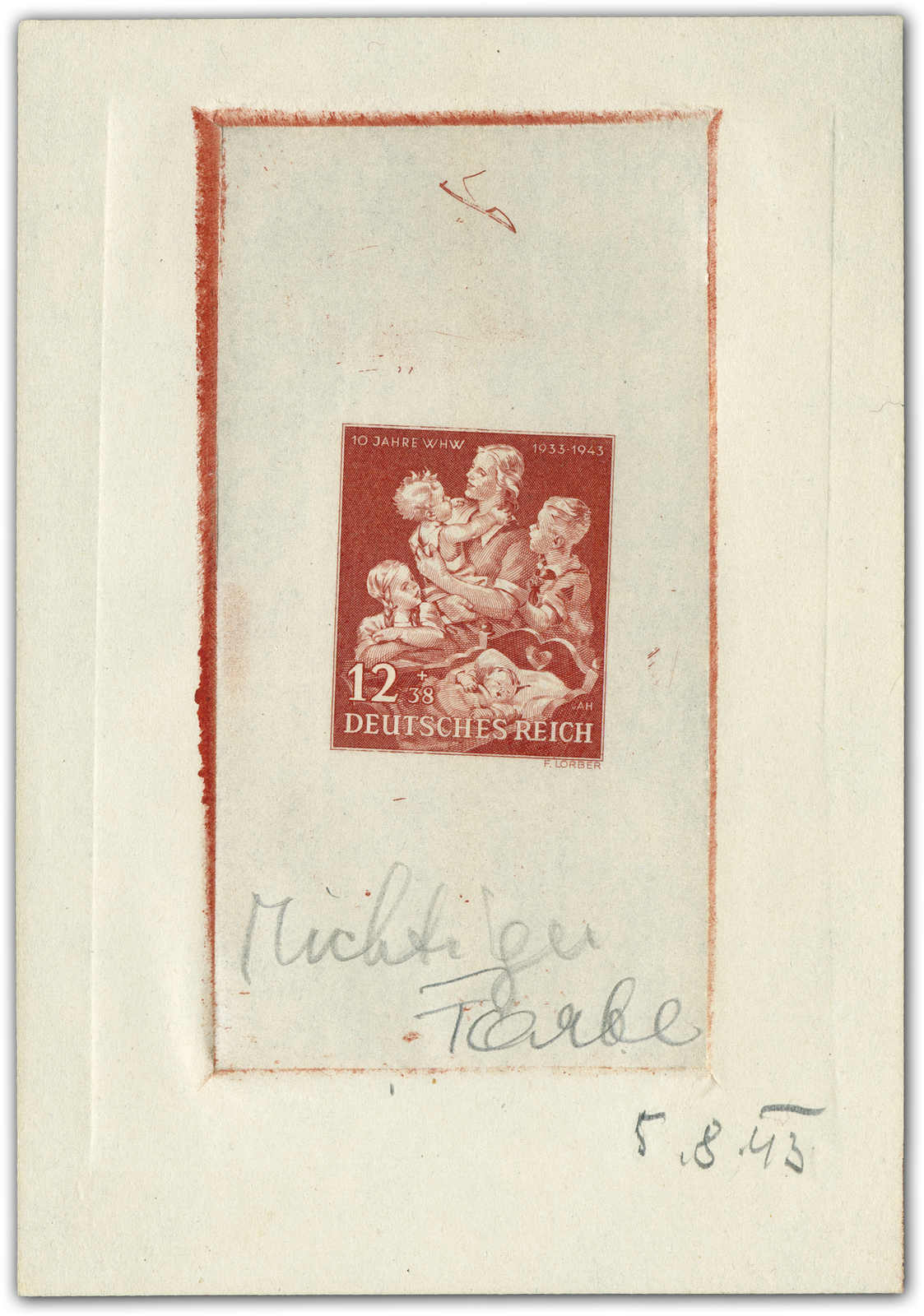 10TH ANNIVERSARY WHW WINTER AID RELIEF FUND – 1943 Print taken from the finished original die. This is the first version as an imperforate mini sheet. At the bottom handwritten “richtige Farbe“ (= right colour) and dateline 5.8.43. The