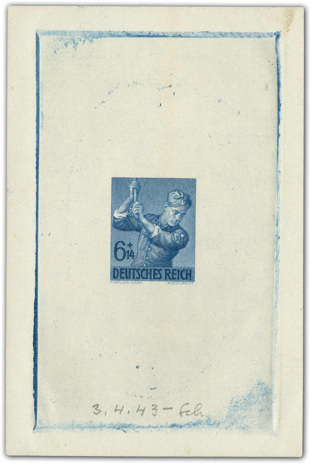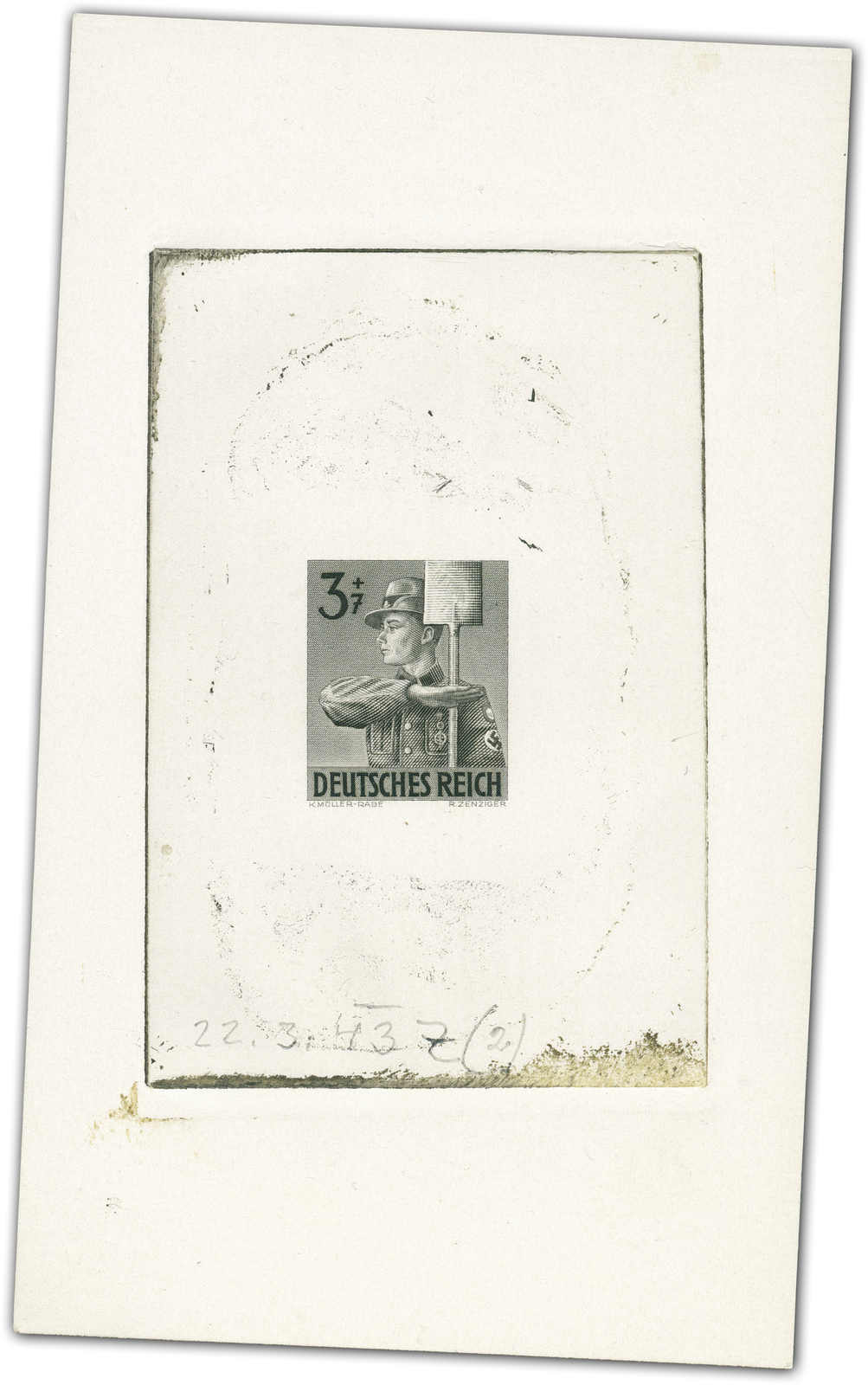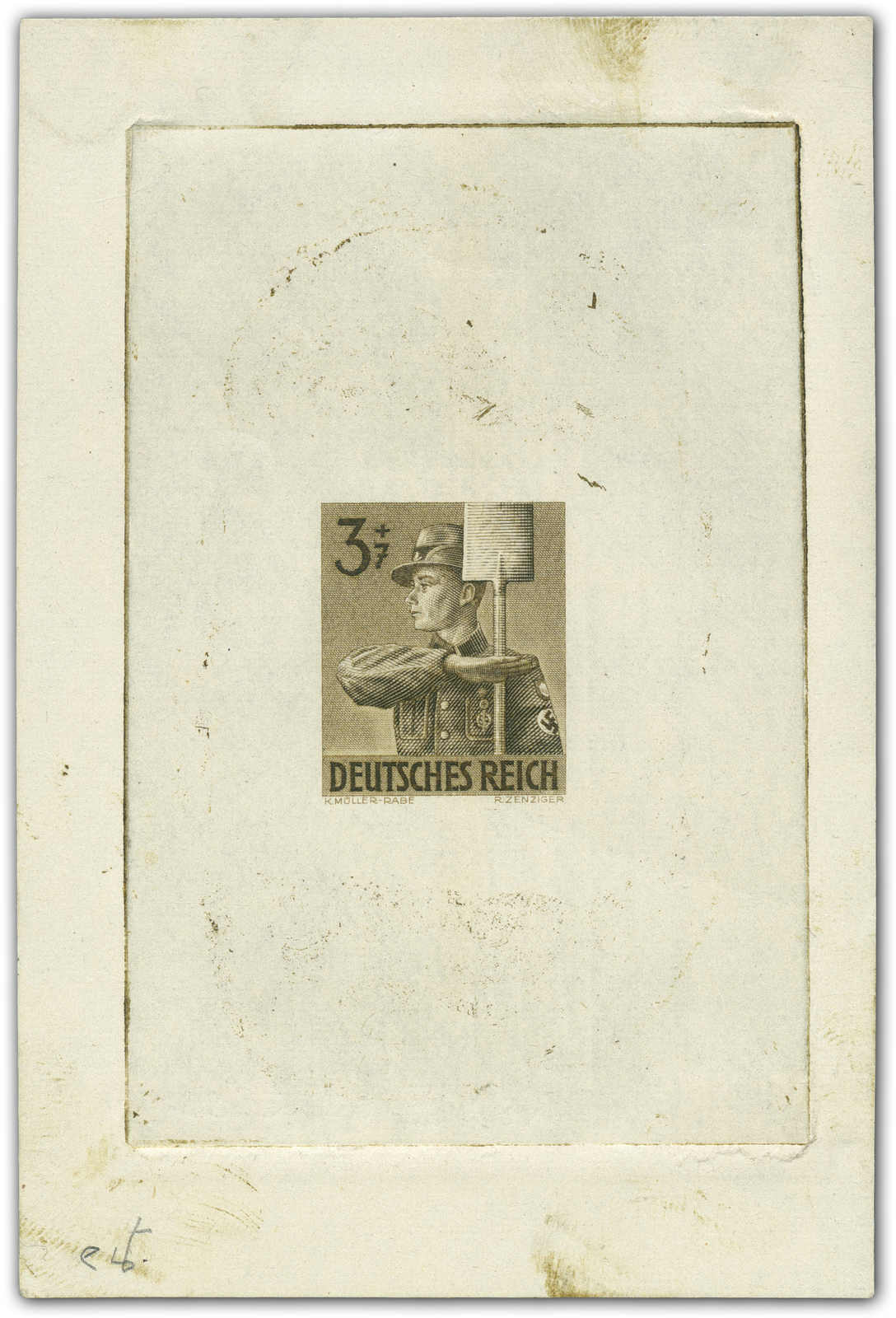 8 YEARS OF REICHSARBEITS-DIENST (RAD) 1943 Print taken from the finished original die of the 3+7 (Rpf) value in black. At the bottom handwritten dating “22.3.43“ and the initial of the steel printer alongside. The “(2)“ behind the note