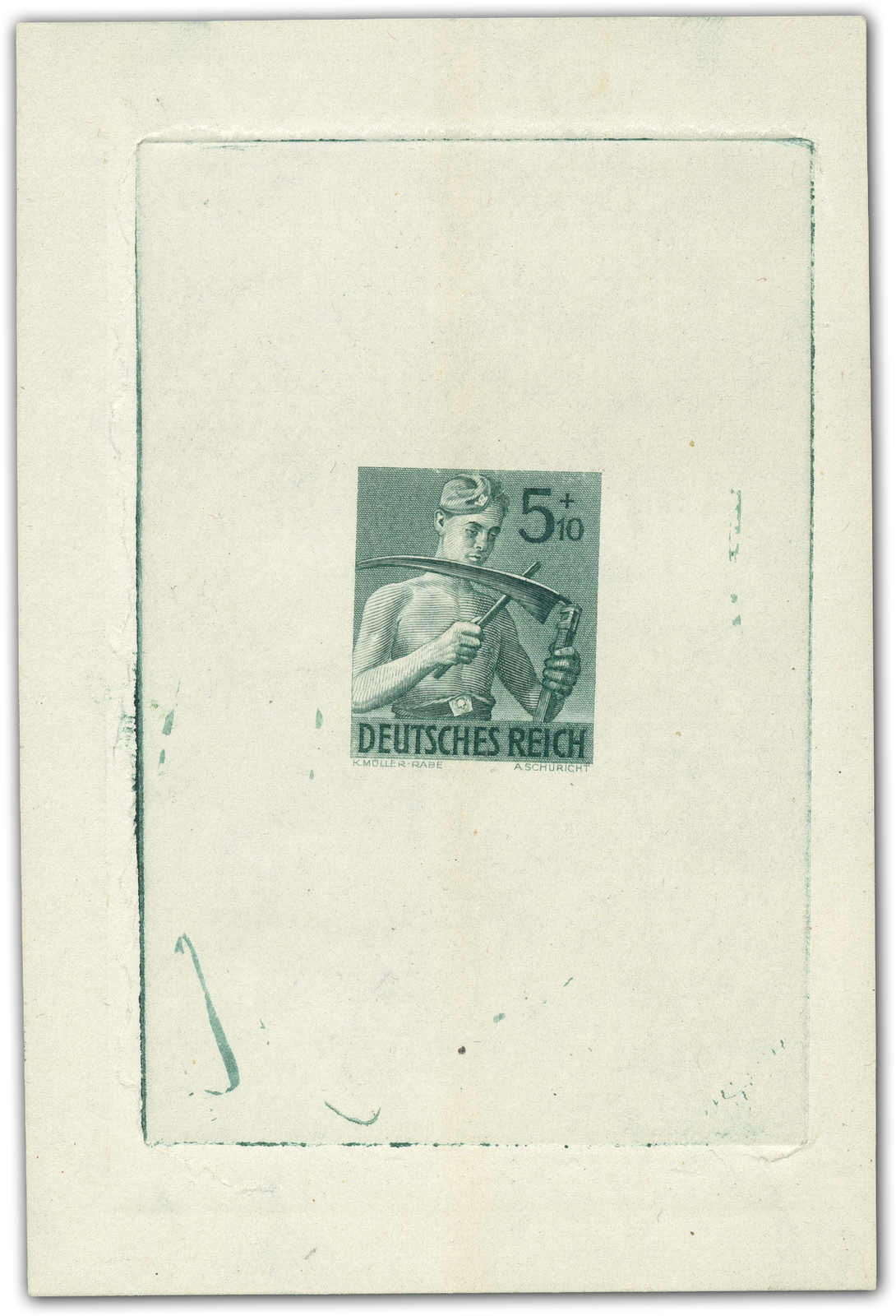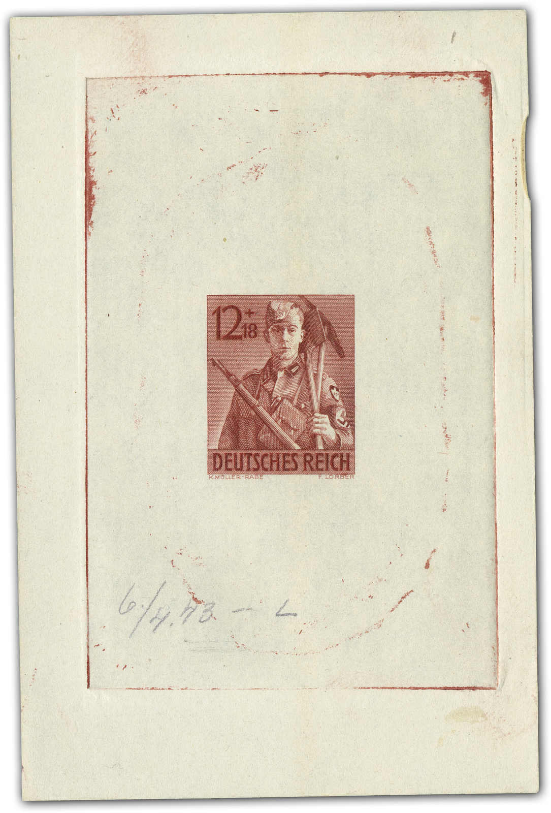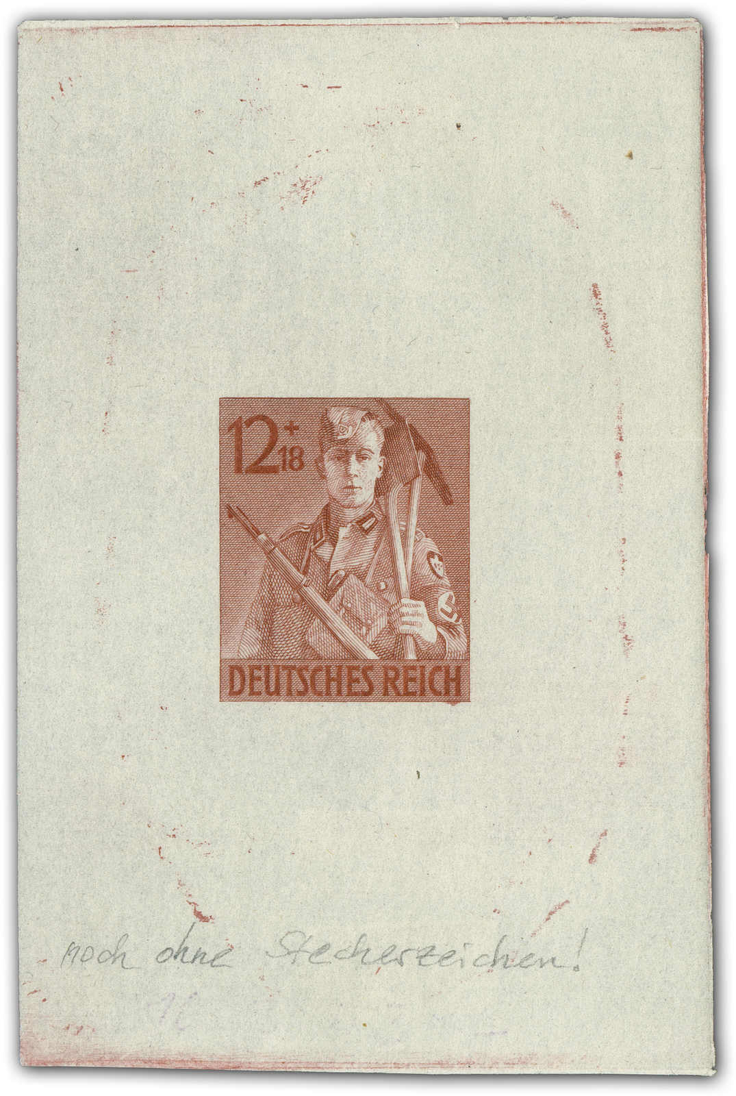 COMRADESHIP OF THE GERMAN REICHSPOST 1944 Single print of the 12+18 (Rpf) value in the issued colour shade. The most serious difference between this and the stamp which was issued was, that the position oft he face value plus surcharge