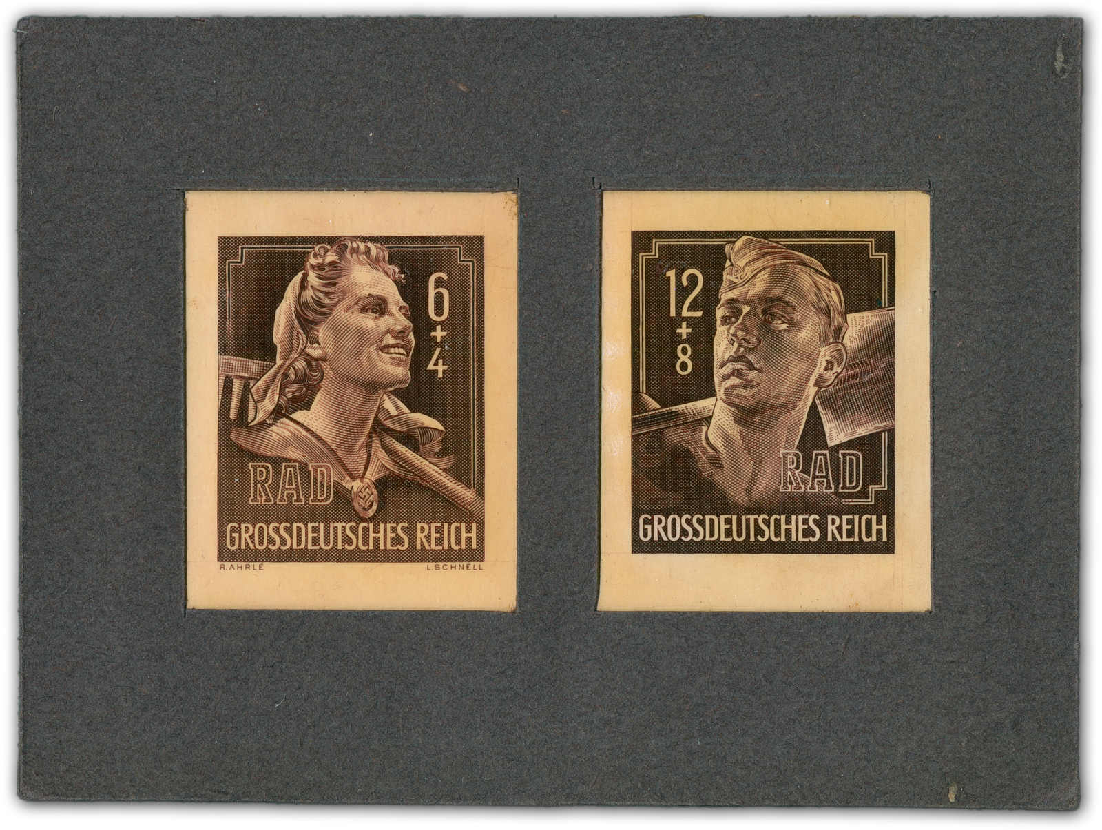 REICH LABOUR SERVICE 1944 Print taken from the original dies for both commemorative stamps of 6+4 and 12+8 (Rpf). The print was executed in deep black on baryte paper. On the “6+4“ stamp beneath the motif on the left the name of the