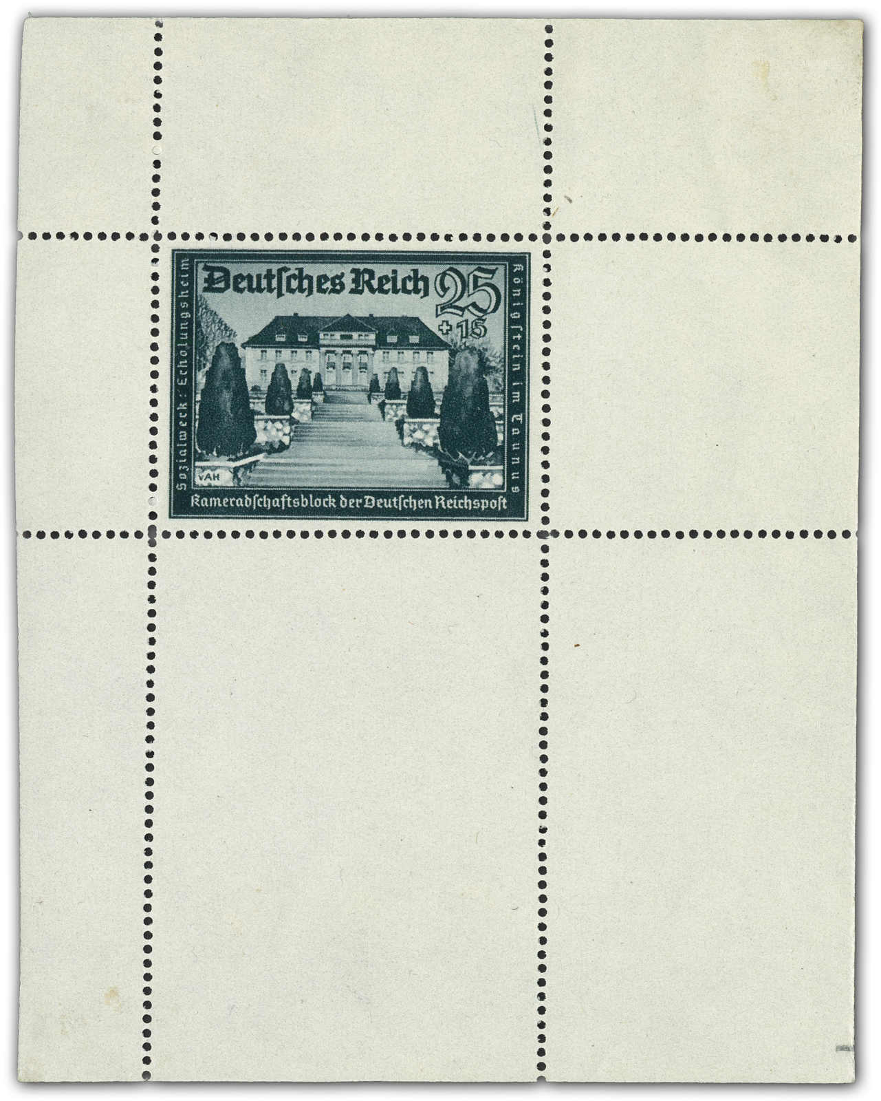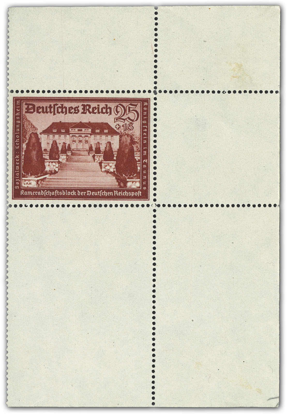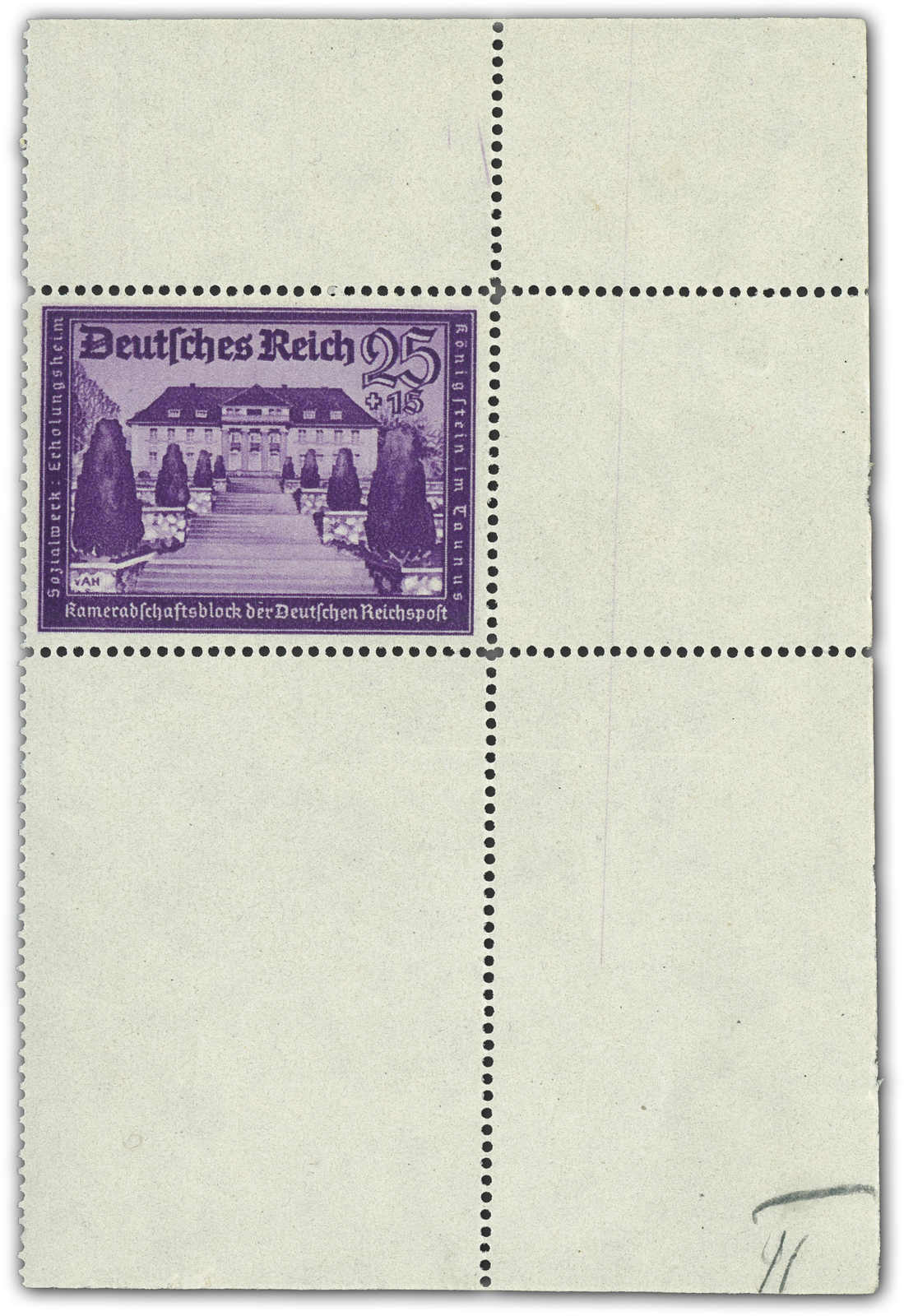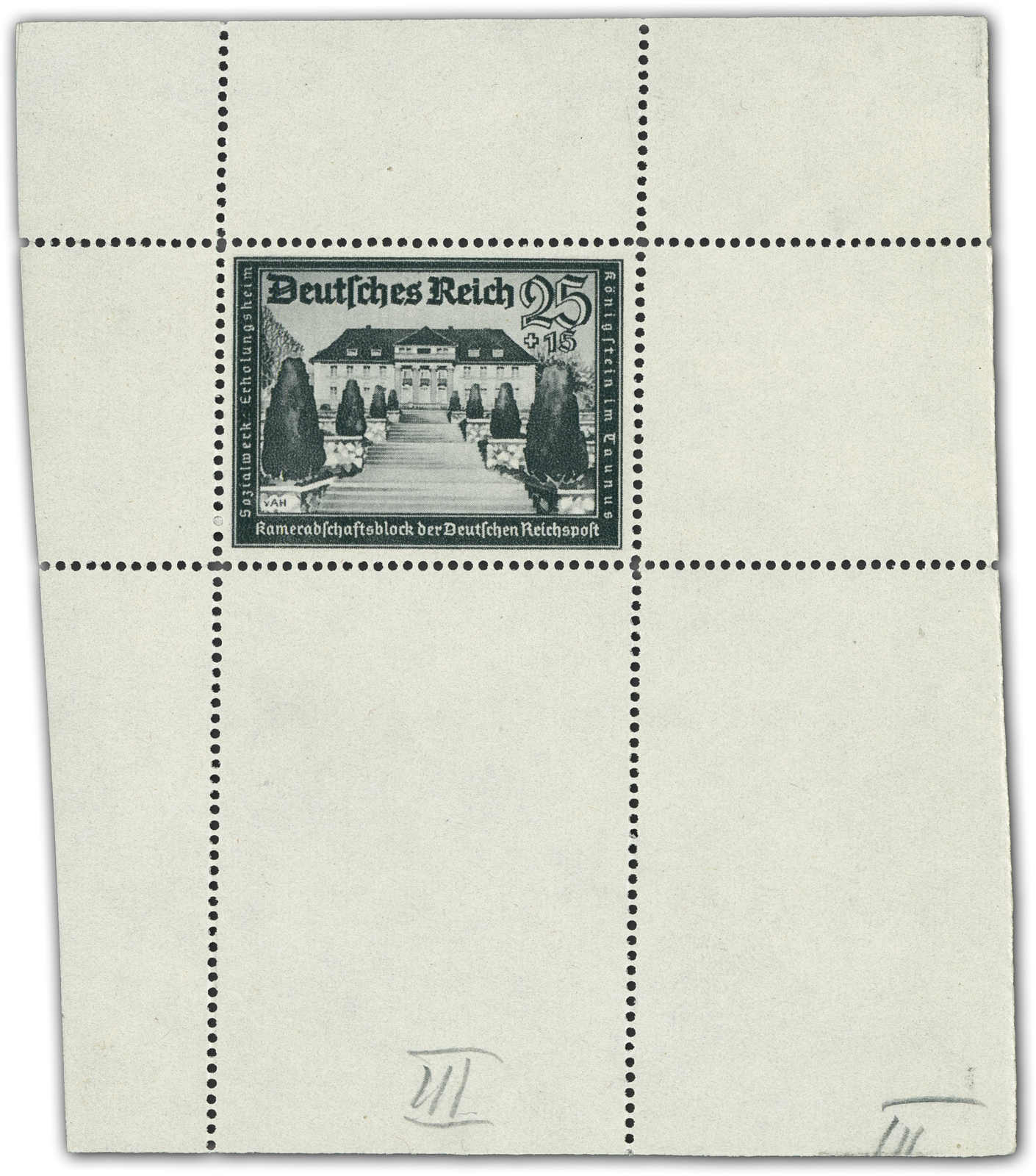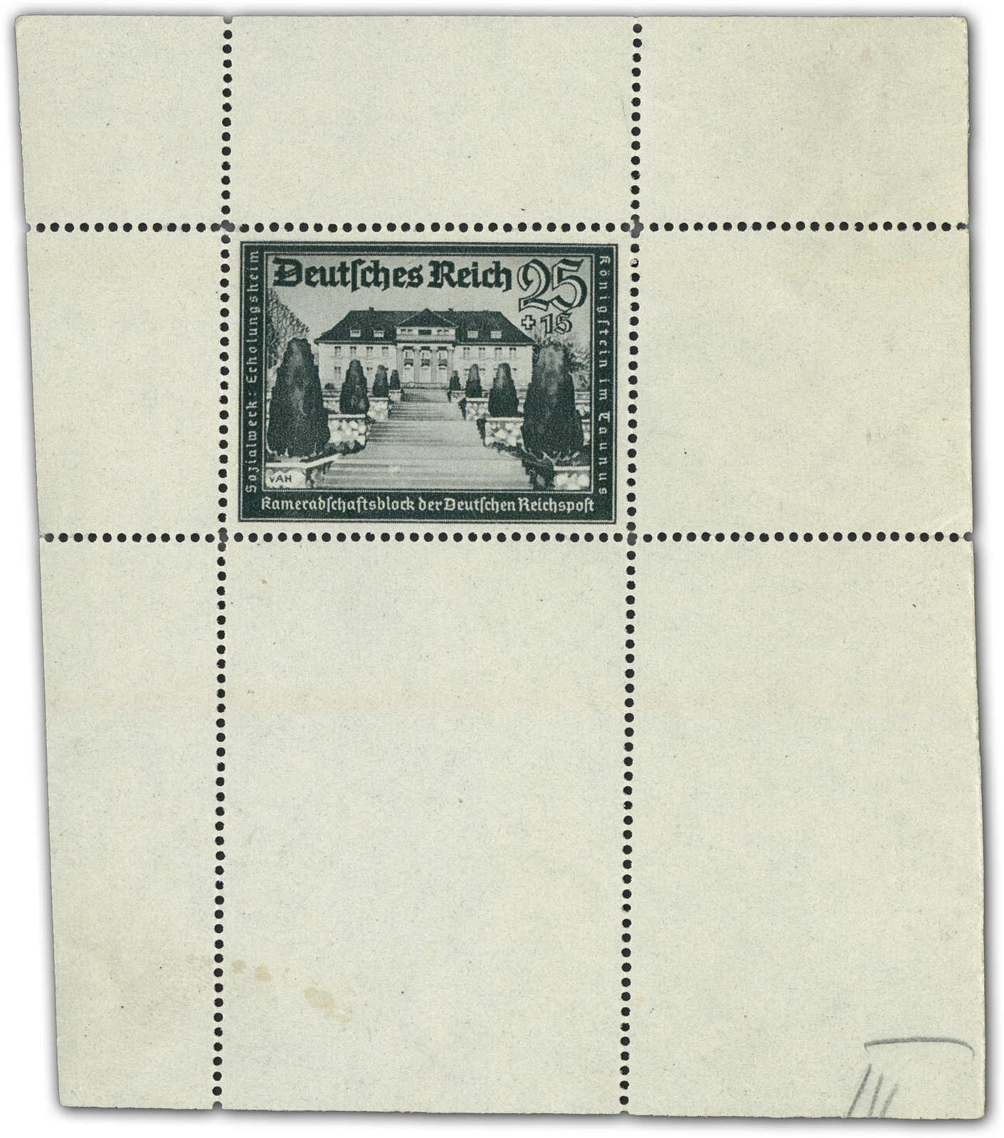 1939 COMRADESHIP OF THE GERMAN REICHSPOST Single print of the 25+15 (Rpf) value on a complete print sheet as it was used in the Vienna Staatsdruckerei. On all sides “hand“ perforation. Here a black green shade was taken for the print.