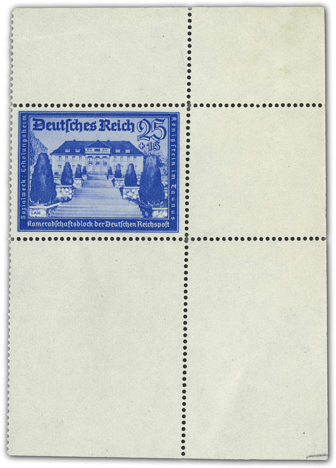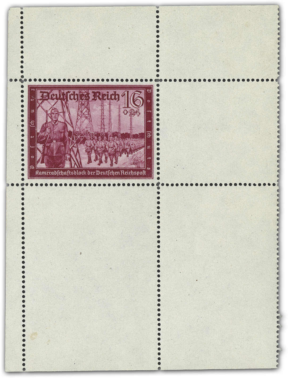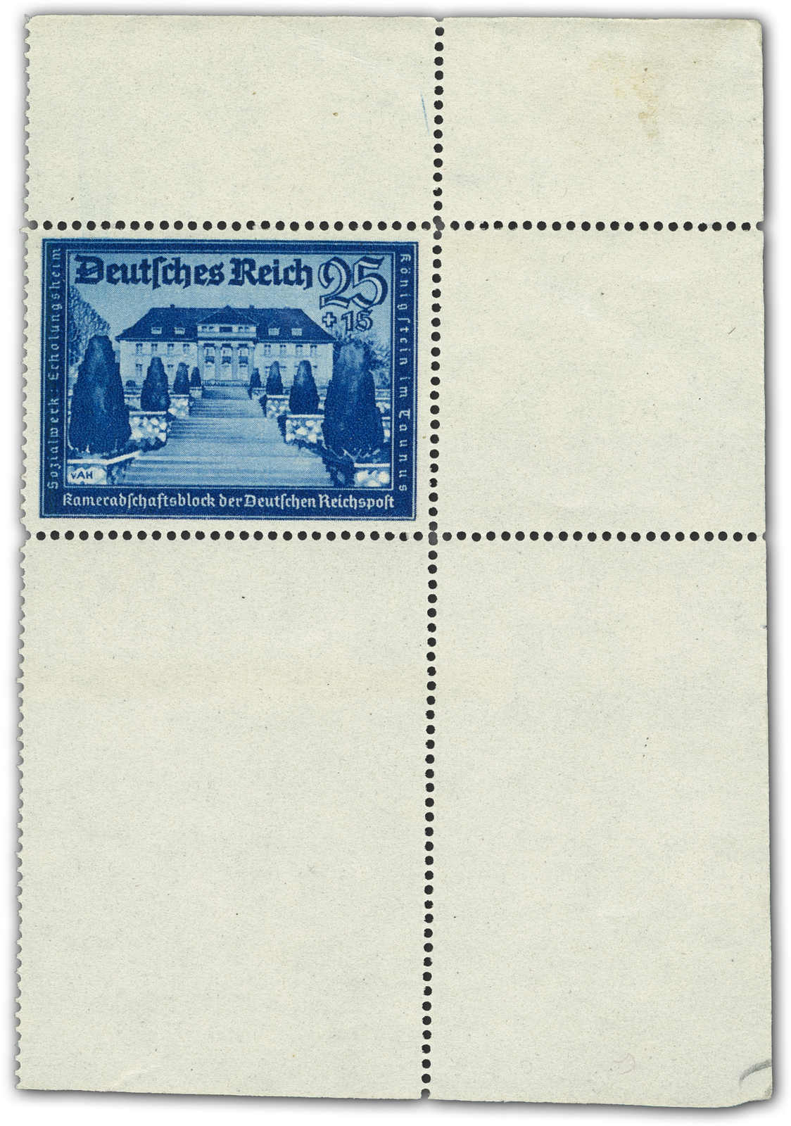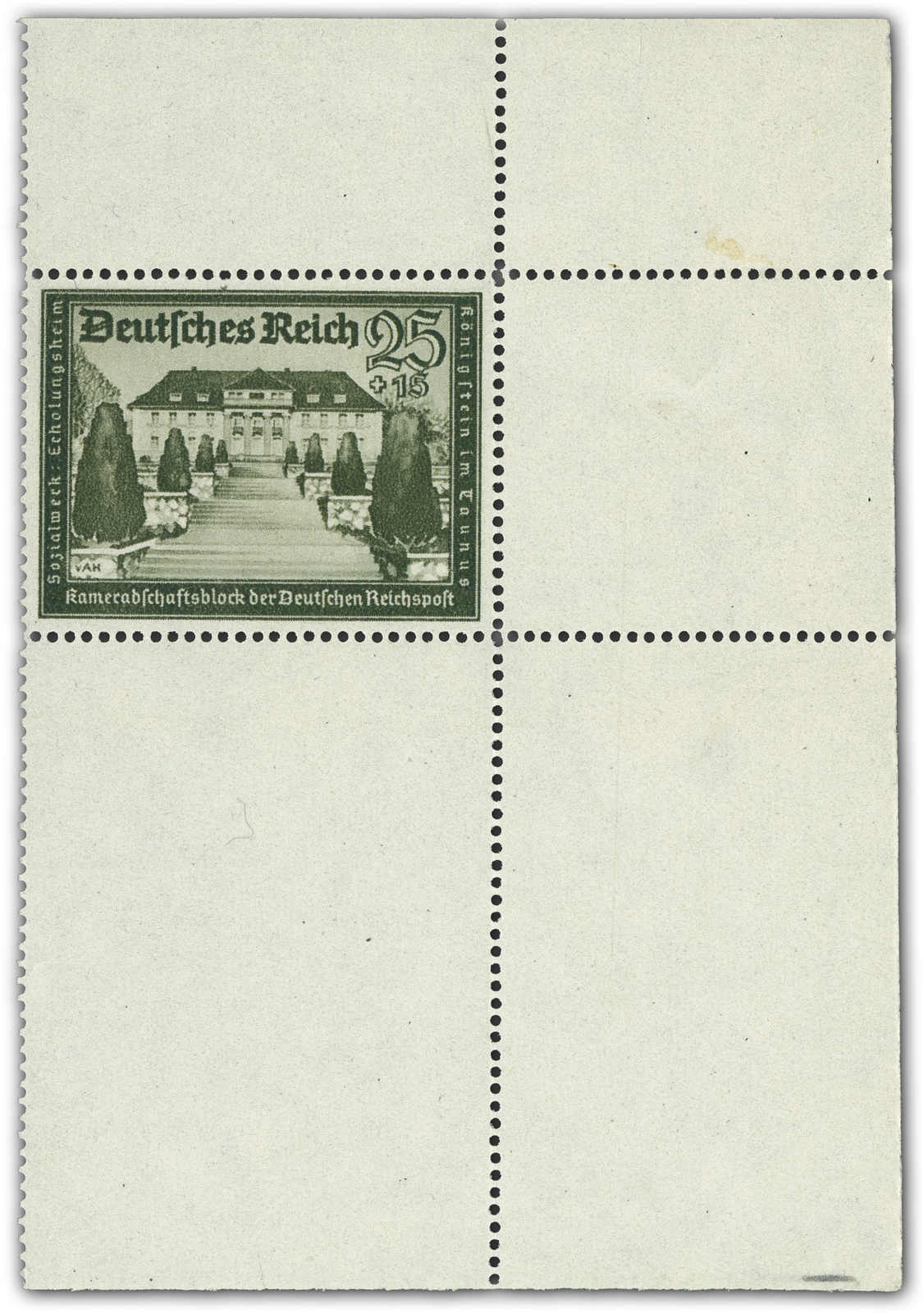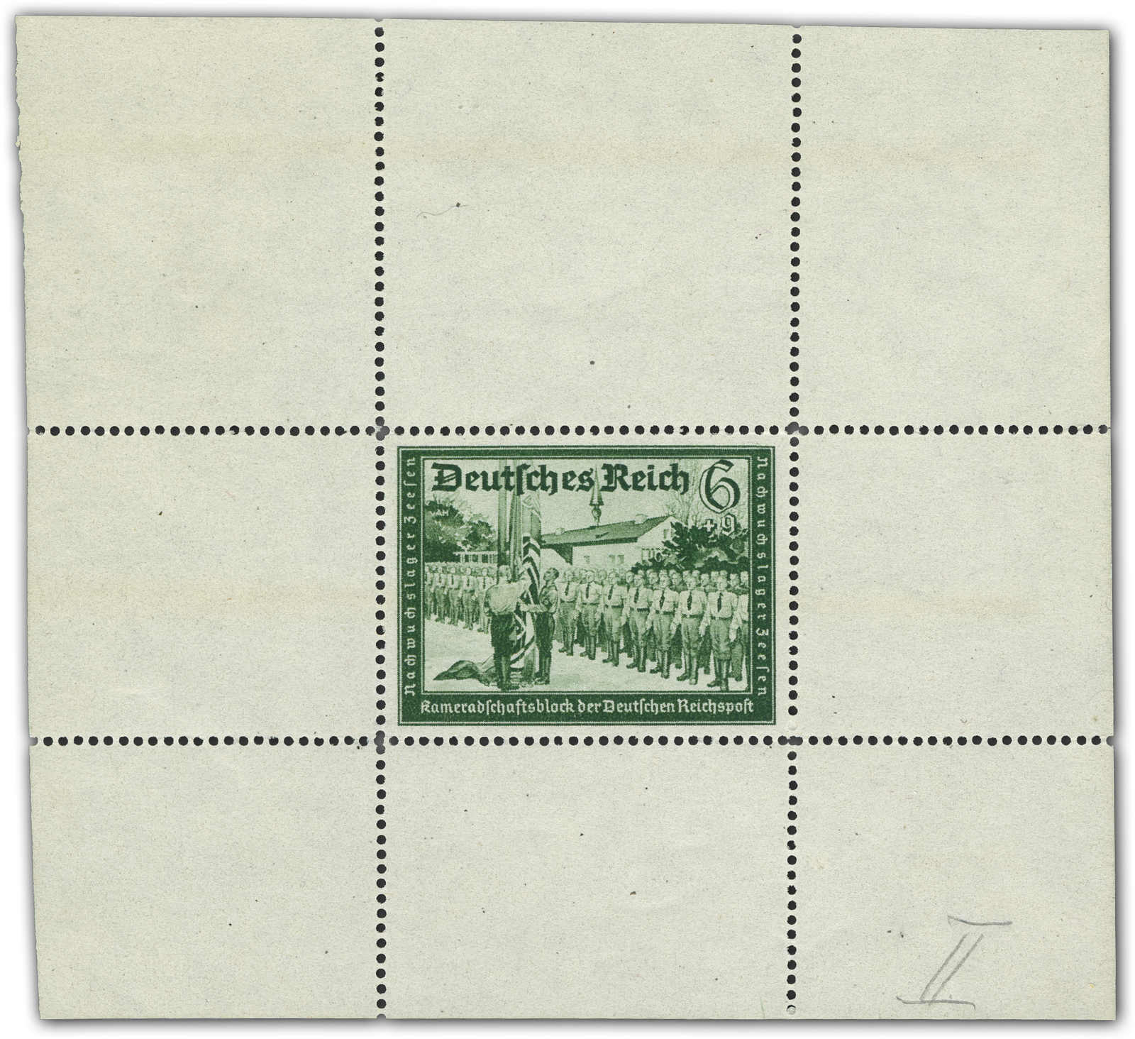 1939 COMRADESHIP OF THE GERMAN REICHSPOST Single print of the 25+15 (Rpf) value on a complete print sheet as it was used in the Vienna Staatsdruckerei. On all sides “hand“ perforation. Here a black green shade was taken for the print.