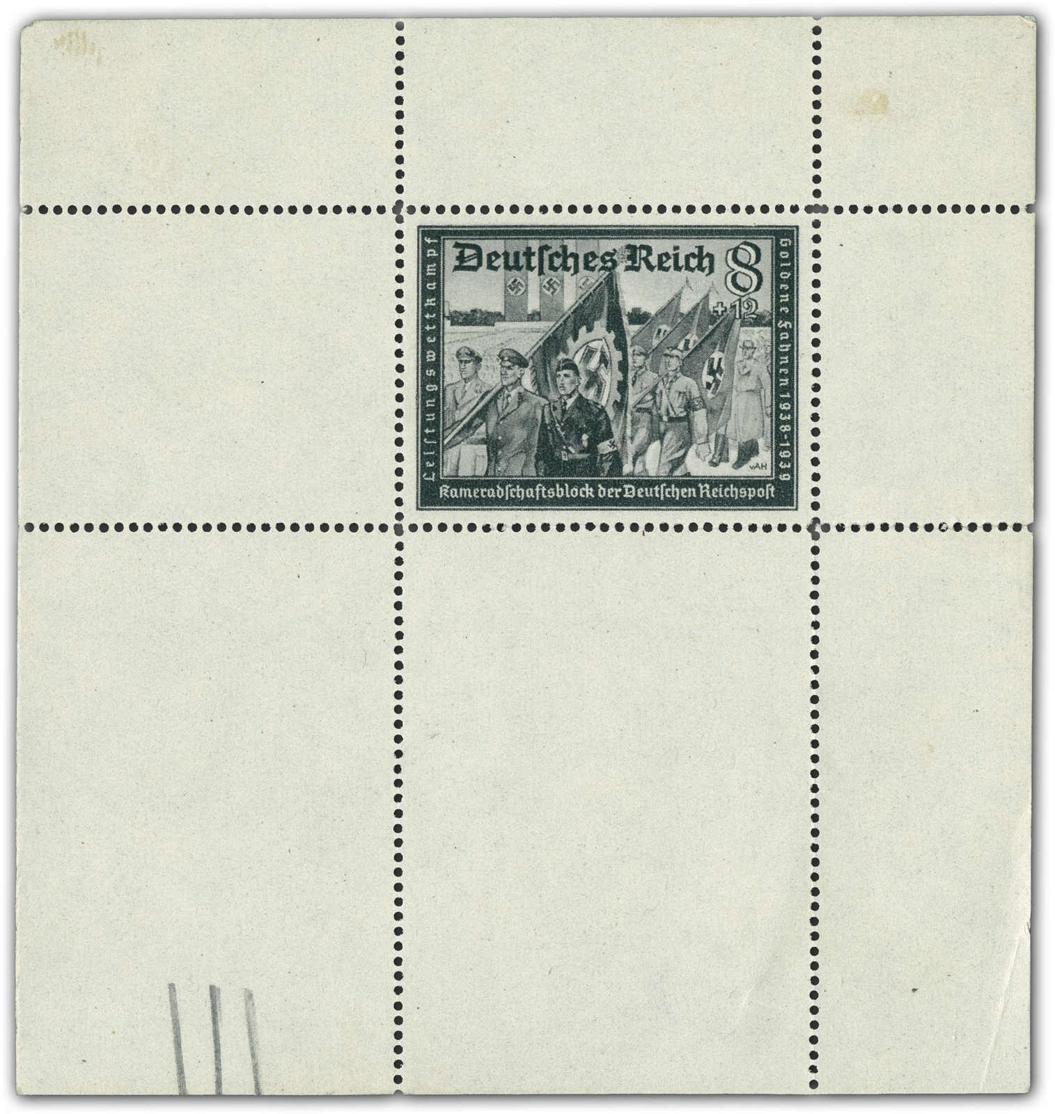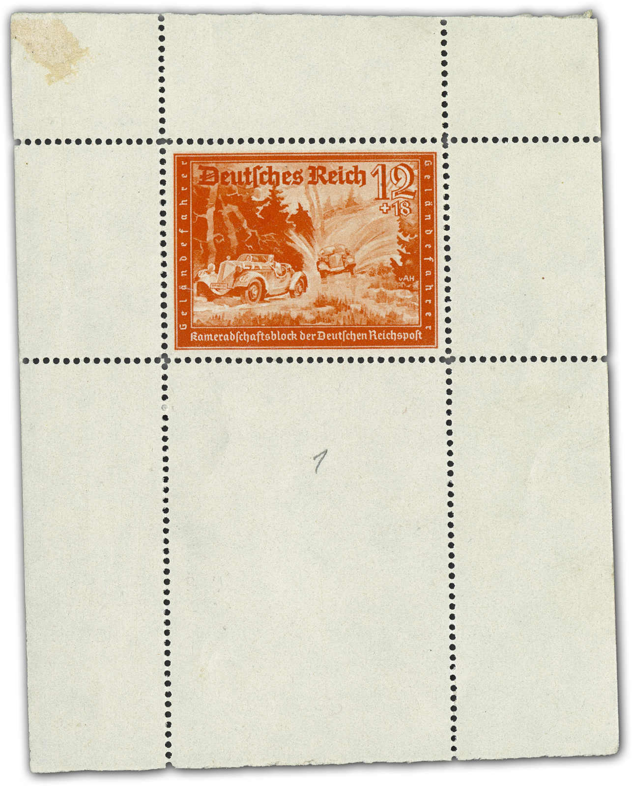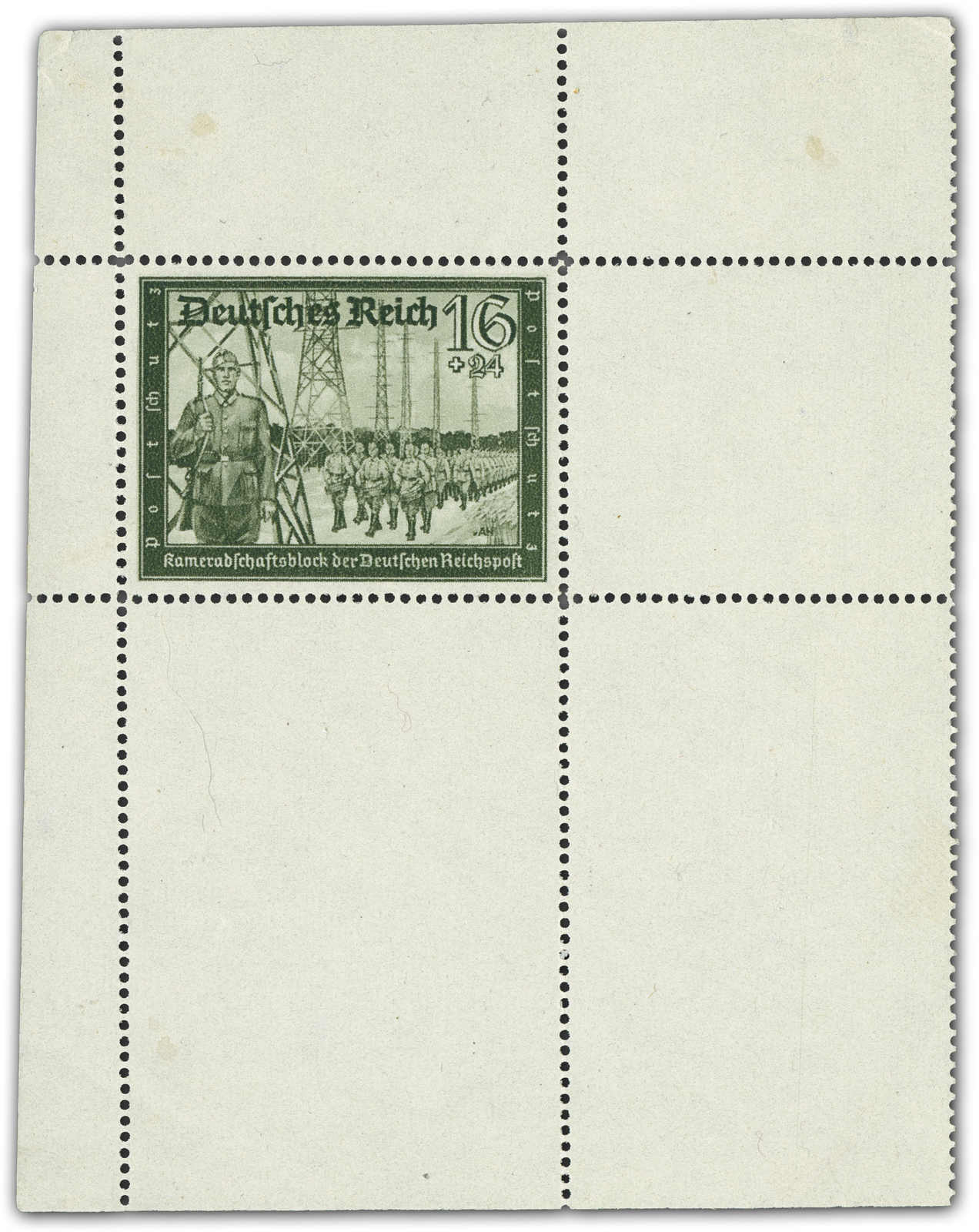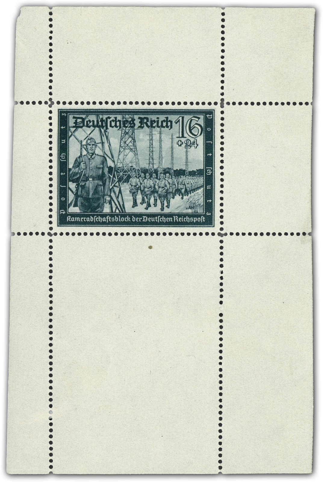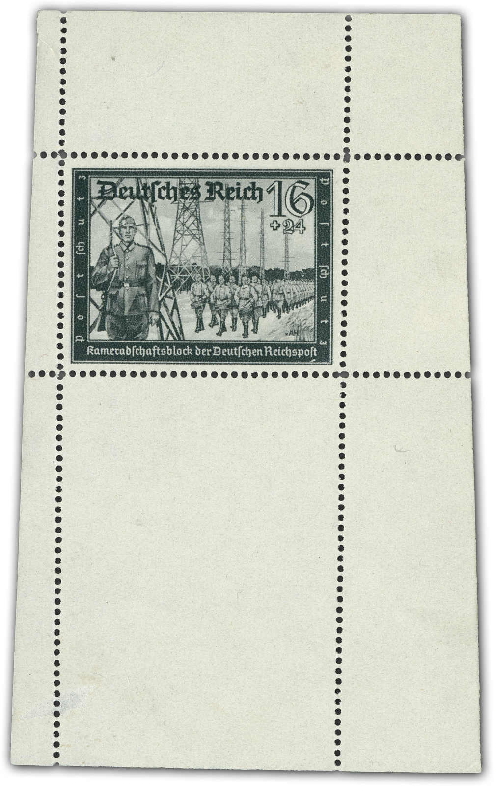 1939 COMRADESHIP OF THE GERMAN REICHSPOST Single print of the 25+15 (Rpf) value on a complete print sheet as it was used in the Vienna Staatsdruckerei. On all sides “hand“ perforation. Here a black green shade was taken for the print.