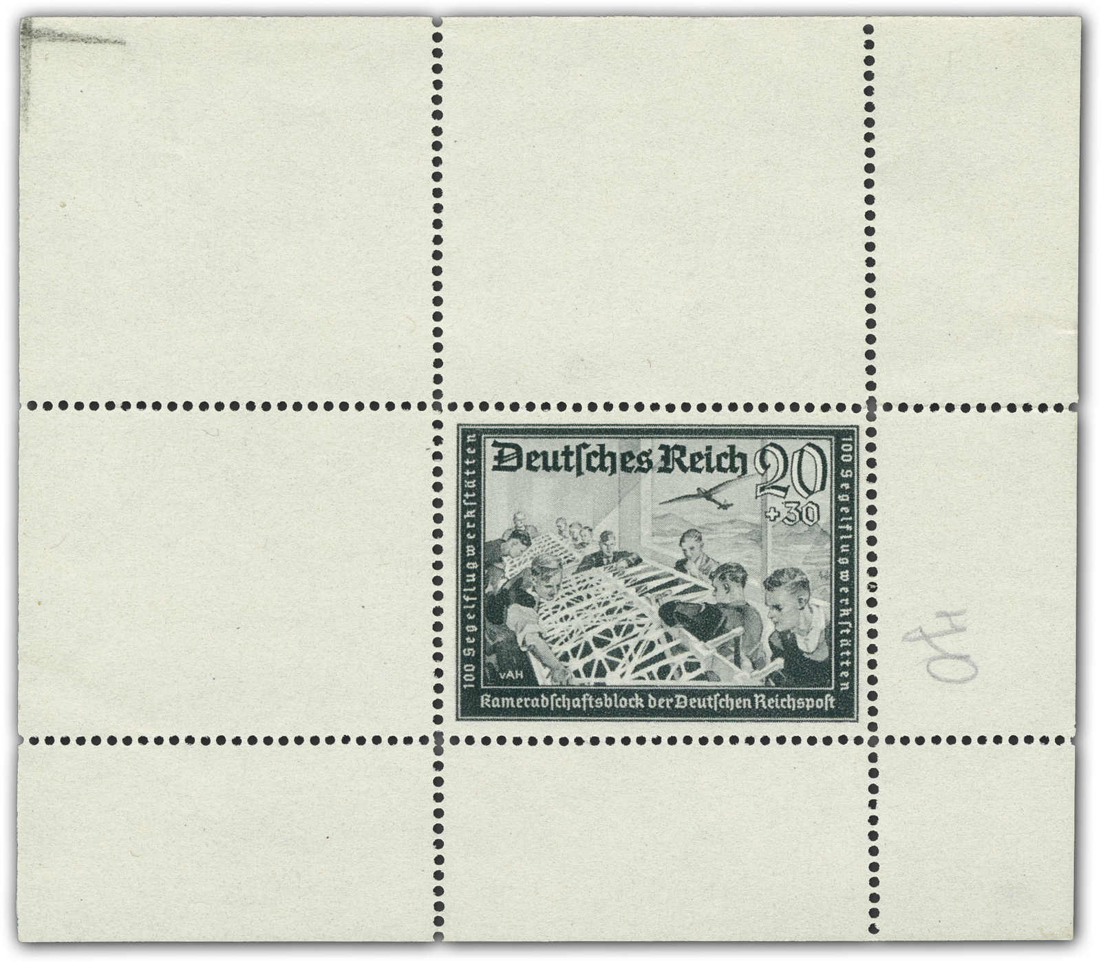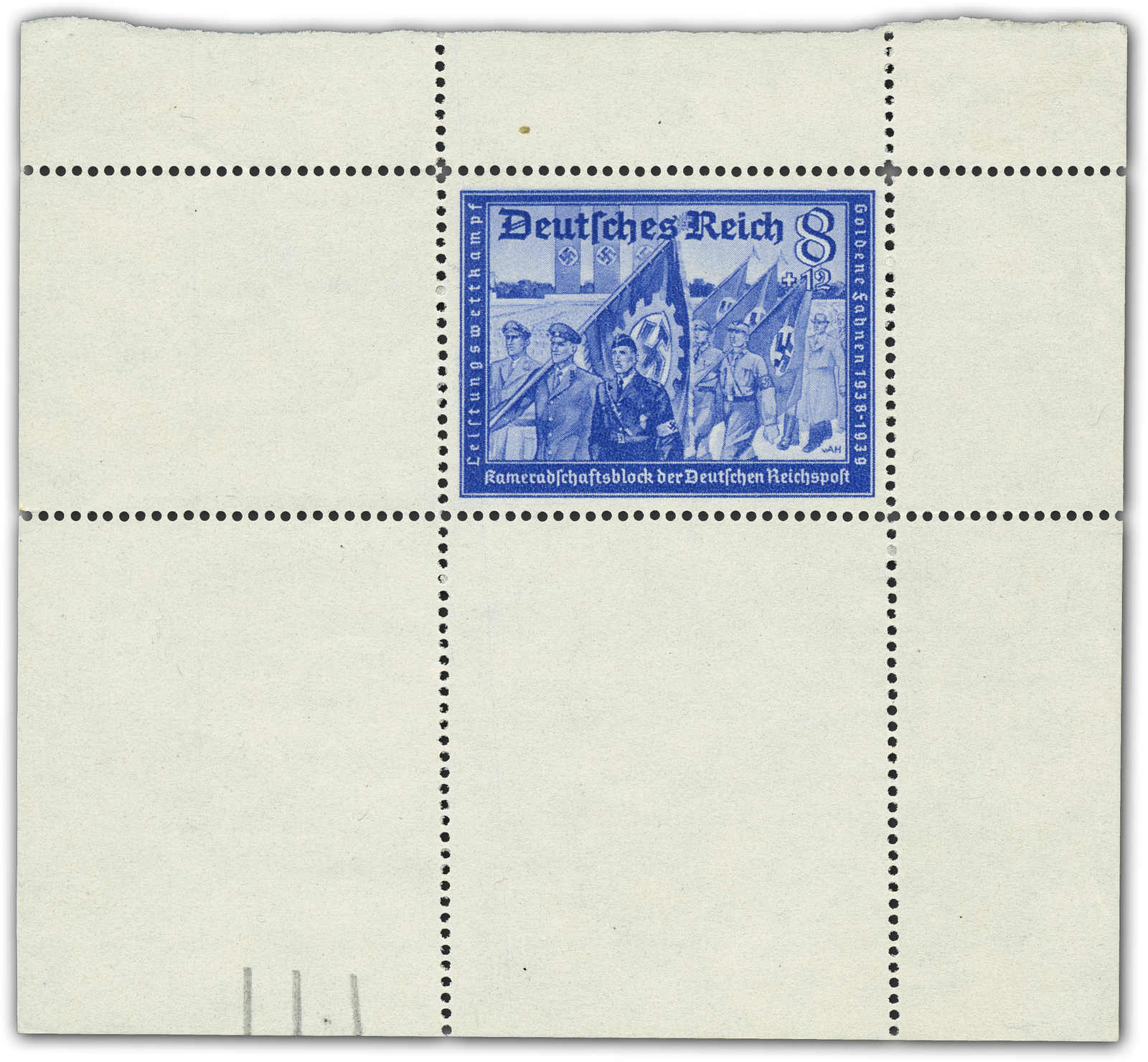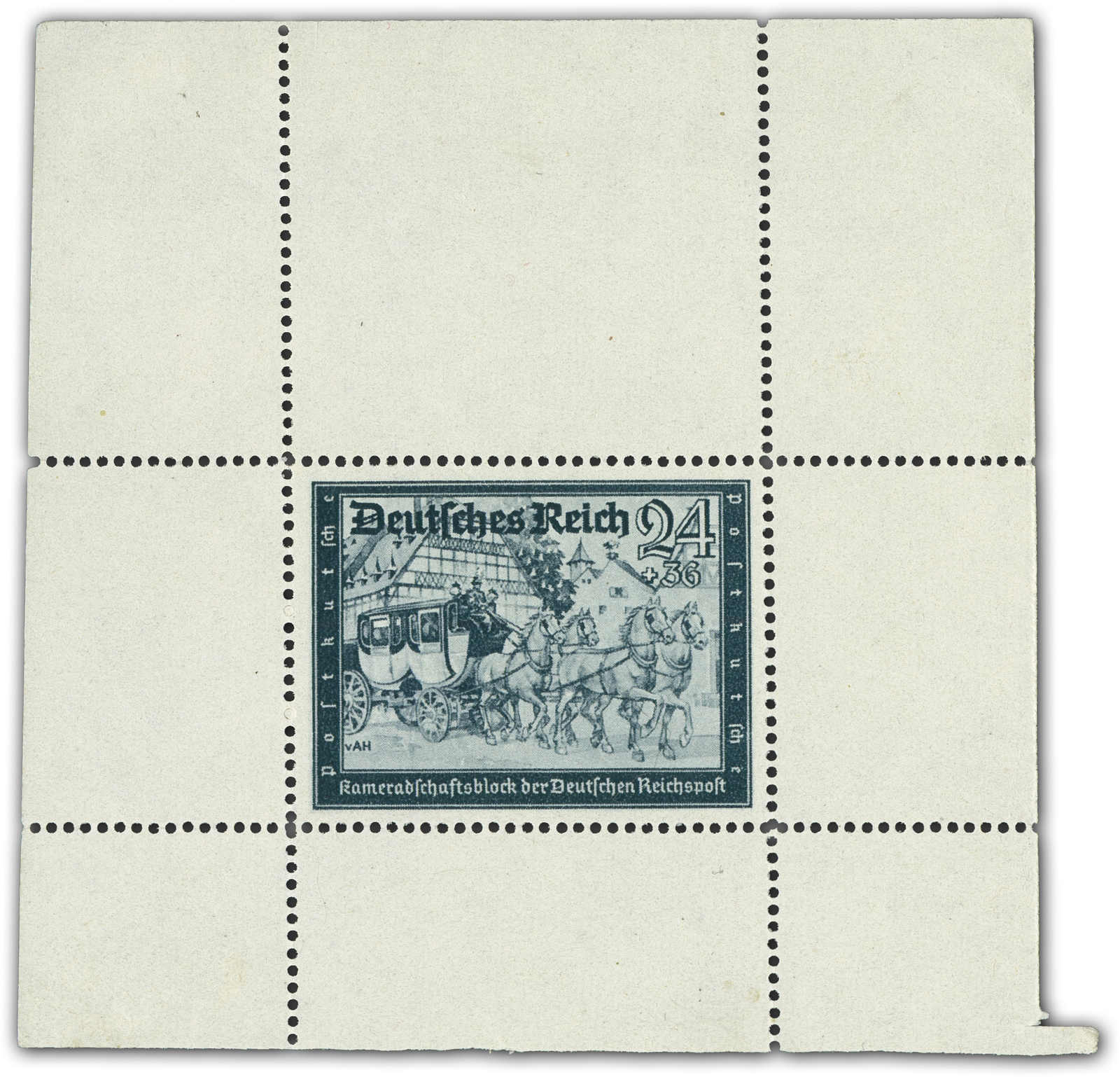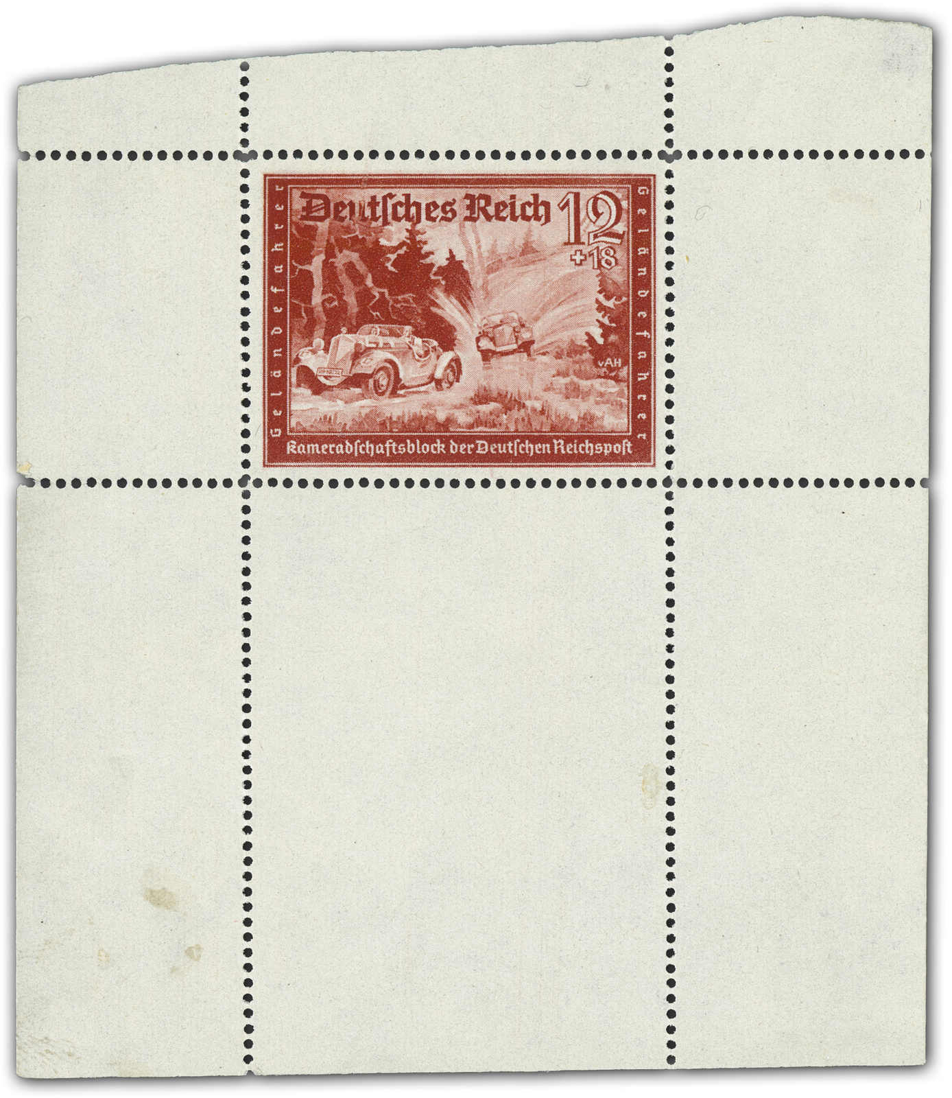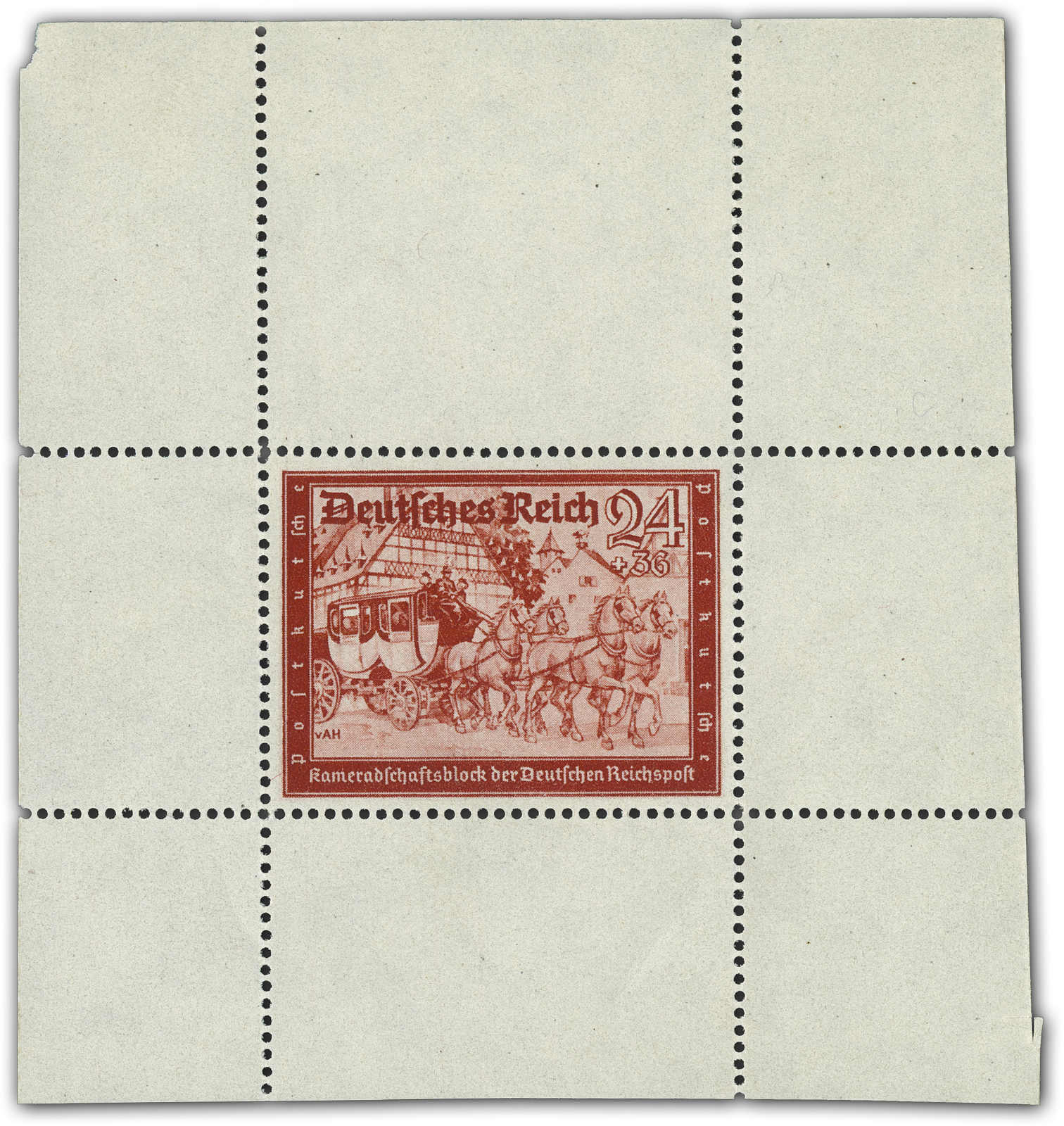 1939 COMRADESHIP OF THE GERMAN REICHSPOST Single print of the 25+15 (Rpf) value on a complete print sheet as it was used in the Vienna Staatsdruckerei. On all sides “hand“ perforation. Here a black green shade was taken for the print.