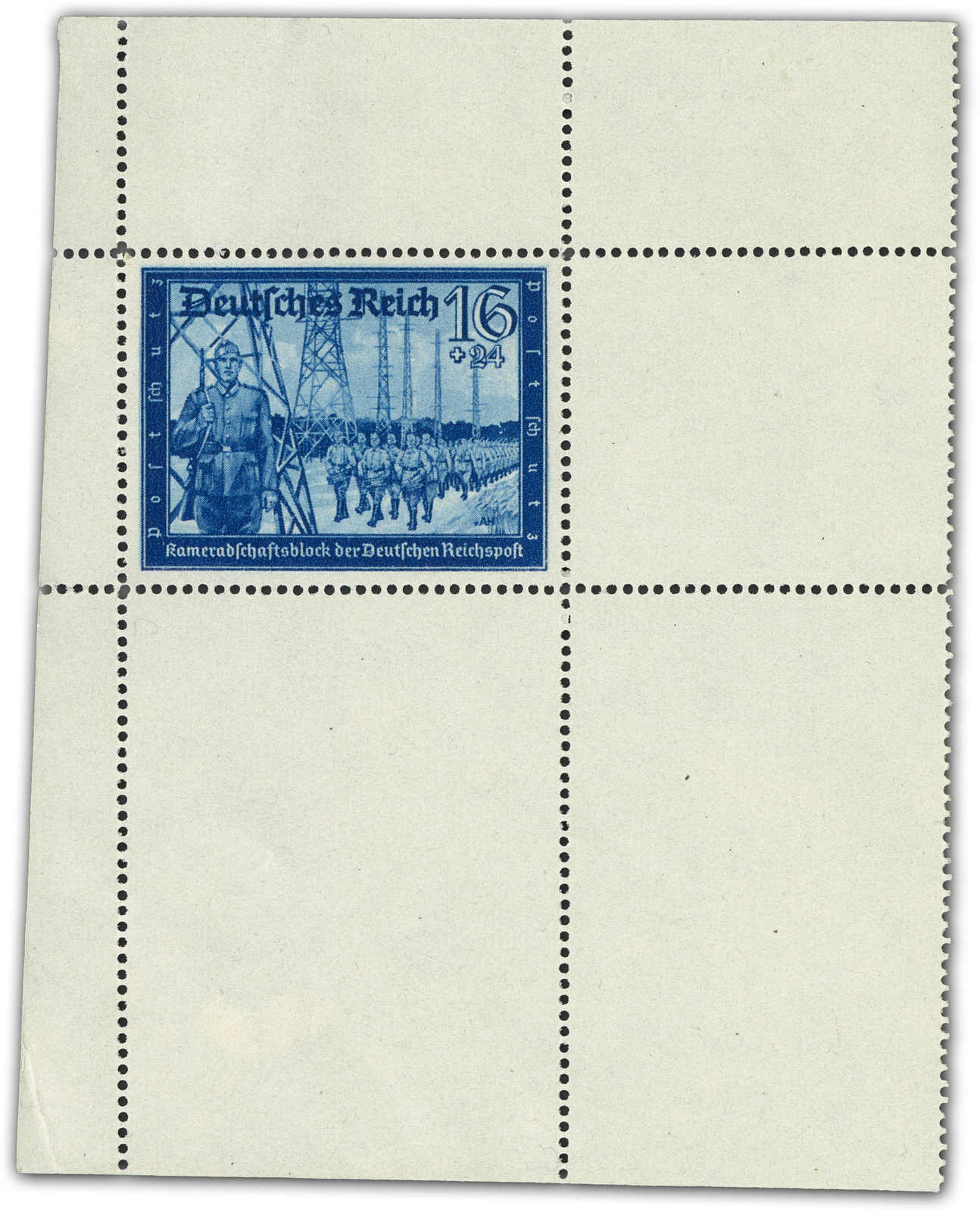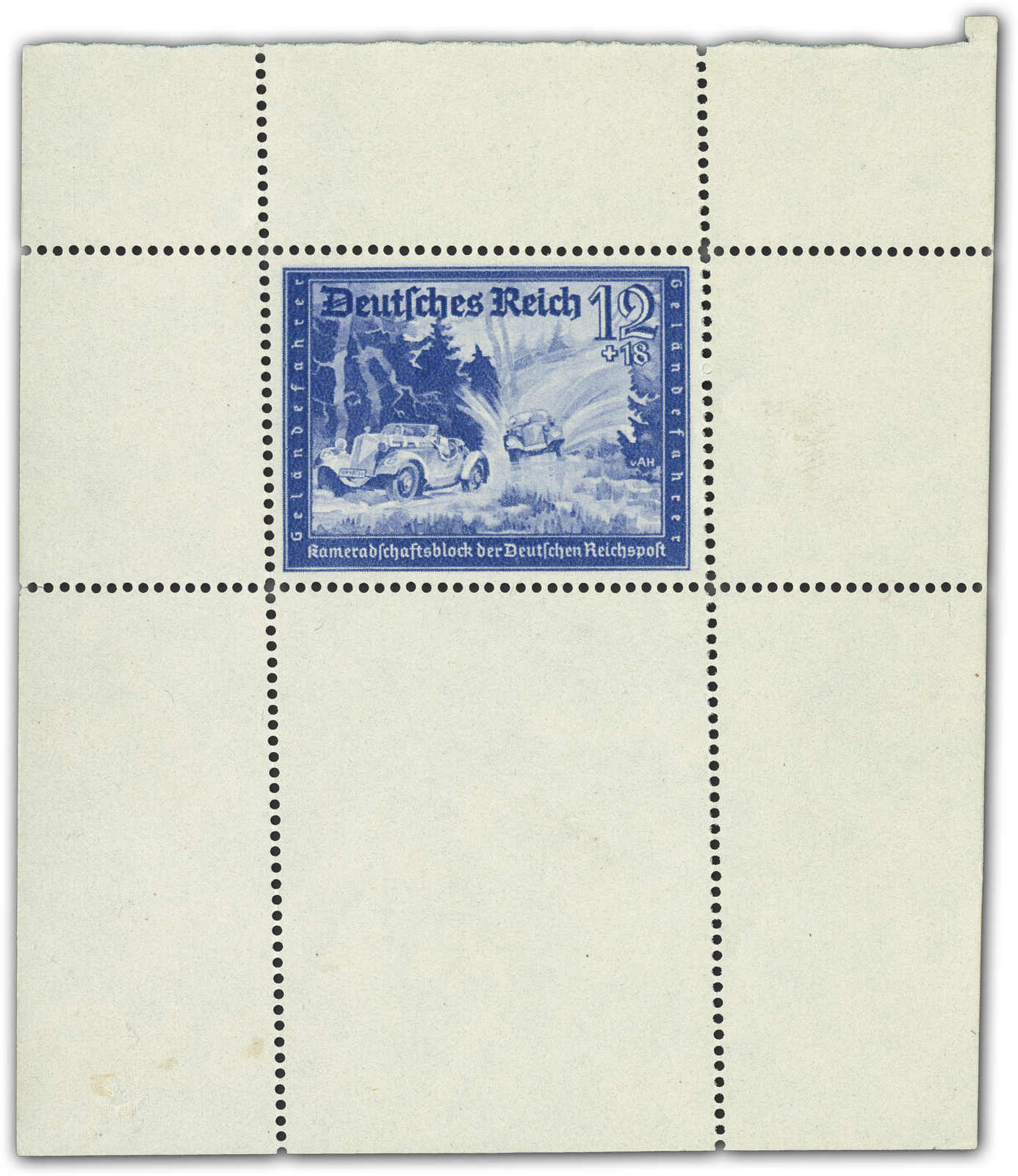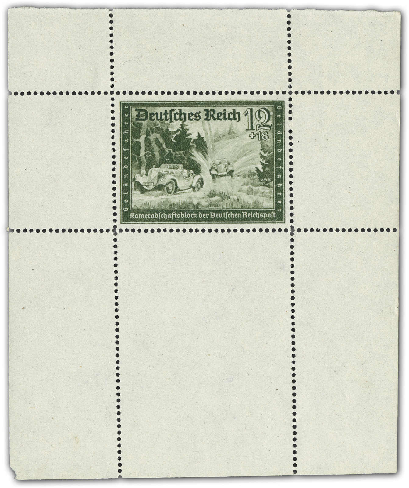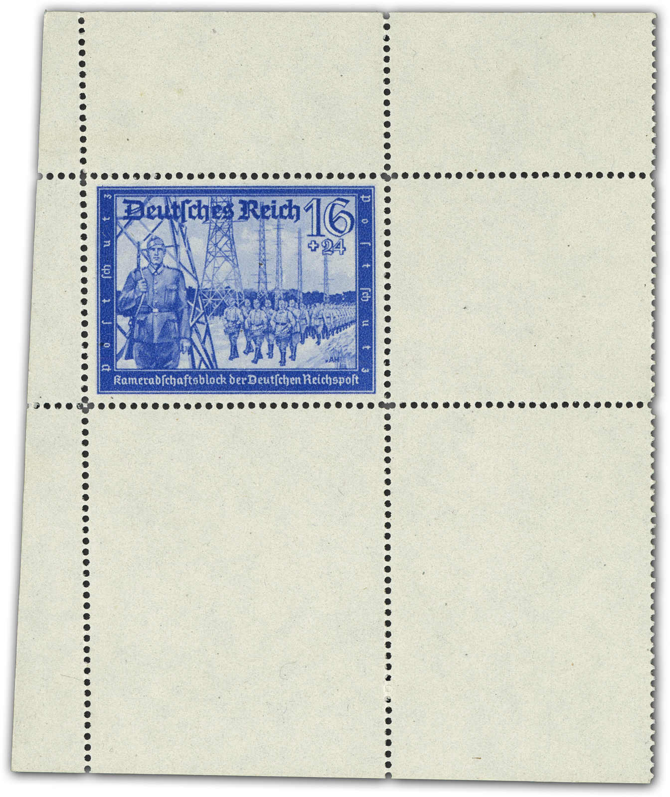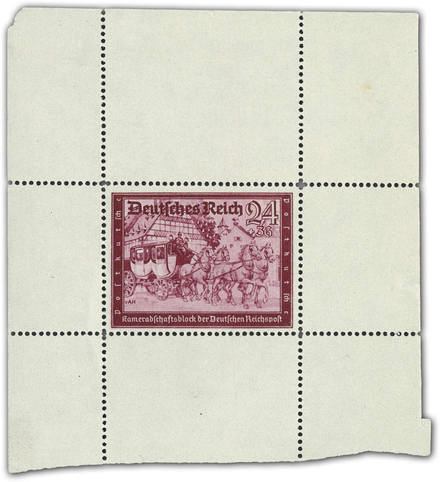 1939 COMRADESHIP OF THE GERMAN REICHSPOST Single print of the 25+15 (Rpf) value on a complete print sheet as it was used in the Vienna Staatsdruckerei. On all sides “hand“ perforation. Here a black green shade was taken for the print.