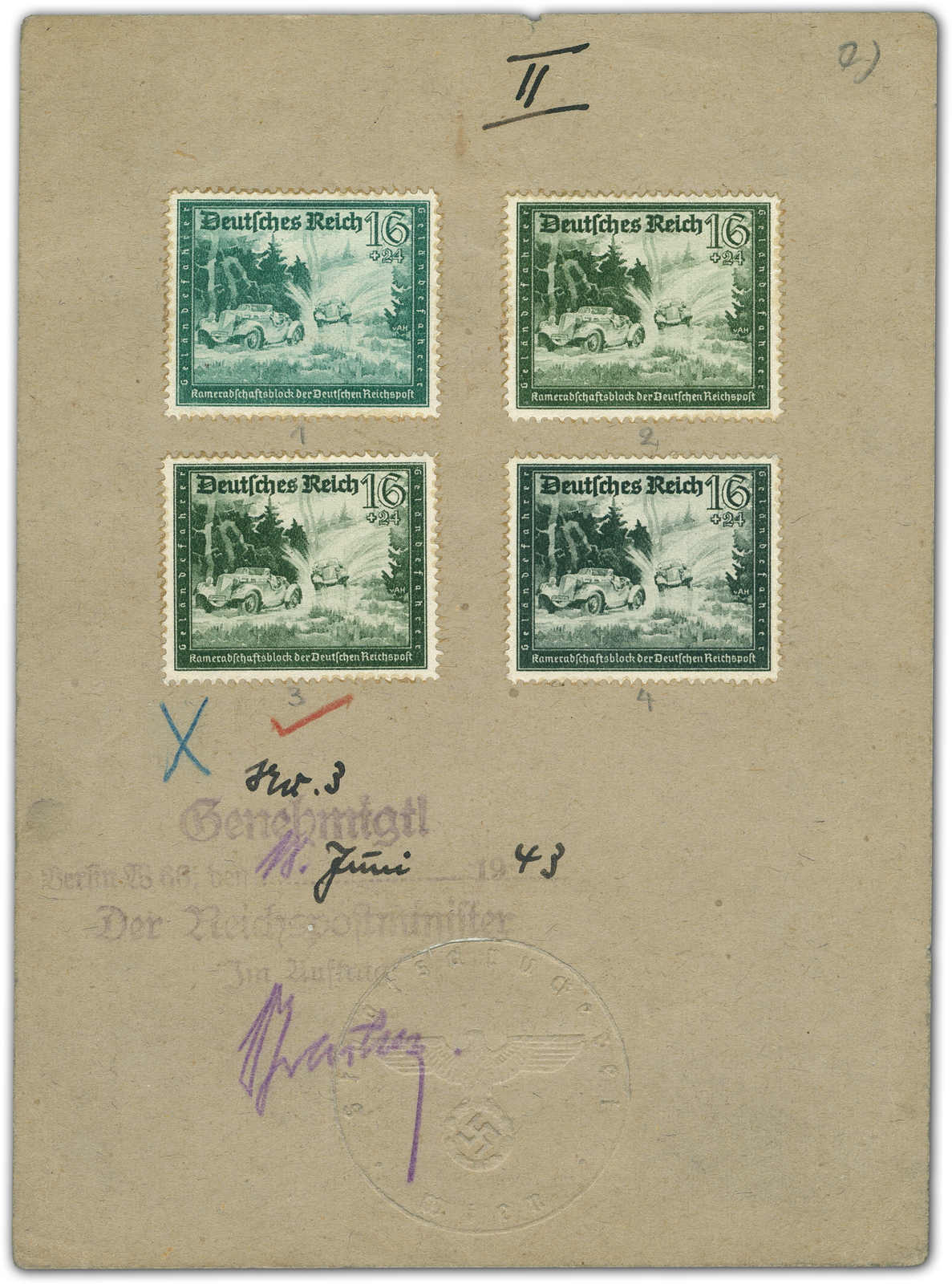„3“. Handwritten dating „18. Juni 43“. The four stamps on this presentation carton did NOT appear in this size. It was later decided to print the 1944 set of six stamps in a smaller size. (Image)