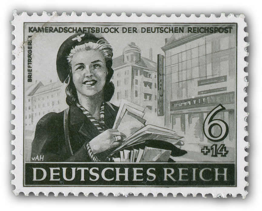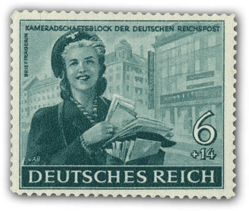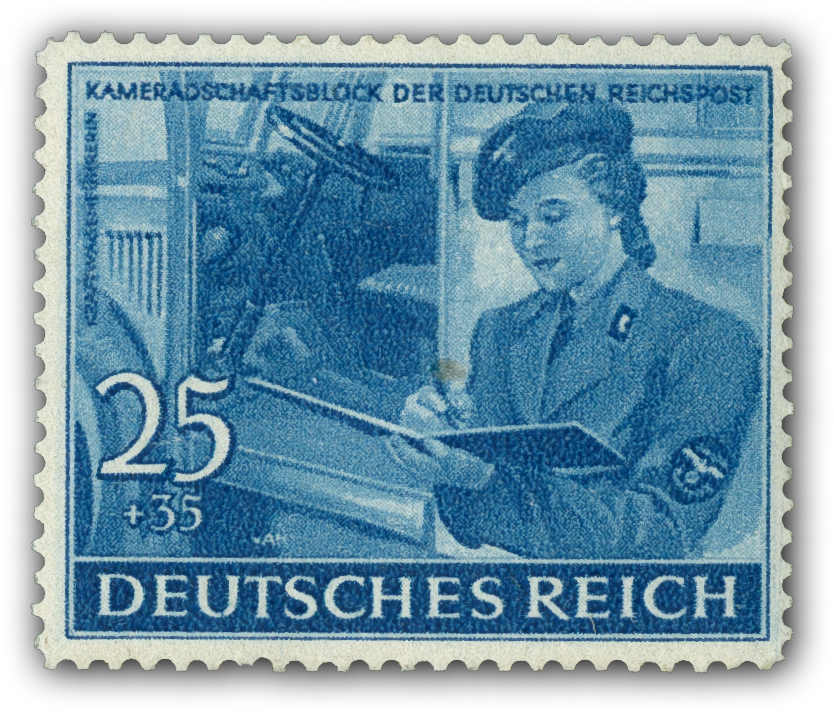 COMRADESHIP OF THE GERMAN REICHSPOST 1944 The 1944 issued last set depicting the „Comradeship of the German Reichspost“ was planned for the year of 1943. Four single prints of the 16+24 (Rpf) value as „colour presentation“ in different