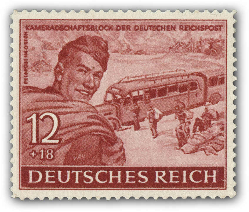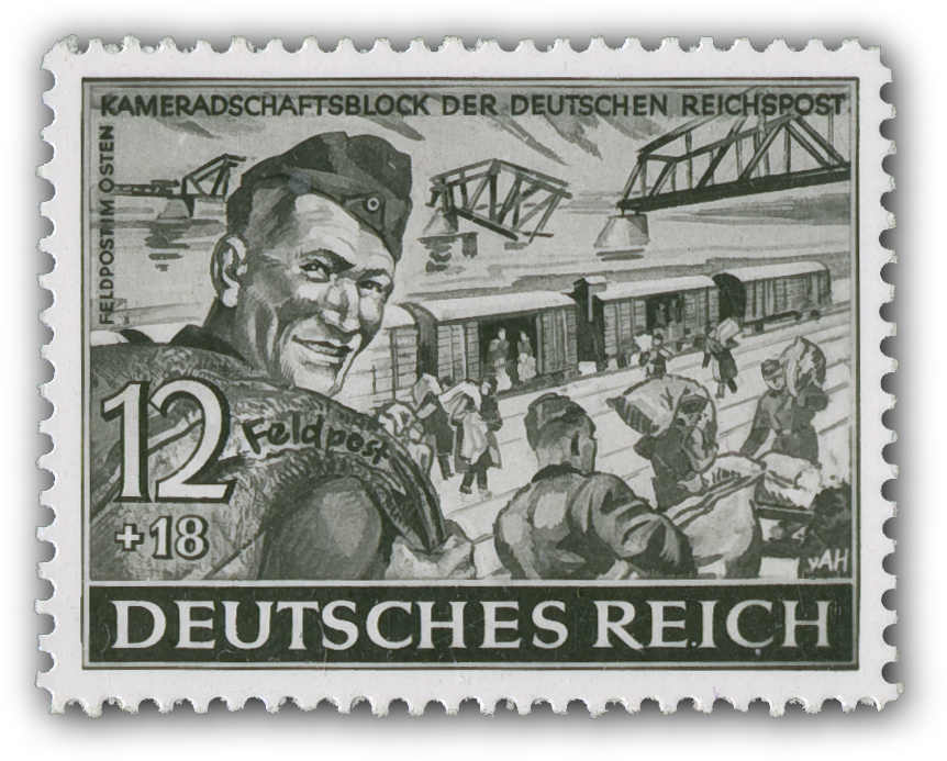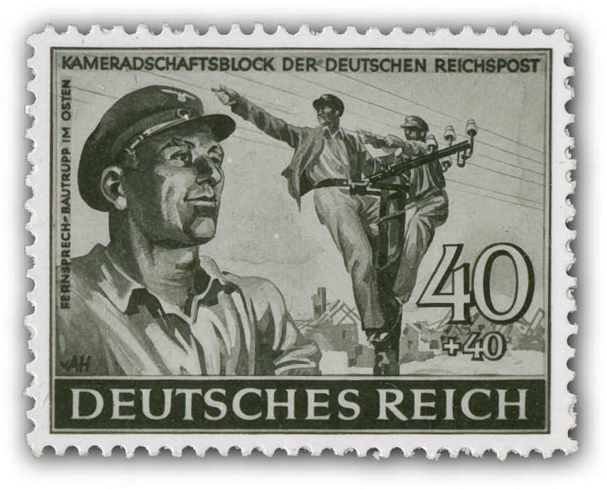 COMRADESHIP OF THE GERMAN REICHSPOST 1944 Photo essay based on the first draft of Axster-Heudtlass for the 12+18 (Rpf) stamp. The motif depicts a demolished bridge in the background. For this reason the design was rejected by the Ministry