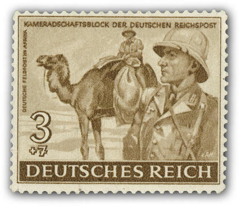 COMRADESHIP OF THE GERMAN REICHSPOST 1944 Single print of a draft for a 3+7 (Rpf) value. The presentation of a member of the fieldpost in a tropics uniform in front of a mounted camel was rejected as inappropiate. (Image)