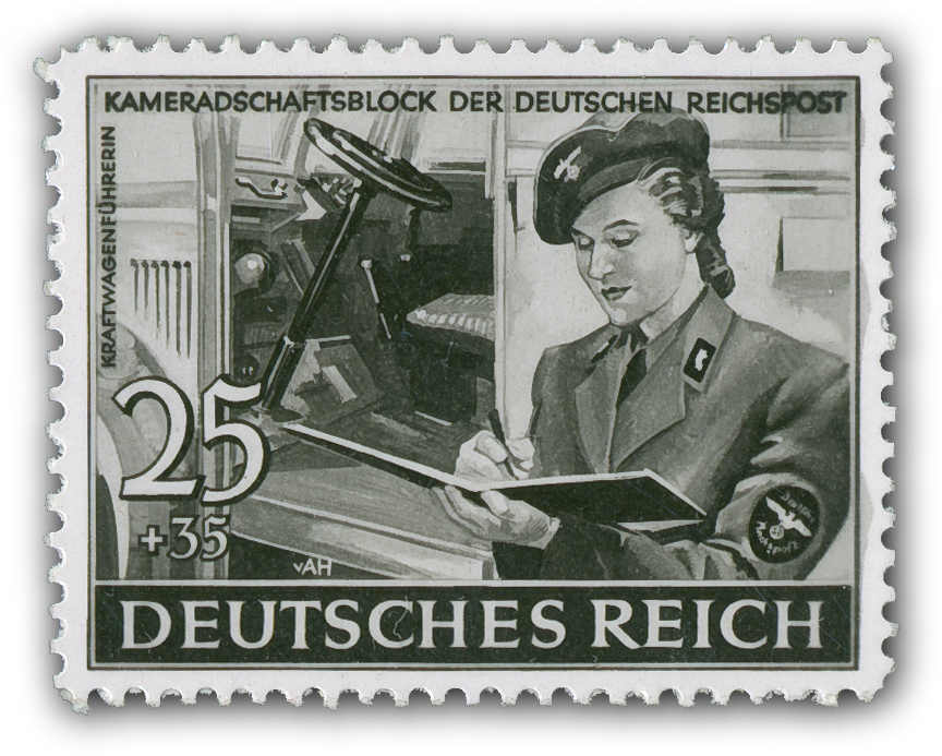COMRADESHIP OF THE GERMAN REICHSPOST 1944 Single print for a 25+35 (Rpf) value. This motif was not used. It depicts a postwoman in front of the open door of a post vehicle.The print was executed in a blue shade (Image)