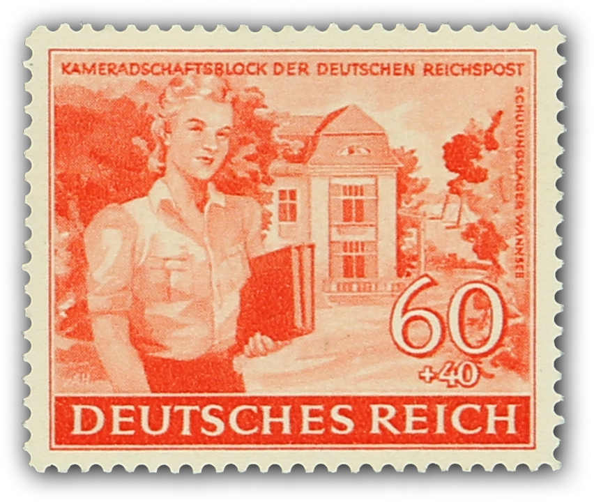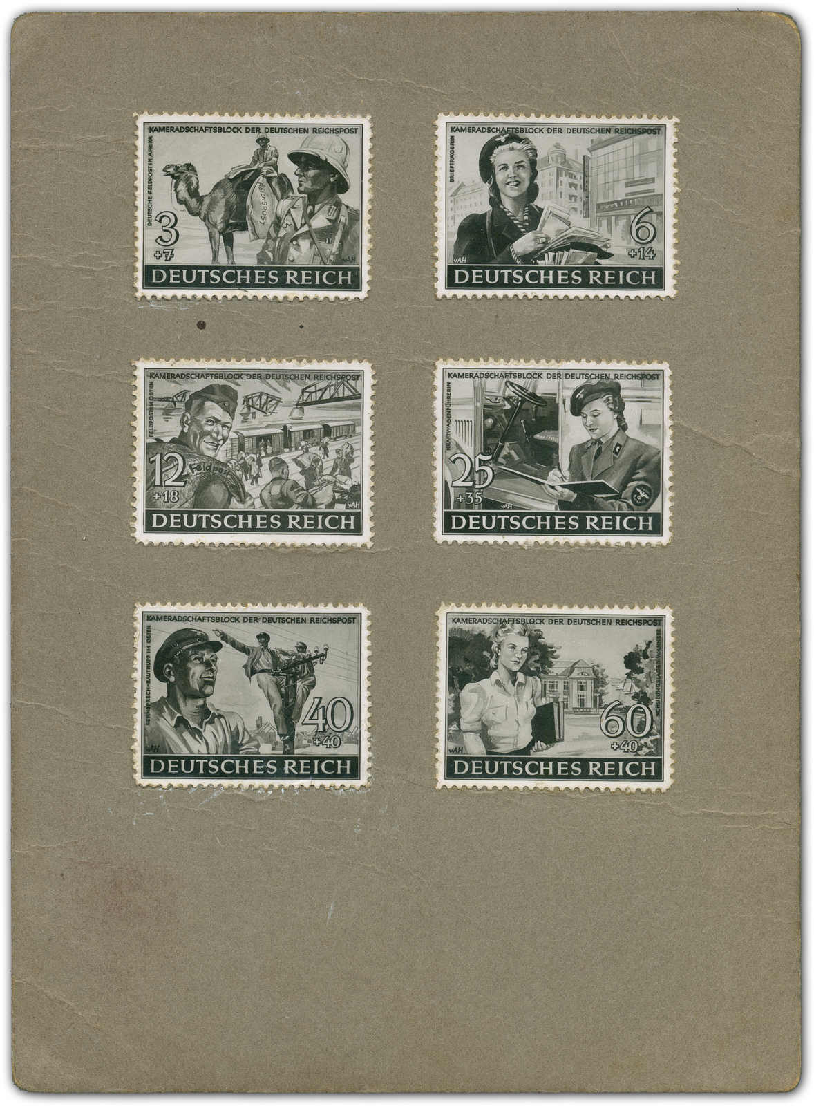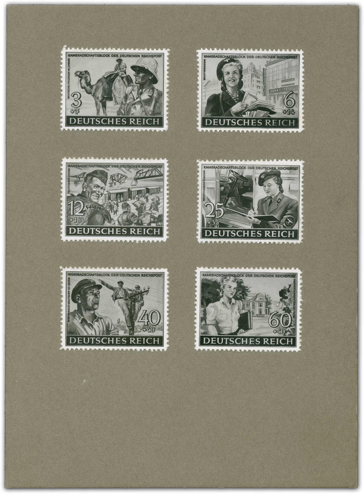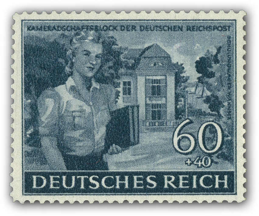COMRADESHIP OF THE GERMAN REICHSPOST 1944 Single prints of seven motifs as a „set“ in different colours, e.g. 3+7, 6+14, 12+18 (two different motifs), 25+35, 40+40 and 60+40 (Rpf.). Only two „designs“ (6+14 and 12+18 Rpf) were accepted. (Image) (imagea)
