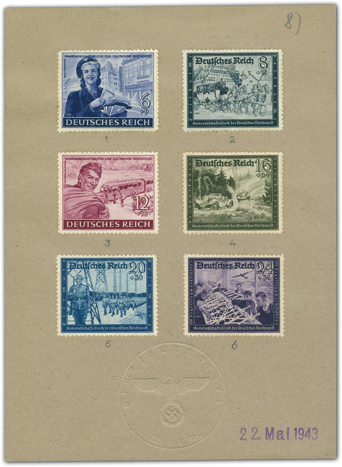 embossed seal. Beneath the copies the consecutive numbering from 1 to 6. At bottom right the dateline stamp 22. Mai 1943. Only two of these presentation cartons exist. This one numbered 1-6 and the one offered in the next lot, numbered 7-12. (Image)