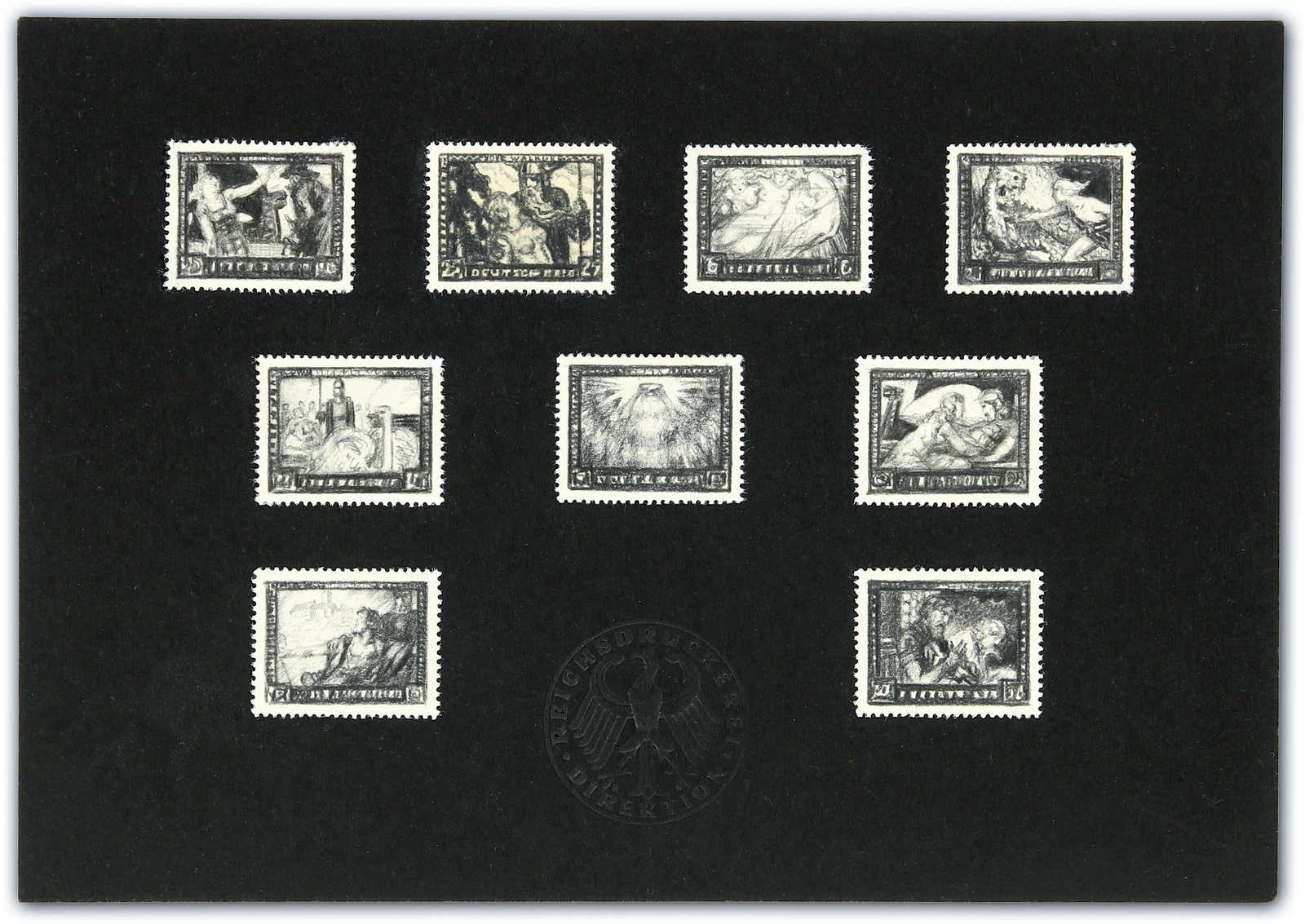 This item is historically the most important artist`s designs oft he 1933-1945 era. It shows motifs oft he first nine commemorative stamps oft he Third Reich. Important facts: all motifs were designed by Alois Kolb, one oft he most