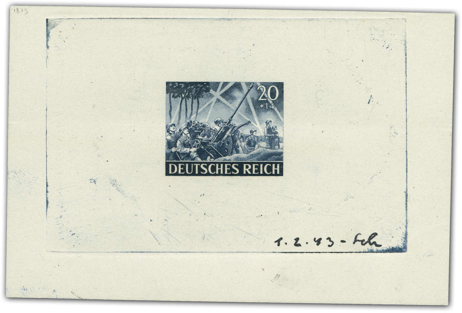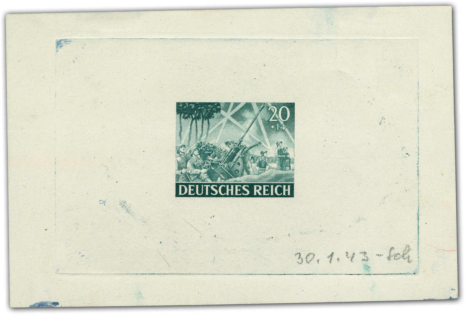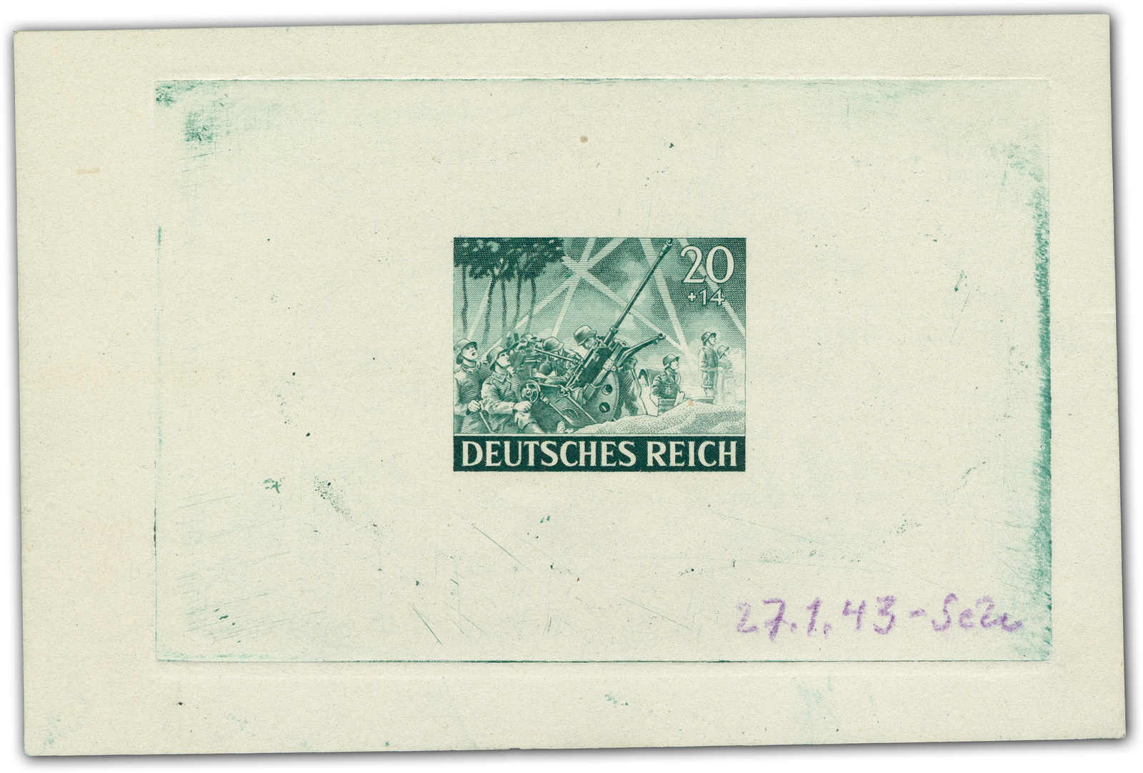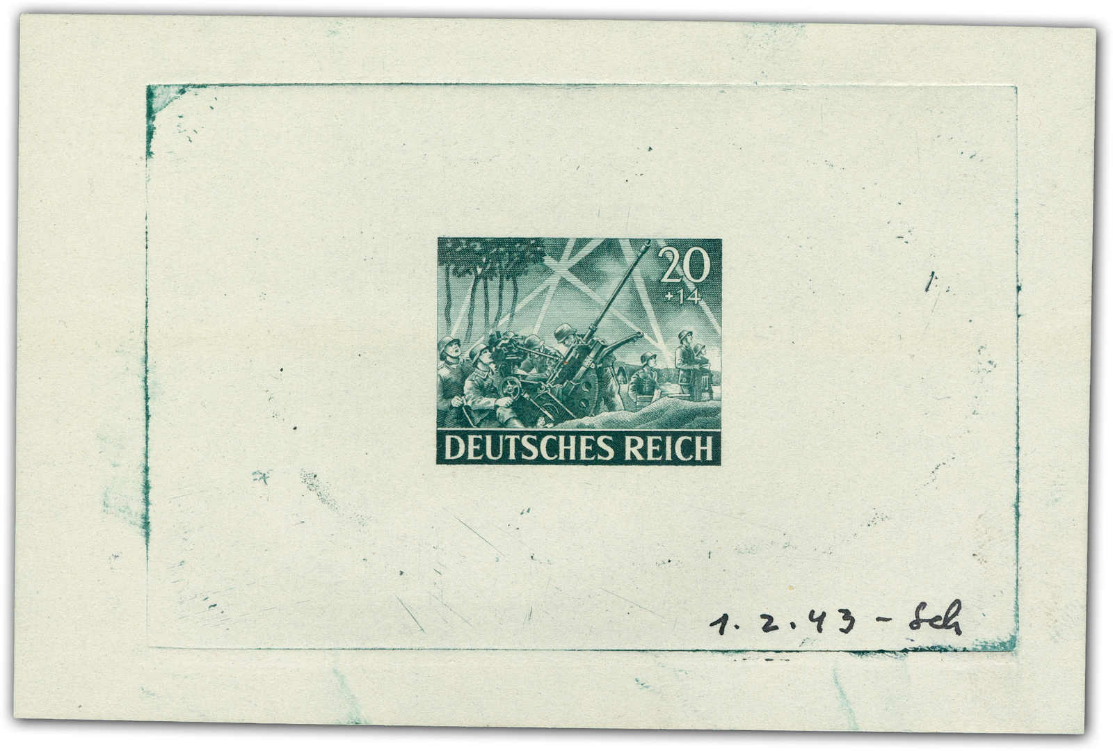 Motif „artillery“ Print taken from the original die on a perforated mini sheet. Datelined by the printer “4.2.43“ at the bottom with short signature “Z“.
