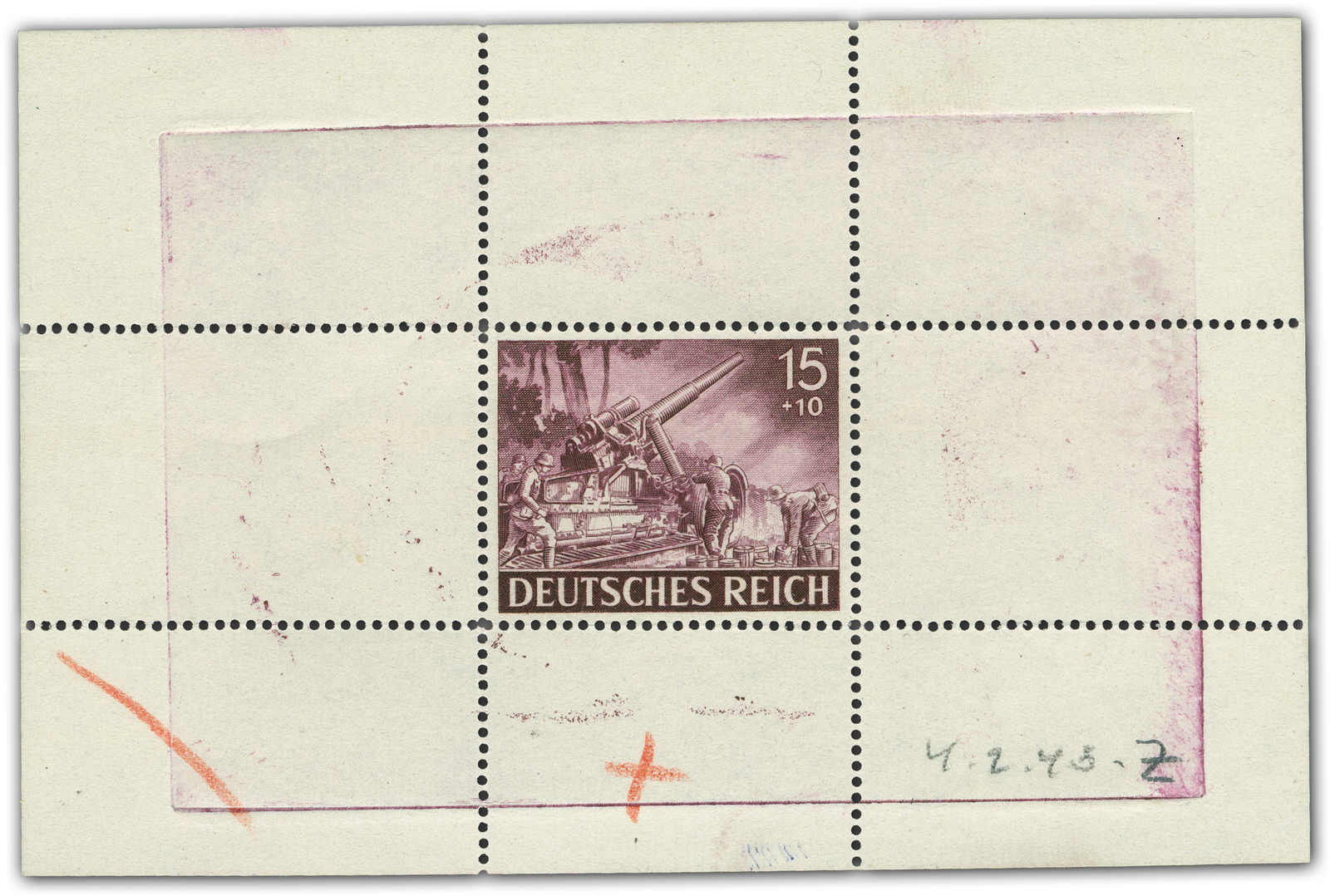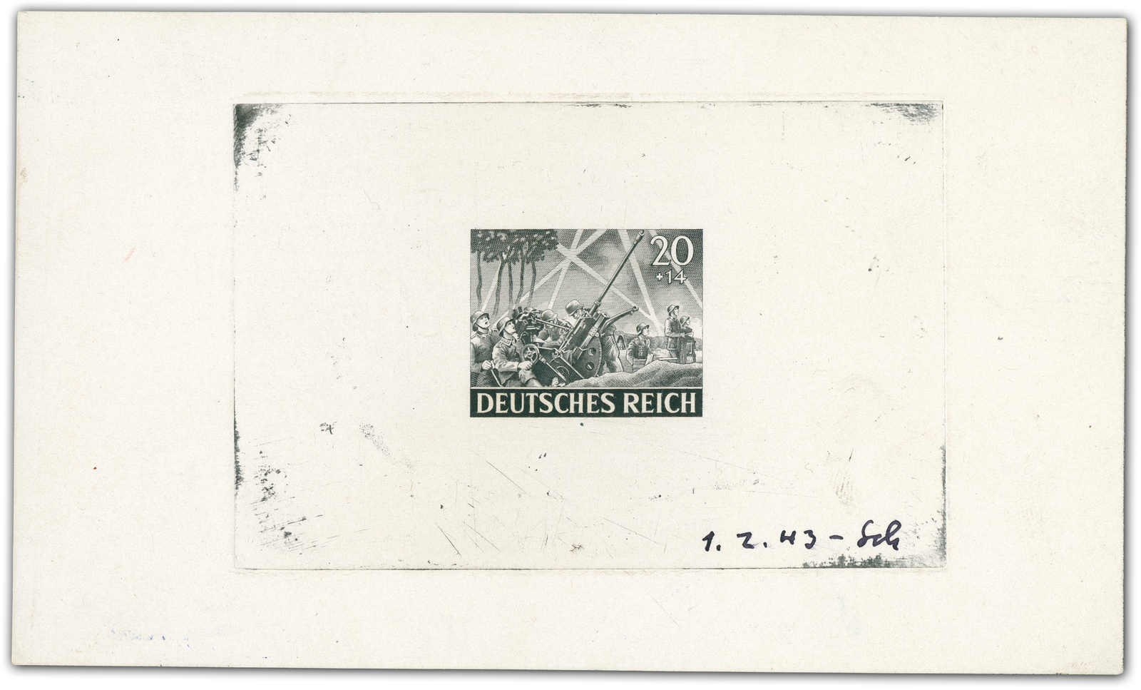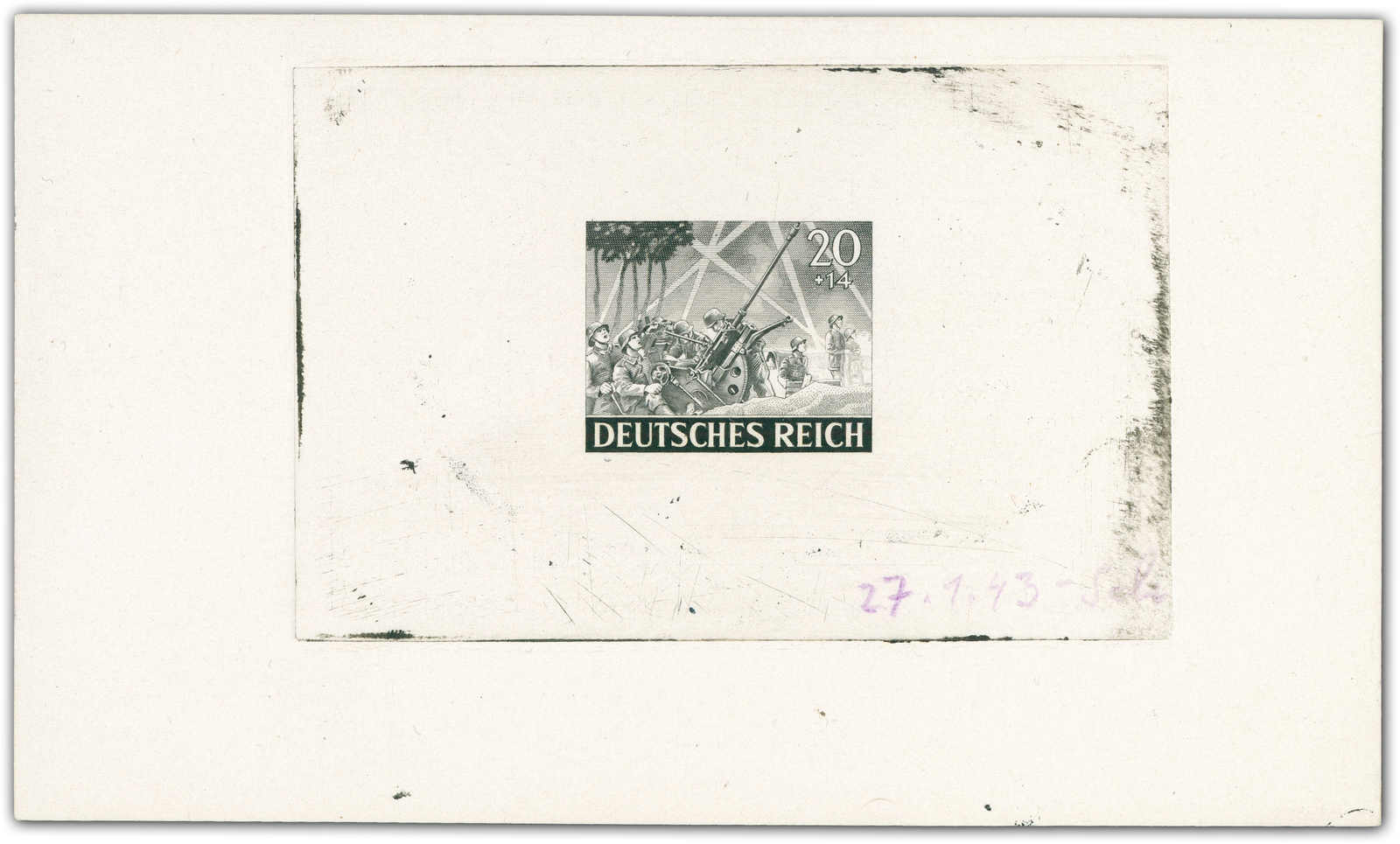 Motif „artillery“ Print taken from the original die on a perforated mini sheet. Datelined by the printer “4.2.43“ at the bottom with short signature “Z“.