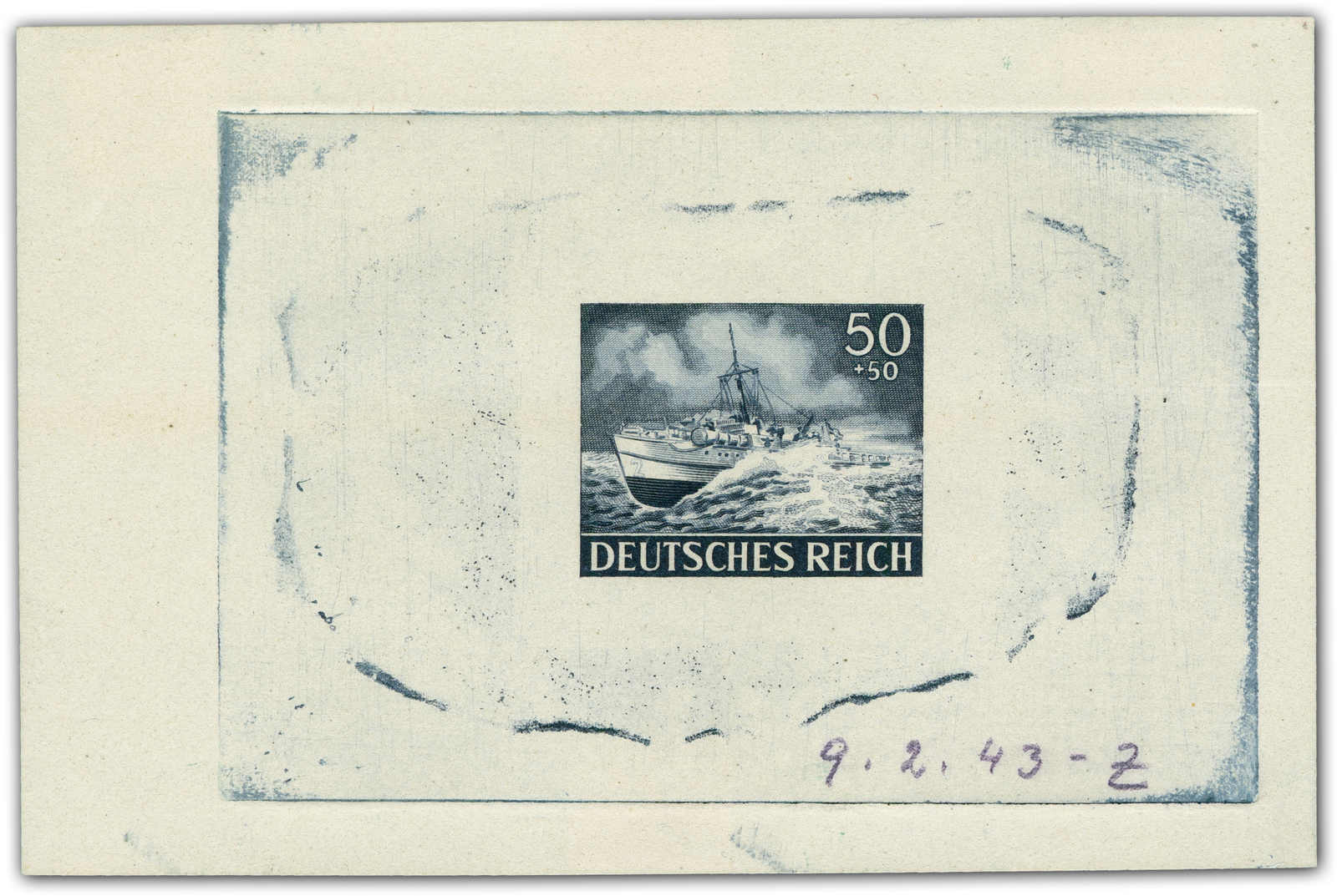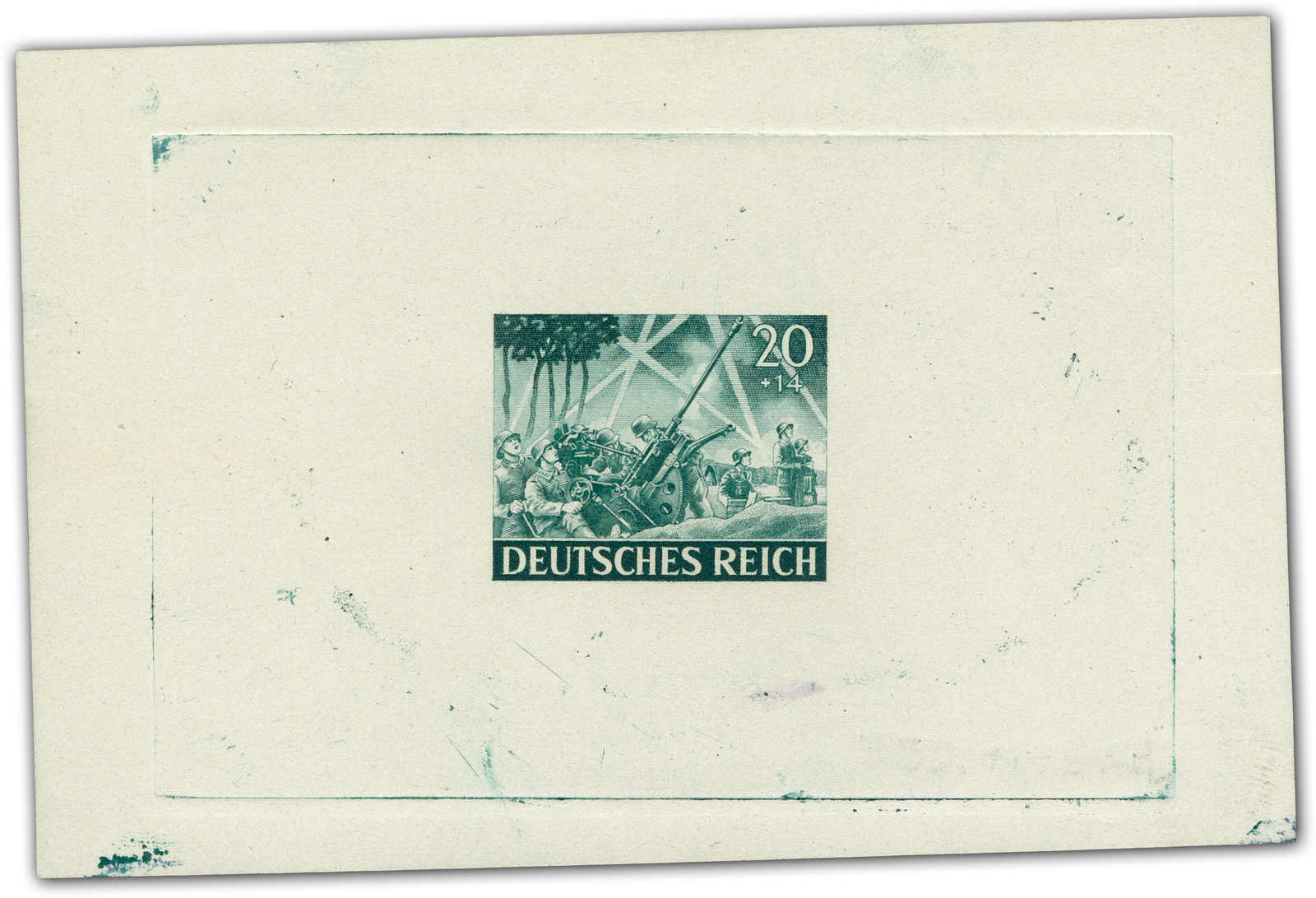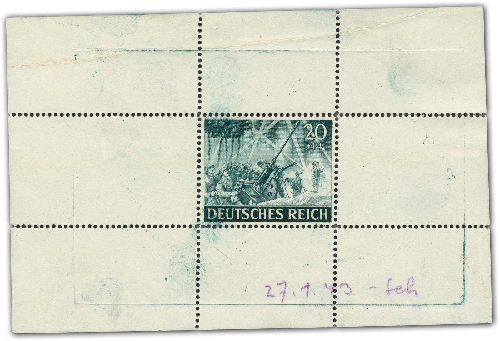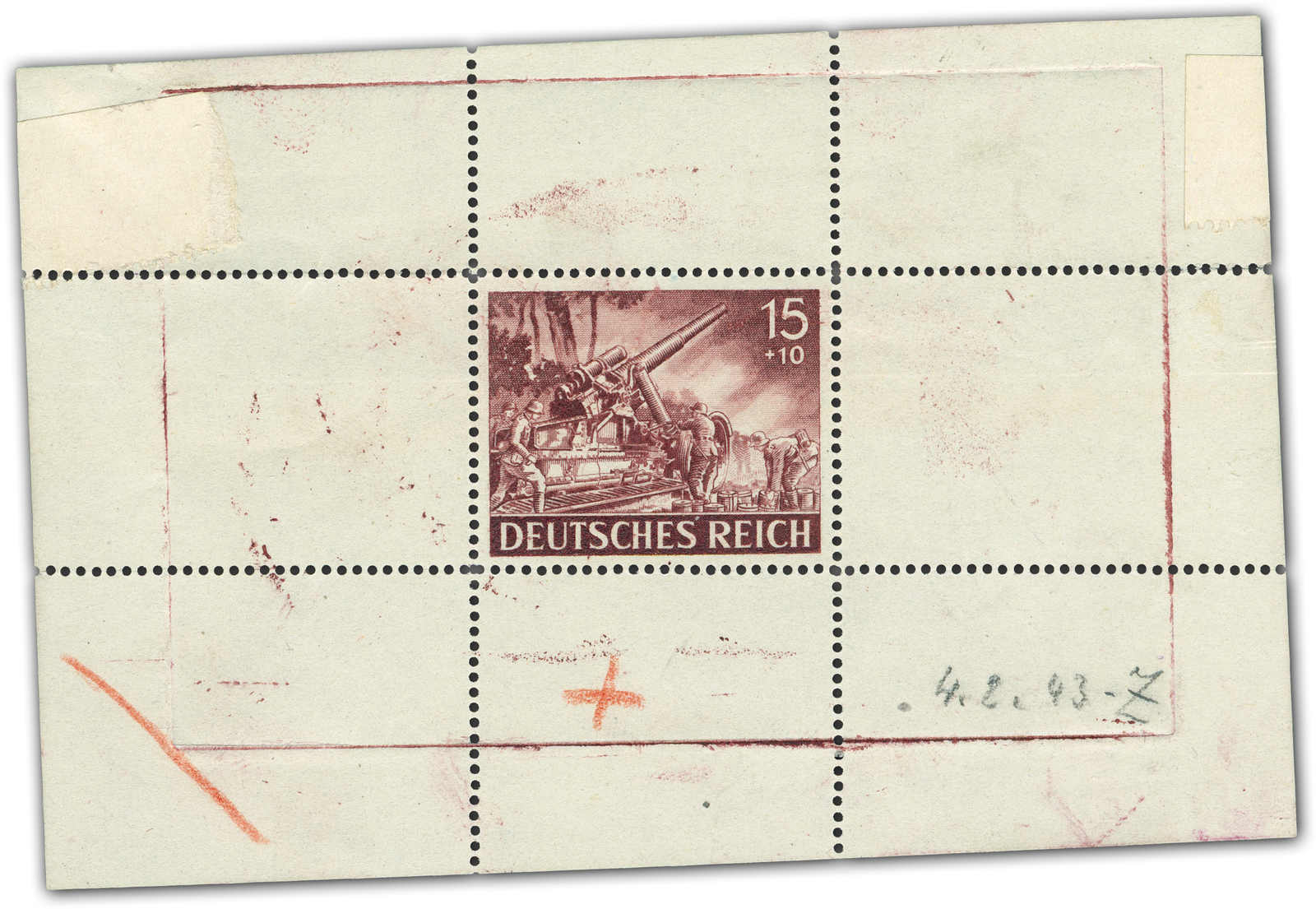 Motif „artillery“ Print taken from the original die on a perforated mini sheet. Datelined by the printer “4.2.43“ at the bottom with short signature “Z“.