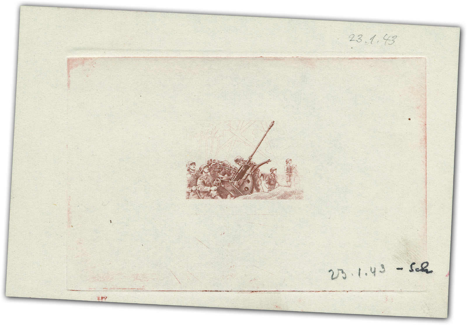 Motif „light anti-aircraft fire“ Phase print taken from the nearly finished original die. Datelined at the bottom by the printer “30.1.43“ and short signature “Sch“. (Image)